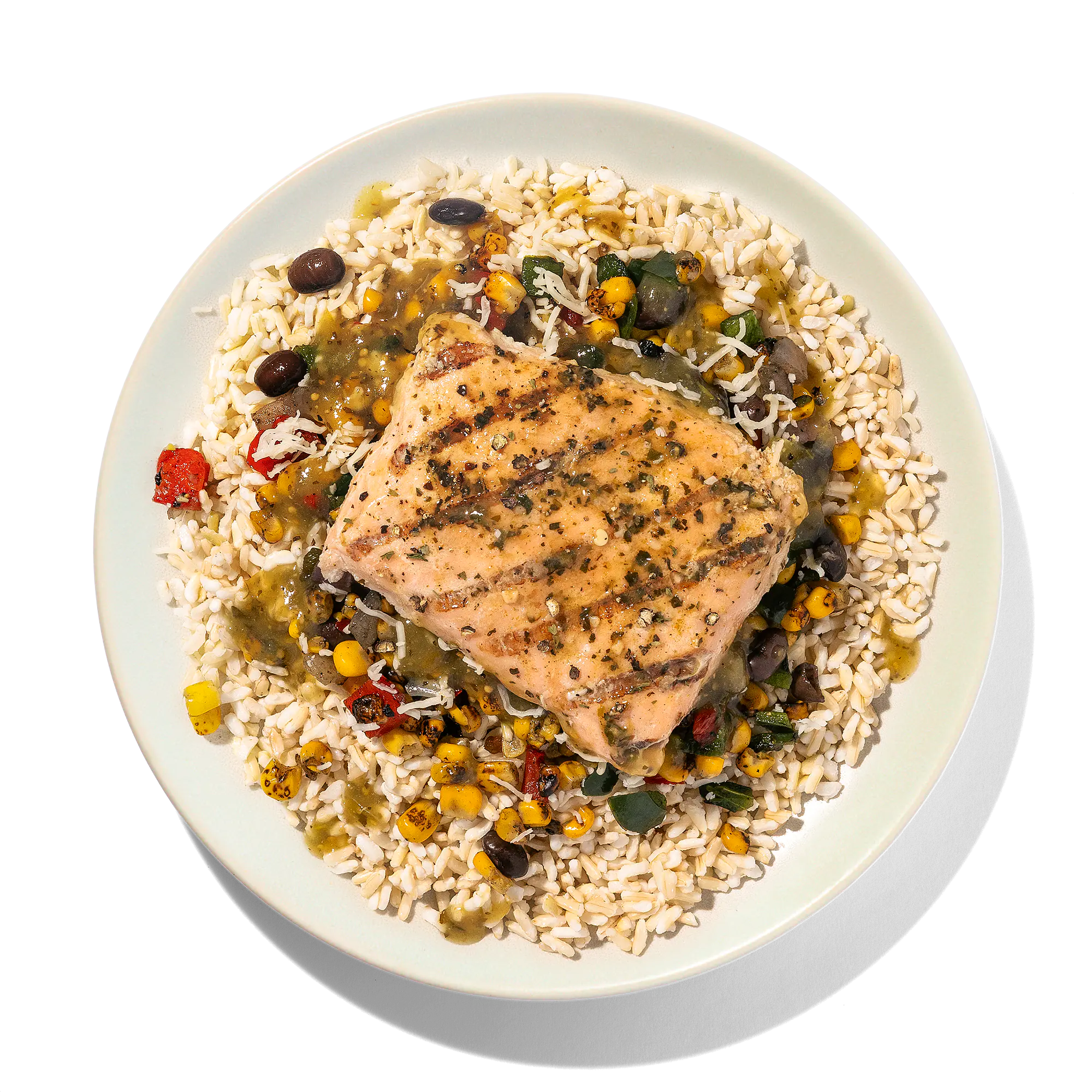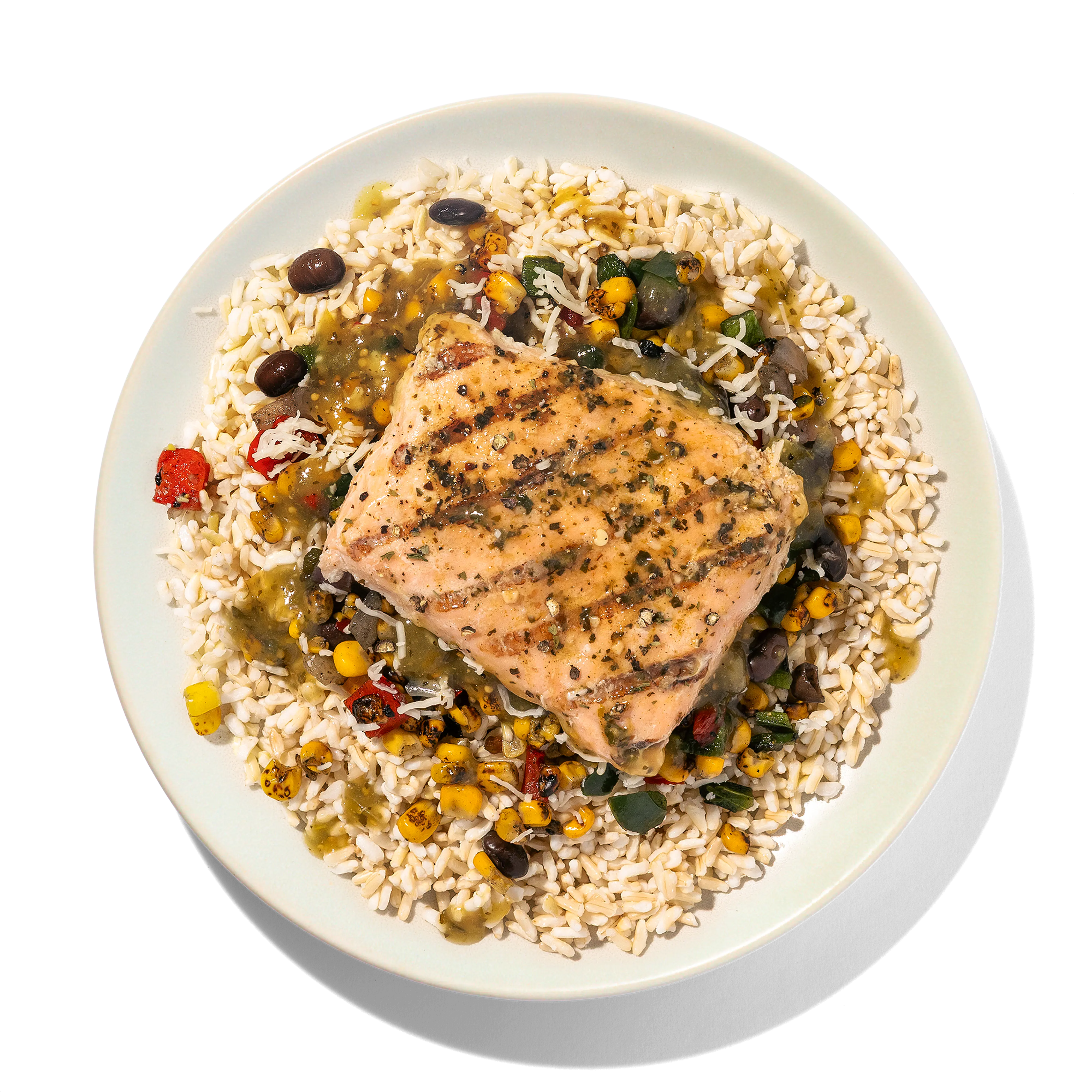 Cooked Brown Rice (Water, Brown Rice), Fire Roasted Southwest Style Corn Blend (Corn, Red Bell Peppers, Poblano Peppers, Red Onions, Black Beans), Grilled Fully Cooked Salmon (Pink And/or Keta Salmon, Water, Contains 2% Or Less Of: Sea Salt, Sugar, Sodium Phosphates, Dehydrated Garlic And Onion, Spices, Paprika, Xanthan Gum, Natural Flavors, Spice Extractives), Shredded Monterey Jack Cheese (Pasteurized Milk, Cheese Culture, Salt, Microbial Enzymes, Potato Starch, Corn Starch, Powdered Cellulose), Tomatillo Sauce (Ground Tomatillo [green Tomatillos, Salt, Citric Acid], Water, Jalapeno Pepper, Modified Food Starch, Cilantro, Green Onion, Chicken Base [chicken Meat Including Natural Chicken Juices, Sea Salt, Chicken Fat, Vegetable Extract {potato, Carrot, Onion}, Yeast Extract, Natural Flavors, Turmeric], Salt, Dehydrated Garlic, Dehydrated Onion, Spices).
