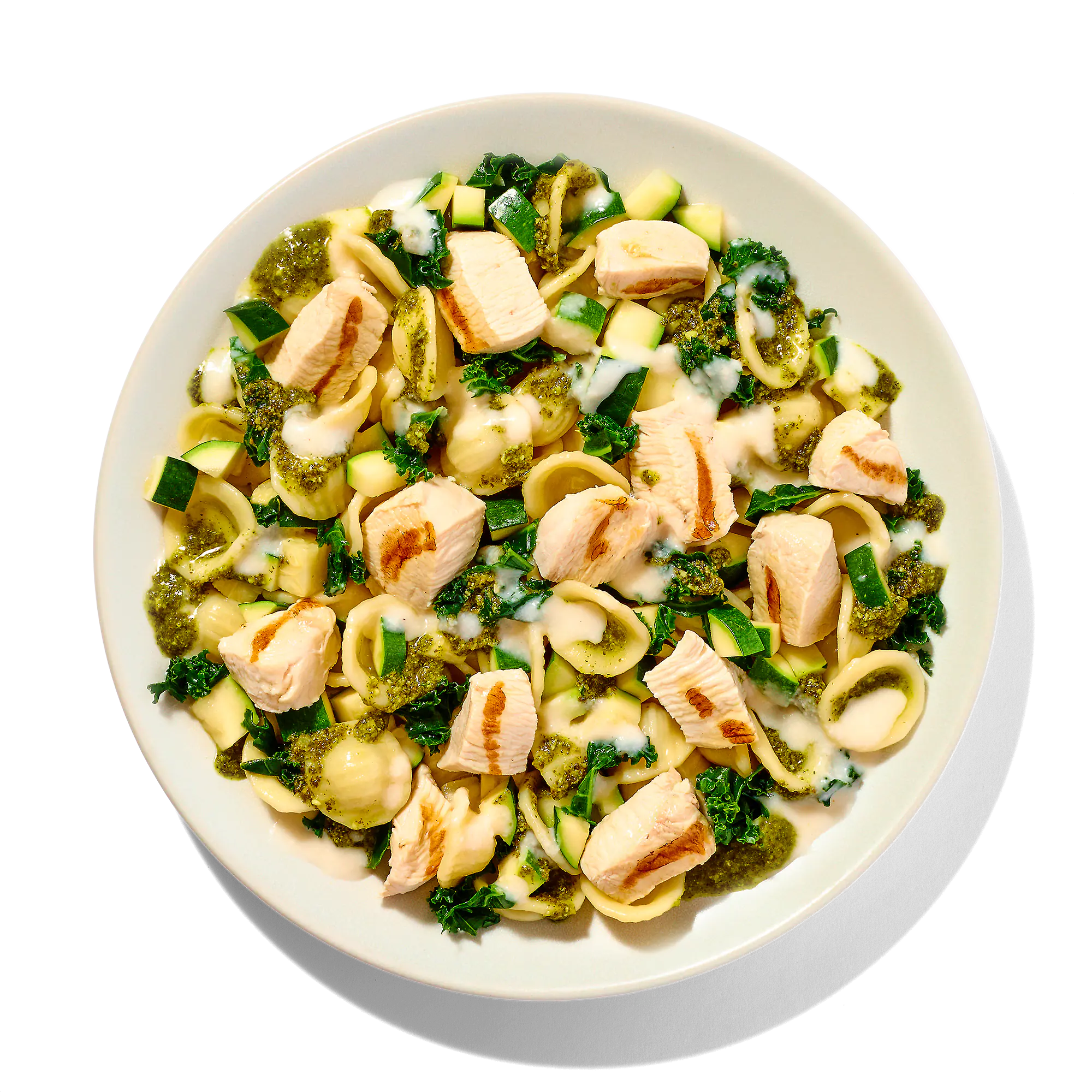 Cooked Enriched Orecchiette Pasta (Water, Semolina [Wheat], Niacin, Iron [Ferrous Sulfate], Thiamine Mononitrate, Riboflavin, Folic Acid), Diced Chicken Breast Meat With Rib Meat (Skinless Boneless Chicken Breast Meat With Rib Meat, Water, Potato Starch, Vinegar, Sea Salt), Zucchini, Alfredo Sauce (Water, Whole Milk, Heavy Cream, Parmesan And Granular Cheese [Pasteurized Milk, Cheese Cultures, Salt, Enzymes], Olive Oil, Food Starch - Modified, Salt, Garlic, Sodium Caseinate, Spices, Citric Acid, Lactic Acid), Basil Pesto With Lemon (Basil, Avocado Oil, Water, Parmesan Cheese [Pasteurized Part-skim Cows’ Milk, Cheese Cultures, Salt, Enzymes], Garlic, Lemon Juice, Salt, Onion Powder), Kale, Shaved Parmesan Cheese (Parmesan Cheese [Pasteurized Part-skim Cow's Milk, Cheese Cultures, Salt, Enzymes], Powdered Cellulose [To Prevent Caking]), Crushed Red Peppers.