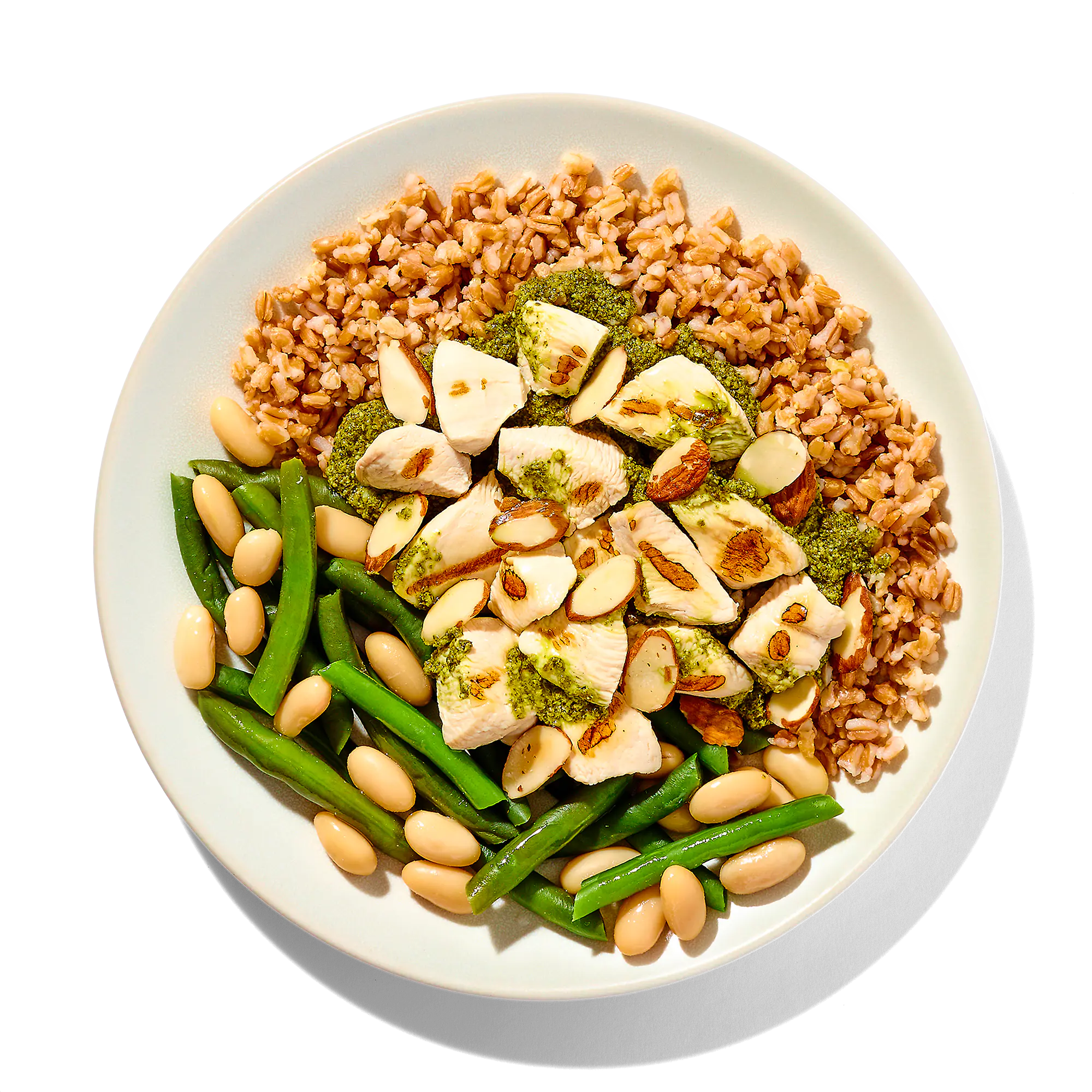 COOKED FARRO (FARRO, WATER), DICED CHICKEN BREAST MEAT WITH RIB MEAT (SKINLESS BONELESS CHICKEN BREAST MEAT WITH RIB MEAT, WATER, POTATO STARCH, VINEGAR, SEA SALT), COOKED WHITE KIDNEY BEANS, GREEN BEANS, AROMATICS (ONIONS, GARLIC, SPICES, OLIVE OIL, WATER, PARSLEY, CONTAINS 2% OR LESS OF BUTTER [SWEET CREAM, LACTIC ACID], SALT, GUAR GUM, XANTHAN GUM, SPICE EXTRACTIVE), BASIL PESTO WITH LEMON (BASIL, AVOCADO OIL, WATER, PARMESAN CHEESE [PASTEURIZED PART-SKIM COWS’ MILK, CHEESE CULTURES, SALT, ENZYMES], GARLIC, LEMON JUICE, SALT, ONION POWDER), ALMONDS.