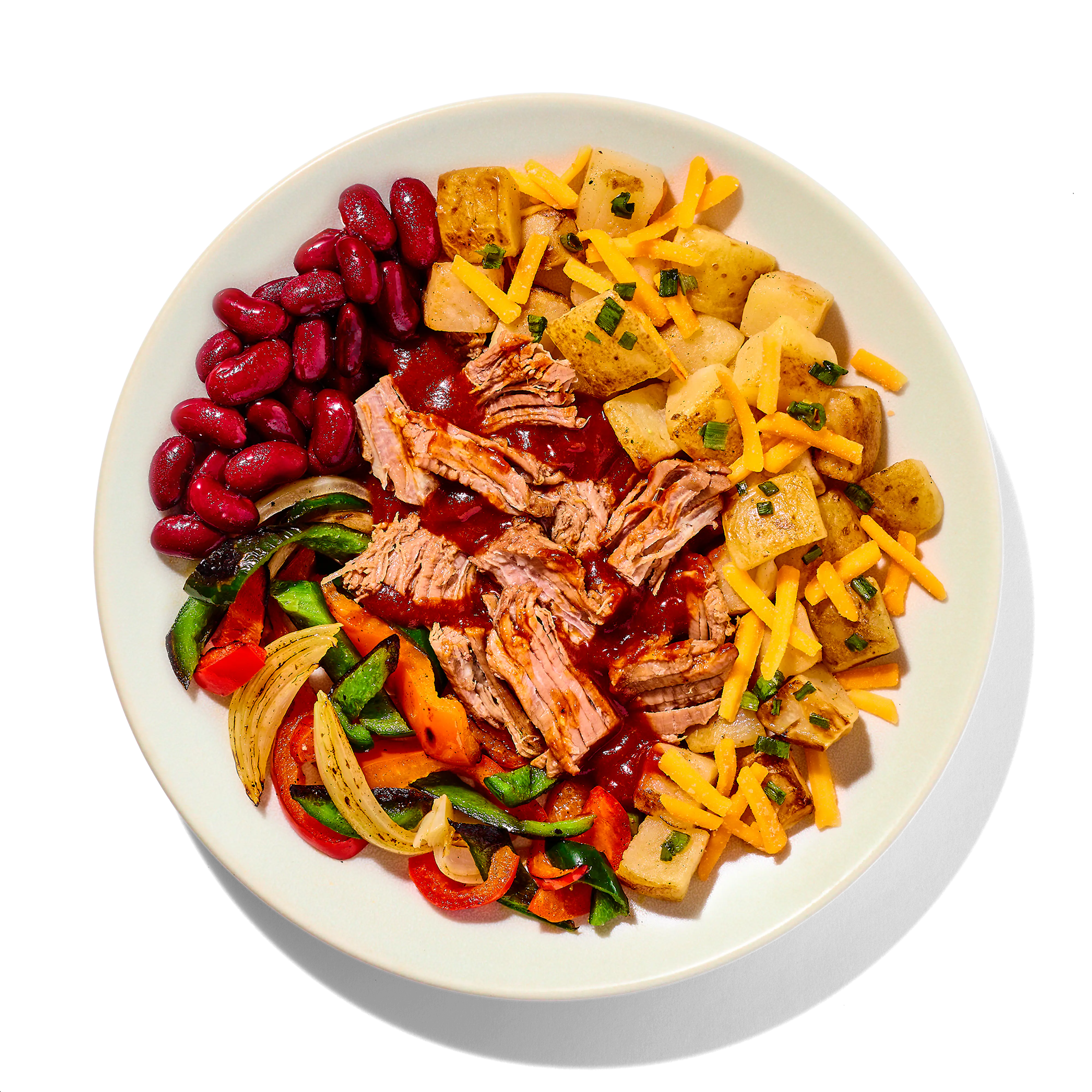 Gold Potatoes, Cooked Red Kidney Beans (Red Kidney Beans, Water), Onion And Pepper Blend (Onions, Red Bell Peppers, Poblano Peppers), Cooked Pulled Beef (Beef Lifter Meat), Brown Sugar Bbq Sauce (Corn Syrup, Water, Tomato Paste, Brown Sugar, Distilled Vinegar, Modified Food Starch, Salt, Natural Smoke Flavor, Worcestershire Sauce [Distilled Vinegar, Water, Molasses, Corn Syrup, Salt, Caramel Color, Dehydrated Garlic, Sugar, Tamarind, Natural Flavors {Celery}], Pineapple Juice Concentrate, Citric Acid, Caramel Color, Spices, Dehydrated Garlic), Guajillo Chile Pepper Sauce (Water, Tomato Paste, Chili Pepper, Olive Oil, Guajillo Chile Powder, Salt, Sugar, Food Starch - Modified, Spice, Onion Powder, Onion Juice Concentrate, Garlic Powder, Guar Gum), Shredded Sharp Cheddar Cheese (Cheddar Cheese [Pasteurized Milk, Cheese Culture, Salt, Enzymes, Annatto {Color}], Potato Starch And Powdered Cellulose [To Prevent Caking]), Dried Green Onion.