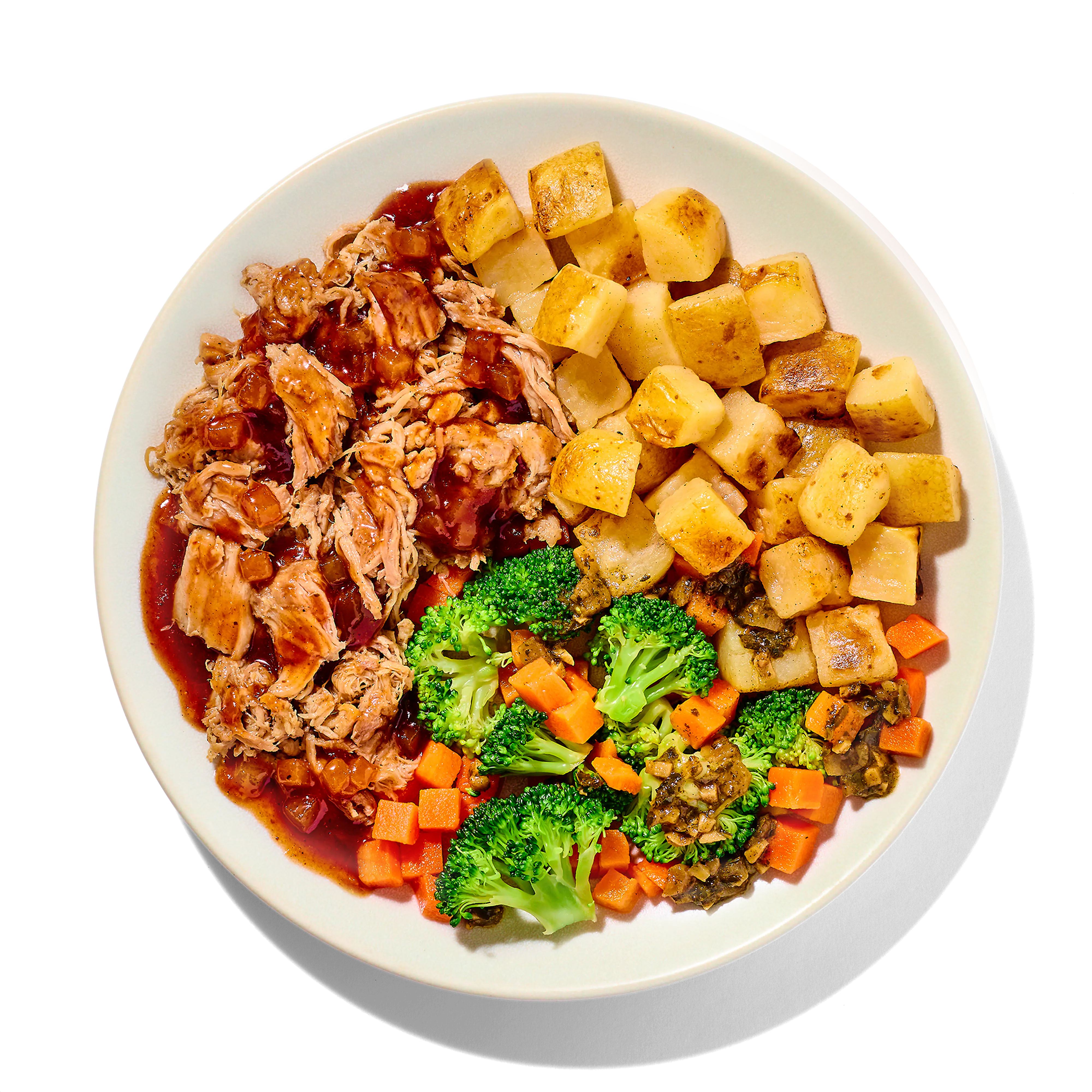 Fully Cooked Pulled Pork Contains Up To 5% Solution (Water, Salt), Gold Potatoes, Broccoli, Aromatics (Onions, Garlic, Spices, Olive Oil, Water, Parsley, Contains 2% Or Less Of Butter [sweet Cream, Lactic Acid], Salt, Guar Gum, Xanthan Gum, Spice Extractive), Carrots, Apple Compote (Apples, Cane Sugar, Pears, Water, Lemon Juice Concentrate, Contains 1% Or Less Of Spices [cinnamon, Nutmeg, Ginger, Allspice], Citric Acid, Vanilla Extract, Guar Gum, Xanthan Gum, Malic Acid), Brown Sugar Bbq Sauce (Corn Syrup, Water, Tomato Paste, Brown Sugar, Distilled Vinegar, Modified Food Starch, Salt, Natural Smoke Flavor, Worcestershire Sauce [distilled Vinegar, Water, Molasses, Corn Syrup, Salt, Caramel Color, Dehydrated Garlic, Sugar, Tamarind, Natural Flavors {celery}], Pineapple Juice Concentrate, Citric Acid, Caramel Color, Spices, Dehydrated Garlic).