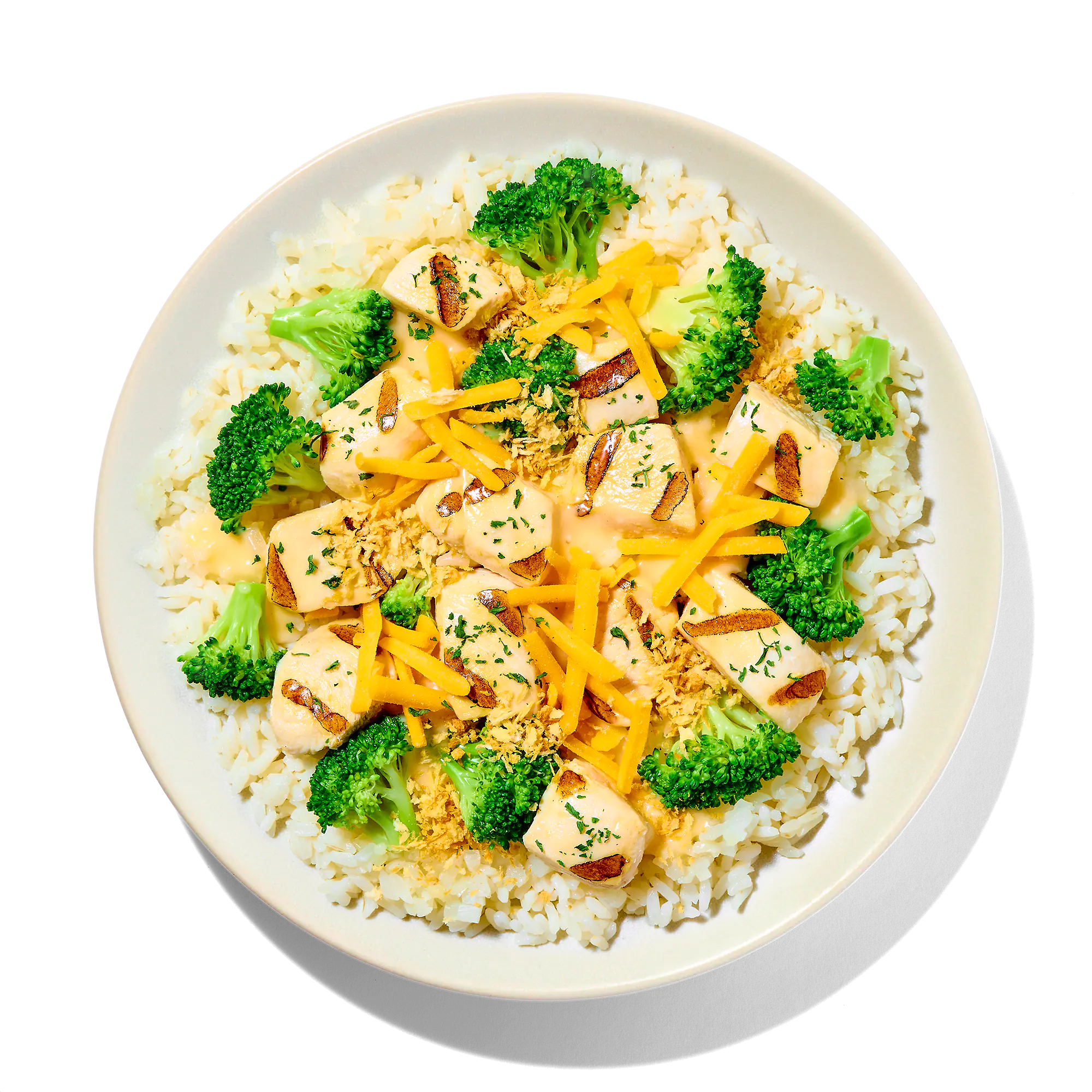 COOKED LONG GRAIN WHITE RICE (WATER, WHITE RICE), BROCCOLI, DICED CHICKEN BREAST MEAT WITH RIB MEAT (SKINLESS BONELESS CHICKEN BREAST MEAT WITH RIB MEAT, WATER, POTATO STARCH, VINEGAR, SEA SALT), ALFREDO SAUCE (WATER, WHOLE MILK, HEAVY CREAM, PARMESAN AND GRANULAR CHEESE [PASTEURIZED MILK, CHEESE CULTURES, SALT, ENZYMES], OLIVE OIL, FOOD STARCH - MODIFIED, SALT, GARLIC, SODIUM CASEINATE, SPICES, CITRIC ACID, LACTIC ACID), CHEESE SAUCE (WATER, CLUB CHEDDAR [CHEDDAR CHEESE {CULTURED PASTEURIZED MILK, SALT, ENZYMES}, WATER, SALT], CREAM, MILK, PASTEURIZED PROCESSED CHEDDAR CHEESE [CHEDDAR CHEESE {PASTEURIZED MILK, CHEESE CULTURES, SALT, ENZYMES}, WATER, SODIUM PHOSPHATE, MILKFAT, SALT], CHEDDAR CHEESE [PASTEURIZED MILK, CHEESE CULTURES, SALT, ANNATTO, ENZYMES], BUTTER, MODIFIED FOOD STARCH, ROMANO CHEESE [PASTEURIZED MILK, CHEESE CULTURES, SALT, ENZYMES], PARMESAN CHEESE [PASTEURIZED MILK, CHEESE CULTURES, SALT, ENZYME], NON FAT DRY MILK, SALT, SODIUM CITRATE, NATURAL BUTTER FLAVOR [WHEY, BUTTER OIL, CORN SYRUP SOLIDS, SALT, GUAR GUM, ANNATTO {COLOR}, TURMERIC {COLOR}], ANNATTO [COLOR], NATURAL CREAM FLAVOR [MALTODEXTRIN, NATURAL FLAVOR], XANTHAN GUM), SHREDDED SHARP CHEDDAR CHEESE (SHARP CHEDDAR CHEESE [PASTEURIZED MILK, CHEESE CULTURES, SALT, ENZYMES, ANNATTO {COLOR}], POWDERED CELLULOSE [TO PREVENT CAKING]), RICED CAULIFLOWER (CAULIFLOWER), PANKO BREAD CRUMBS (WHEAT FLOUR, PALM OIL, SALT, YEAST), DRIED PARSLEY FLAKES.