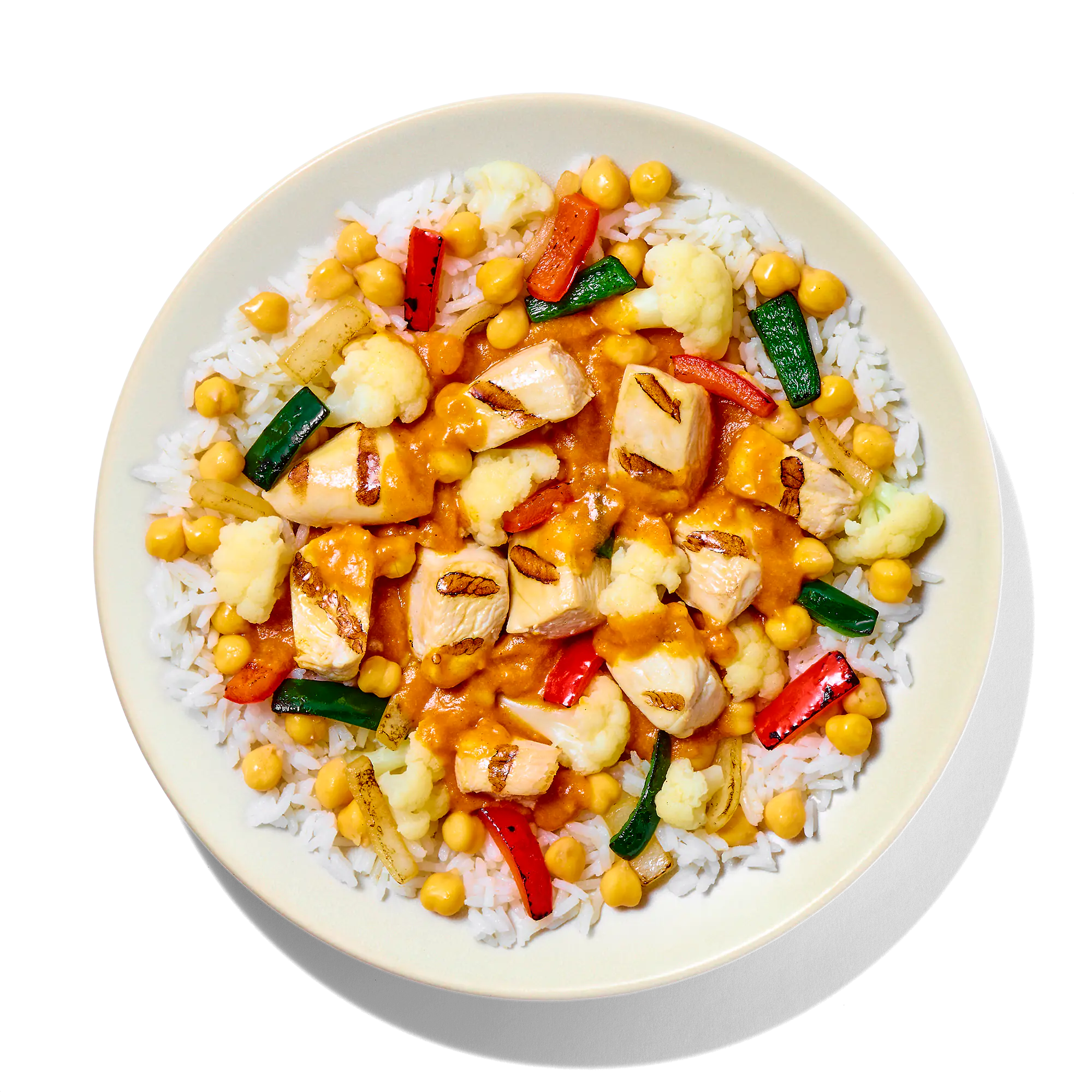 DICED CHICKEN BREAST MEAT WITH RIB MEAT (SKINLESS BONELESS CHICKEN BREAST MEAT WITH RIB MEAT, WATER, POTATO STARCH, VINEGAR, SEA SALT), COOKED LONG GRAIN WHITE RICE (WATER, WHITE RICE), CAULIFLOWER, BUTTER SAUCE (HEAVY CREAM, TOMATO PUREE, TOMATO PASTE, BUTTER [SWEET CREAM, LACTIC ACID], SALT, SPICES, GARLIC, GINGER, FOOD STARCH-MODIFIED, PAPRIKA [COLOR]), COOKED CHICKPEAS (CHICKPEAS, WATER), FIRE ROASTED GREEN SALSA (TOMATILLOS, FIRE ROASTED JALAPENO PEPPERS, SALT, WATER), ONION AND PEPPER BLEND (ONIONS, RED BELL PEPPERS, POBLANO PEPPERS).