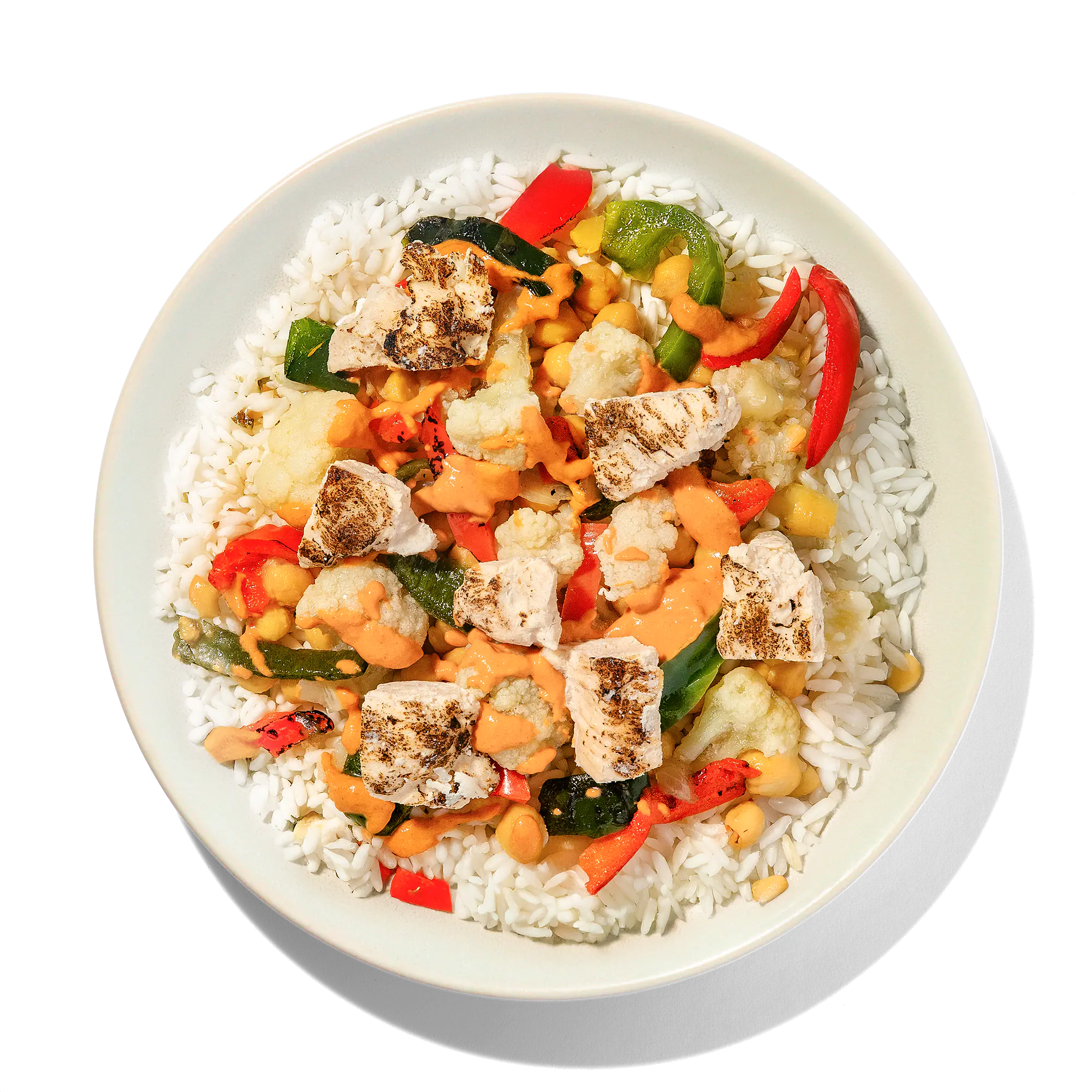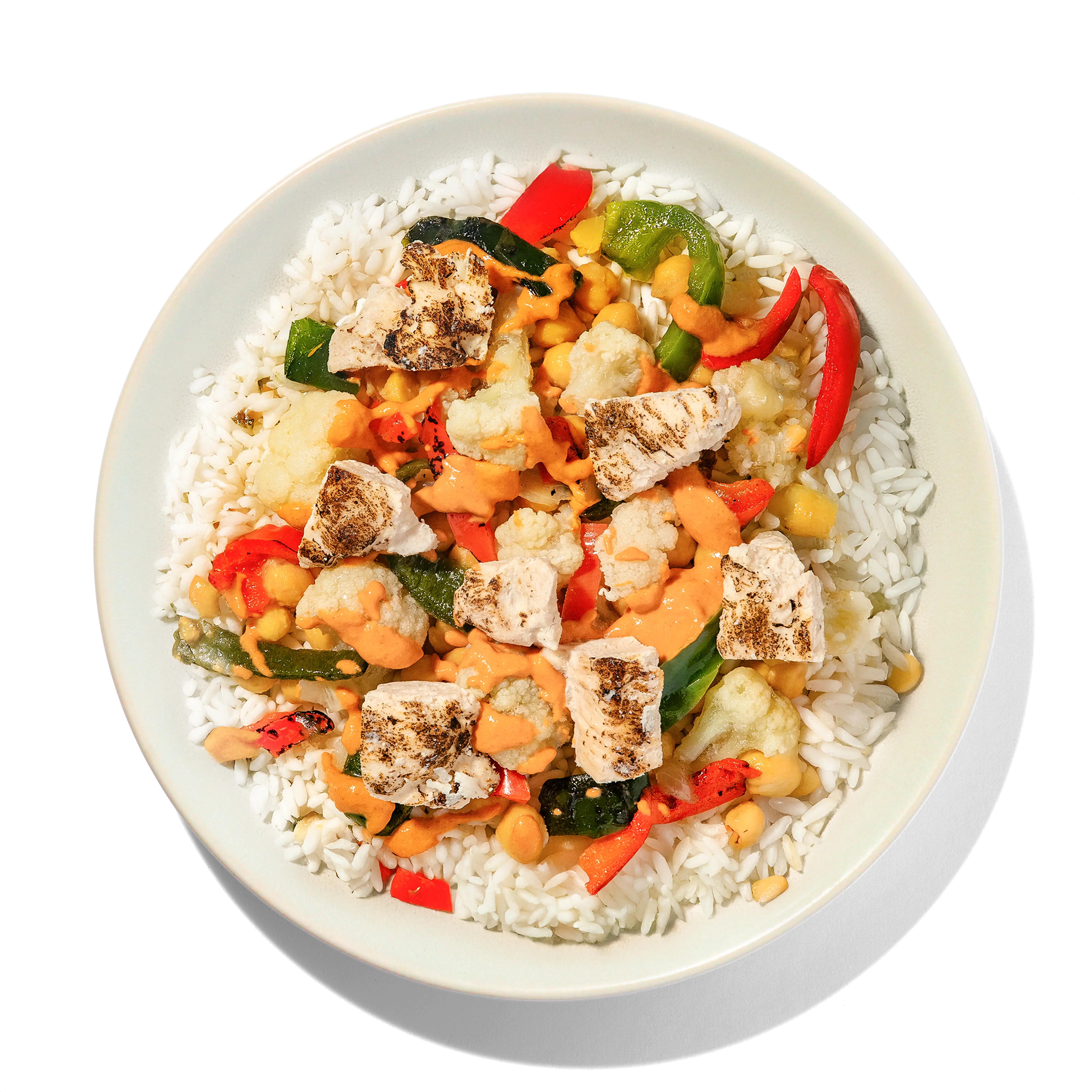 Diced Chicken Breast Meat With Rib Meat (Skinless Boneless Chicken Breast Meat With Rib Meat, Water, Potato Starch, Vinegar, Sea Salt), Cooked Long Grain White Rice (Water, White Rice), Cauliflower, Butter Sauce (Heavy Cream, Tomato Puree, Tomato Paste, Butter [Sweet Cream, Lactic Acid], Salt, Spices, Garlic, Ginger, Food Starch-modified, Paprika [Color]), Cooked Chickpeas (Chickpeas, Water), Fire Roasted Green Salsa (Tomatillos, Fire Roasted Jalapeno Peppers, Salt, Water), Onion And Pepper Blend (Onions, Red Bell Peppers, Poblano Peppers).
