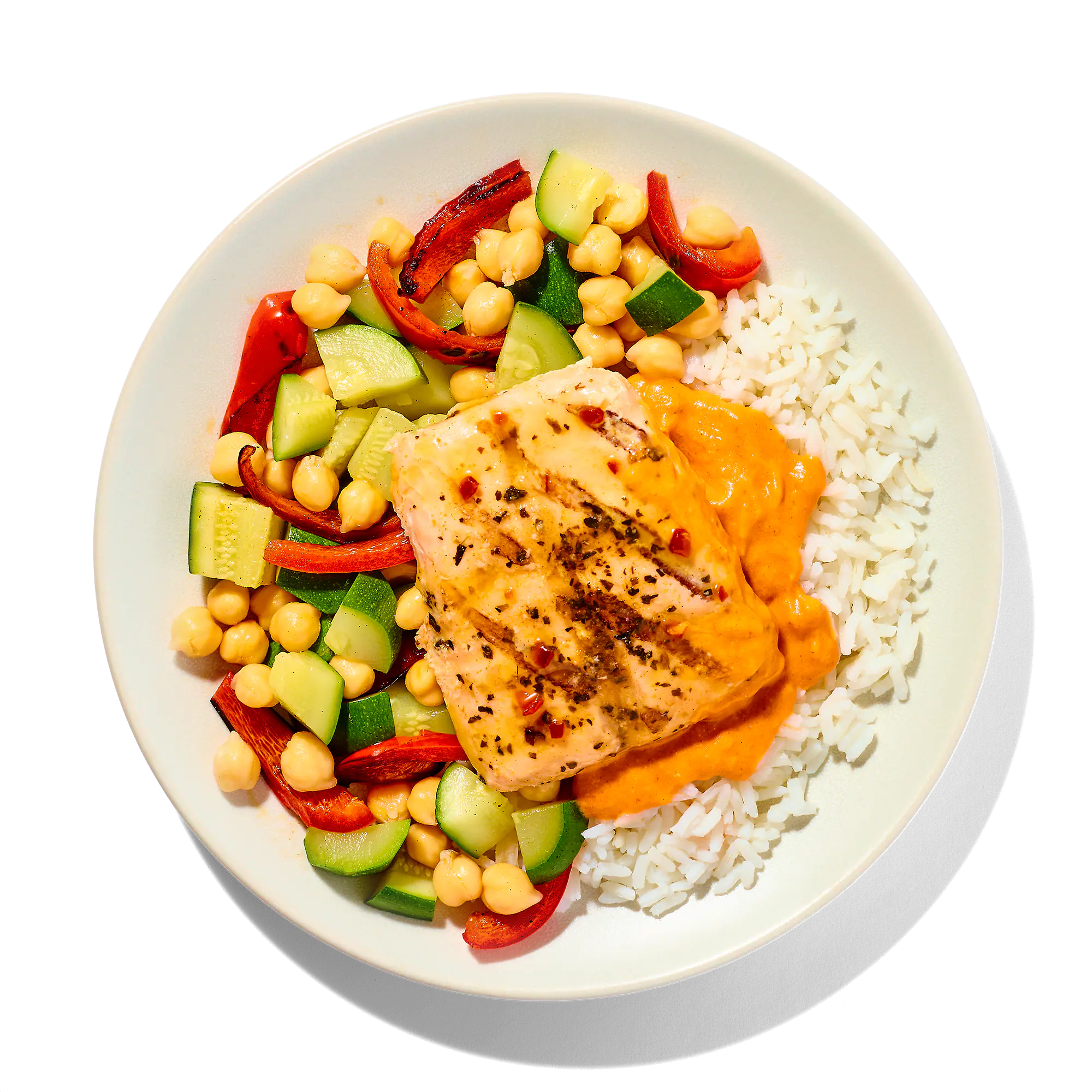 GRILLED FULLY COOKED SALMON (PINK AND/OR KETA SALMON, WATER, CONTAINS 2% OR LESS OF: SEA SALT, SUGAR, SODIUM PHOSPHATE, DEHYDRATED GARLIC AND ONION, SPICES, PAPRIKA, XANTHAN GUM, NATURAL FLAVOR, SPICE EXTRACTIVES), COOKED LONG GRAIN WHITE RICE (WATER, WHITE RICE), GREEN ZUCCHINI, BUTTER SAUCE (HEAVY CREAM, TOMATO PUREE, TOMATO PASTE, BUTTER [SWEET CREAM, LACTIC ACID], SALT, SPICES, GARLIC, GINGER, FOOD STARCH-MODIFIED, PAPRIKA [COLOR]), COOKED CHICKPEAS (CHICKPEAS, WATER), ROASTED RED PEPPERS, ORANGE SAUCE (WATER, SUGAR, ORANGE JUICE CONCENTRATE, SOY SAUCE [WATER, WHEAT, SOYBEANS, SALT], SEASONED RICE VINEGAR [RICE VINEGAR, WATER, SUGAR, SALT], CORN STARCH, GARLIC, CHICKEN BASE [CHICKEN STOCK, SALT, NATURAL FLAVOR, CHICKEN FAT], SAUCIER [MODIFIED GUM ACACIA, MODIFIED TAPIOCA STARCH, XANTHAN GUM], SALT, RED CHILI PEPPER, GINGER).