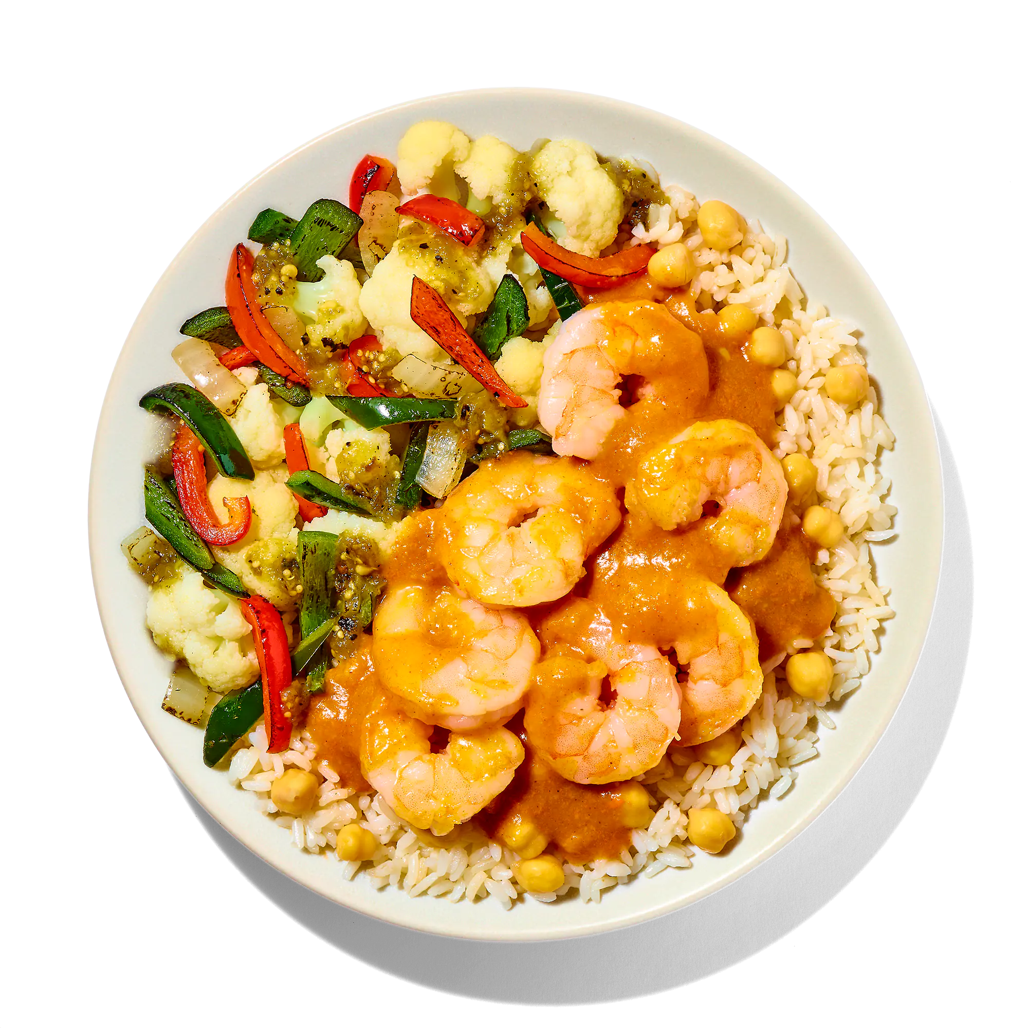 COOKED SHRIMP (SHRIMP, SALT, SODIUM TRIPOLYPHOSPHATE), COOKED LONG GRAIN WHITE RICE (WATER, WHITE RICE), COOKED CHICKPEAS (CHICKPEAS, WATER), BUTTER SAUCE (HEAVY CREAM, TOMATO PUREE, TOMATO PASTE, BUTTER [SWEET CREAM, LACTIC ACID], SALT, SPICES, GARLIC, GINGER, FOOD STARCH-MODIFIED, PAPRIKA [COLOR]), CAULIFLOWER, FIRE ROASTED GREEN SALSA (TOMATILLOS, FIRE ROASTED JALAPENO PEPPERS, SALT, WATER), ONION AND PEPPER BLEND (ONIONS, RED BELL PEPPERS, POBLANO PEPPERS).
