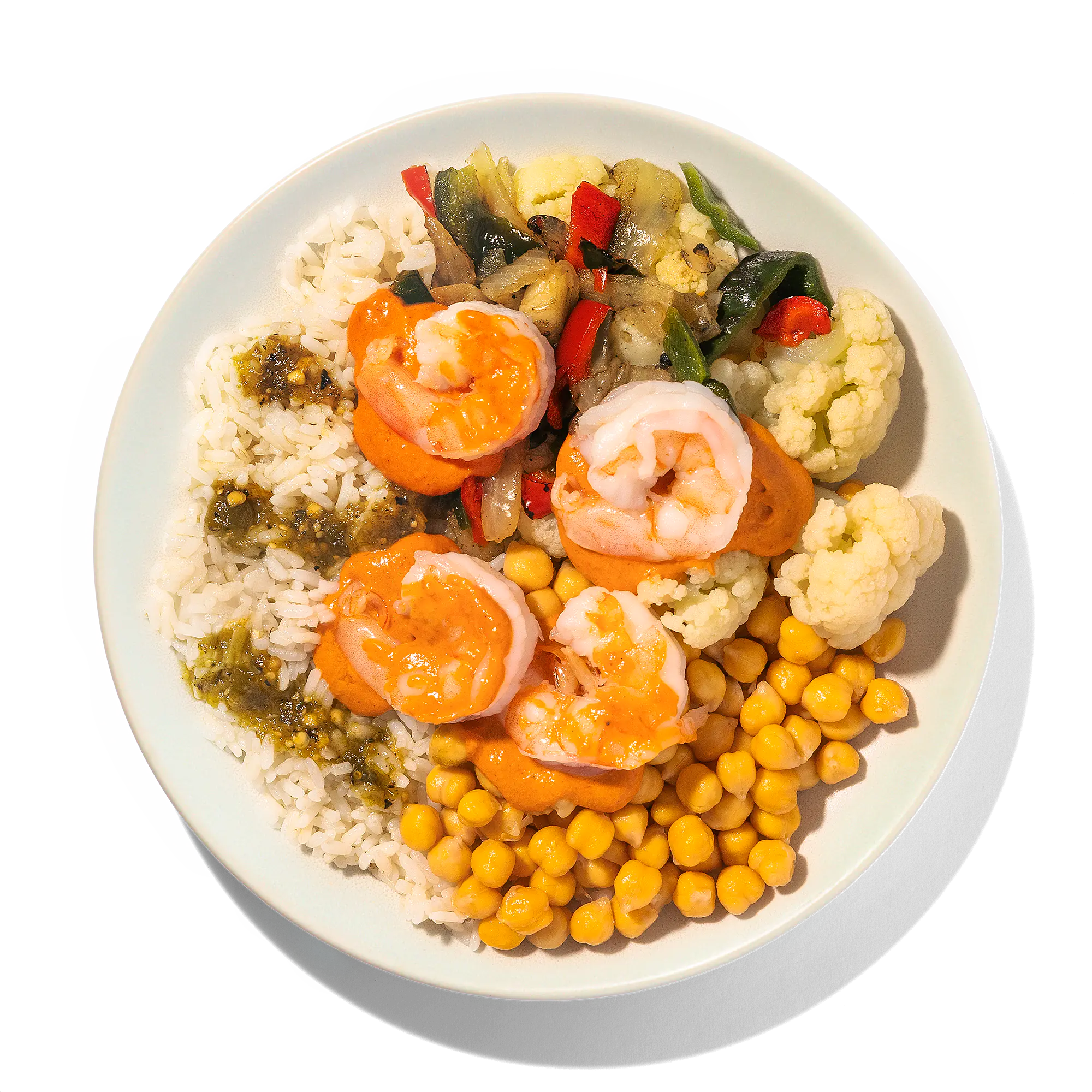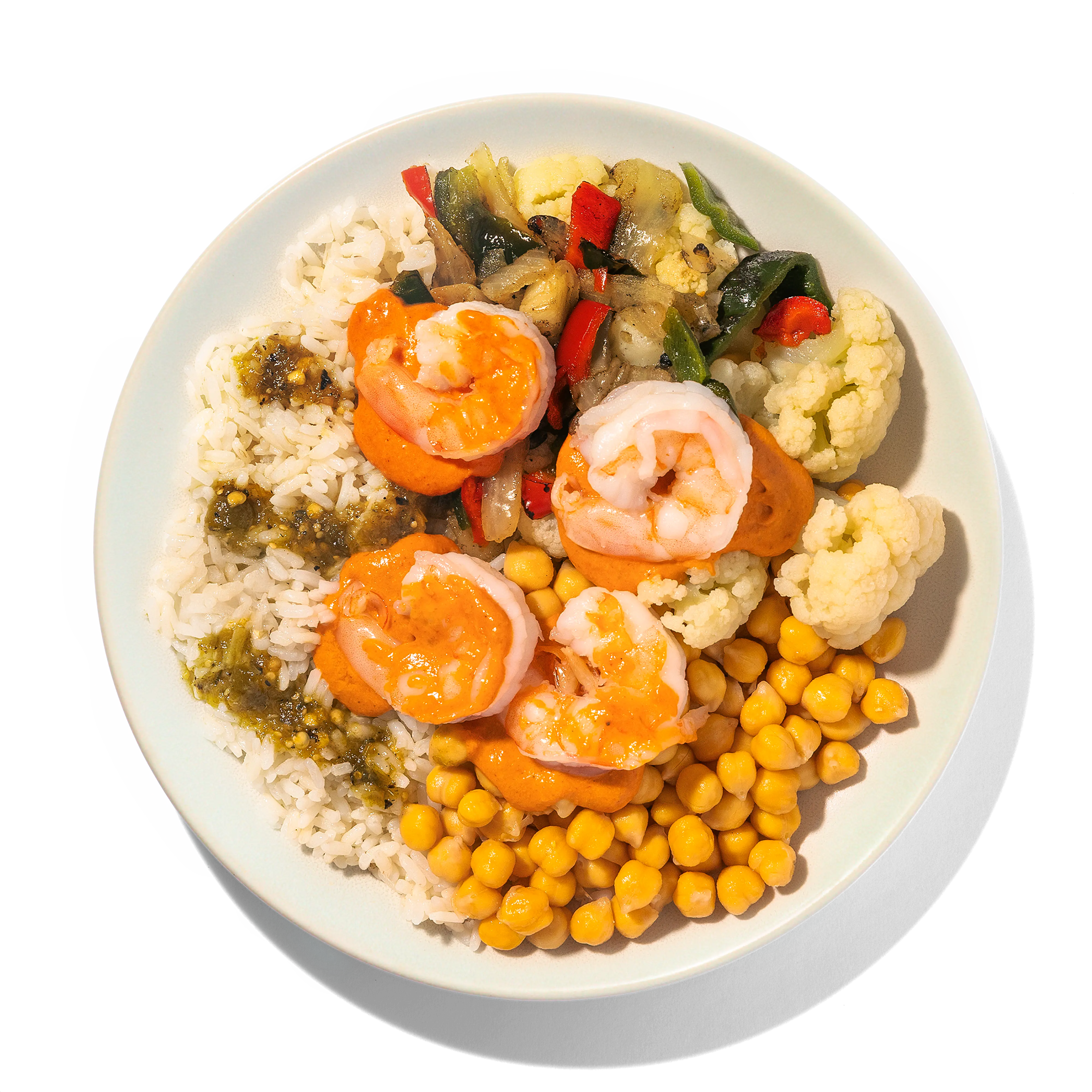 Cooked Shrimp (Shrimp, Salt, Sodium Tripolyphosphate), Cooked Long Grain White Rice (Water, White Rice), Cooked Chickpeas (Chickpeas, Water), Butter Sauce (Heavy Cream, Tomato Puree, Tomato Paste, Butter [Sweet Cream, Lactic Acid], Salt, Spices, Garlic, Ginger, Food Starch-modified, Paprika [Color]), Cauliflower, Fire Roasted Green Salsa (Tomatillos, Fire Roasted Jalapeno Peppers, Salt, Water), Onion And Pepper Blend (Onions, Red Bell Peppers, Poblano Peppers).