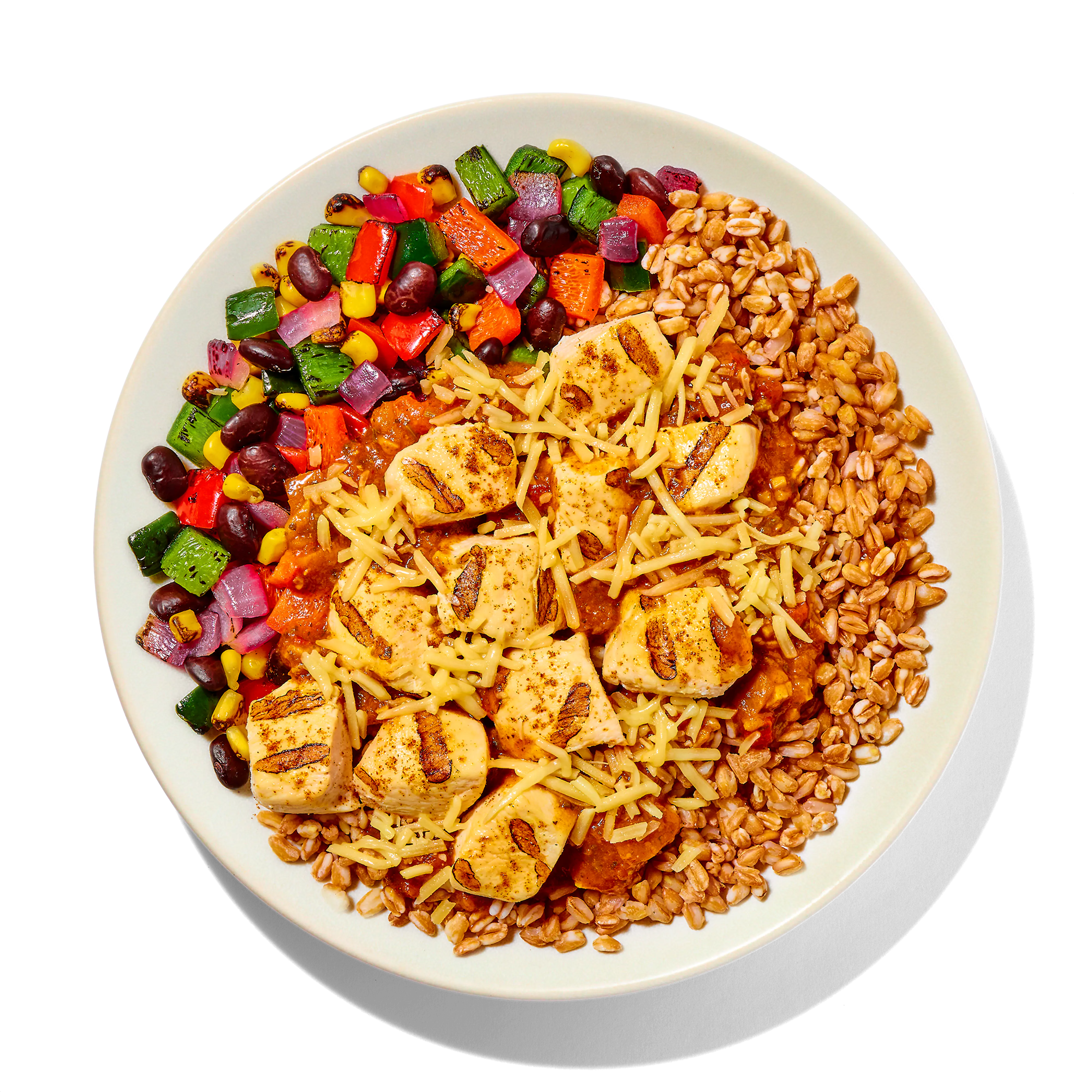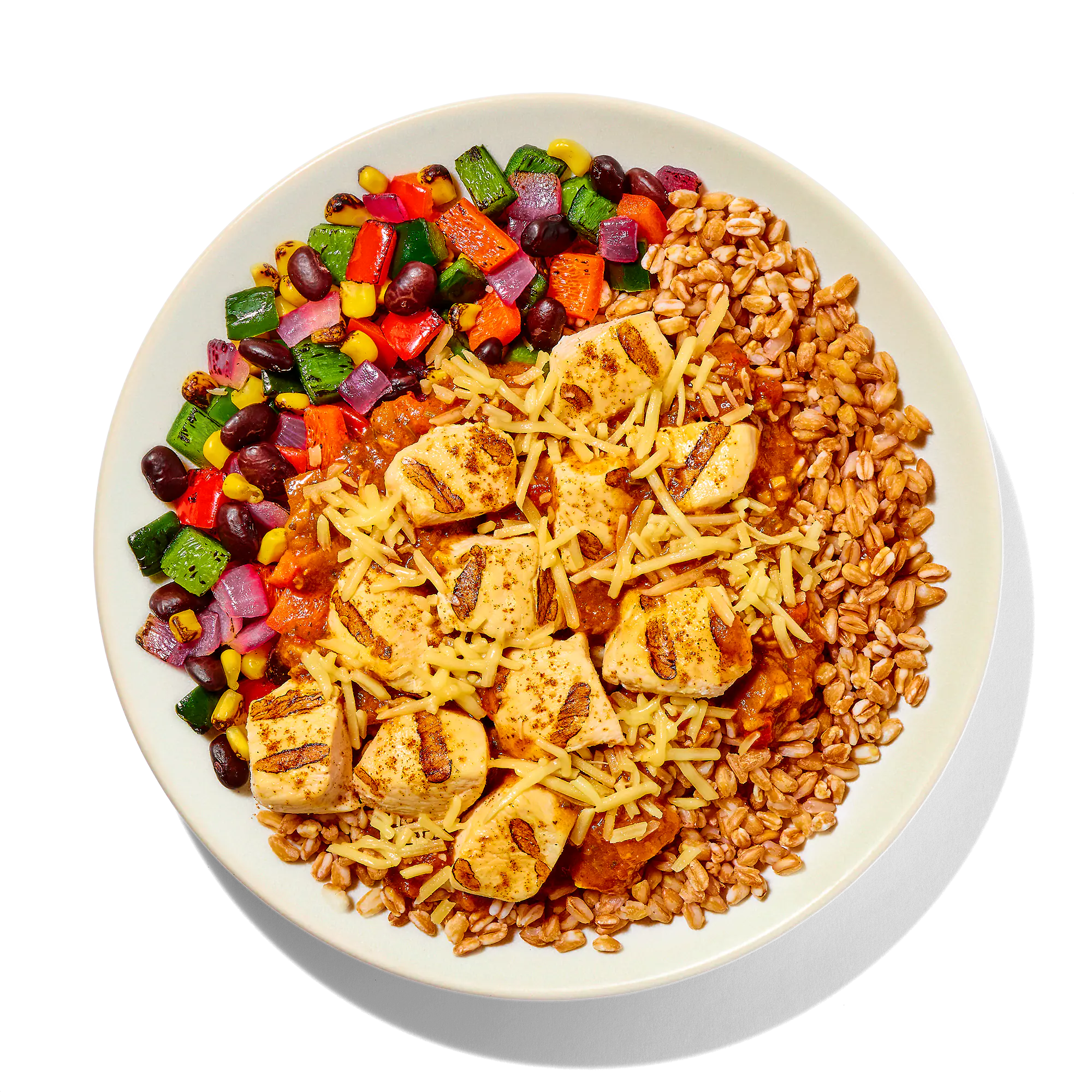 COOKED FARRO (FARRO, WATER), DICED CHICKEN BREAST MEAT WITH RIB MEAT (SKINLESS BONELESS CHICKEN BREAST MEAT WITH RIB MEAT, WATER, POTATO STARCH, VINEGAR, SEA SALT), FIRE ROASTED SOUTHWEST STYLE CORN BLEND (CORN, RED BELL PEPPERS, POBLANO PEPPERS, RED ONIONS, BLACK BEANS), AROMATICS (ONIONS, GARLIC, RED BELL PEPPERS, OLIVE OIL, CILANTRO, SPICE, WATER, TOMATO PASTE, PAPRIKA [COLOR], CONTAINS 2% OR LESS OF BUTTER [SWEET CREAM, LACTIC ACID], SALT, CITRIC ACID, GUAR GUM, XANTHAN GUM), MARINARA SAUCE (WATER, DICED TOMATOES [TOMATOES, TOMATO JUICE, CITRIC ACID, CALCIUM CHLORIDE], TOMATO PASTE, ONIONS, SUGAR, CONTAINS 2% OR LESS OF: SPICE BLEND [SALT, ONION POWDER, GARLIC POWDER, SPICES, SUGAR, DEHYDRATED PARSLEY], GARLIC, CORN STARCH, EXTRA VIRGIN OLIVE OIL, SPICE, CITRIC ACID, SALT), SHREDDED PARMESAN CHEESE (PASTEURIZED MILK, CHEESE CULTURES, SALT, ENZYMES), BLACKENED SEASONING (SMOKED PAPRIKA, SPICES, GARLIC POWDER, ONION POWDER).