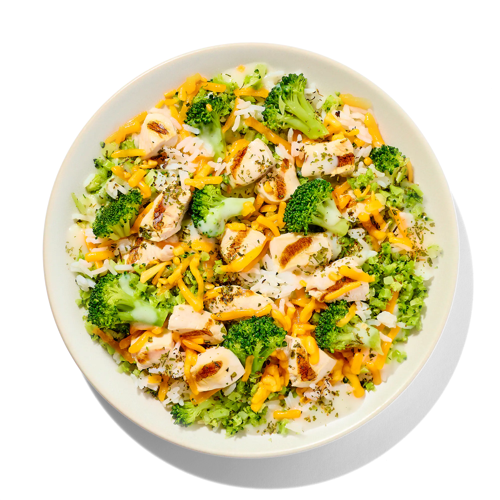 COOKED LONG GRAIN WHITE RICE (WATER, WHITE RICE), RICED BROCCOLI (BROCCOLI), ALFREDO SAUCE (WATER, WHOLE MILK, HEAVY CREAM, PARMESAN AND GRANULAR CHEESE [PASTEURIZED MILK, CHEESE CULTURES, SALT, ENZYMES], OLIVE OIL, FOOD STARCH - MODIFIED, SALT, GARLIC, SODIUM CASEINATE, SPICES, CITRIC ACID, LACTIC ACID), BROCCOLI, DICED CHICKEN BREAST MEAT WITH RIB MEAT (SKINLESS BONELESS CHICKEN BREAST MEAT WITH RIB MEAT, WATER, POTATO STARCH, VINEGAR, SEA SALT), SHREDDED SHARP CHEDDAR CHEESE (SHARP CHEDDAR CHEESE [PASTEURIZED MILK, CHEESE CULTURES, SALT, ENZYMES, ANNATTO {COLOR}], POWDERED CELLULOSE [TO PREVENT CAKING]), DRIED PARSLEY.