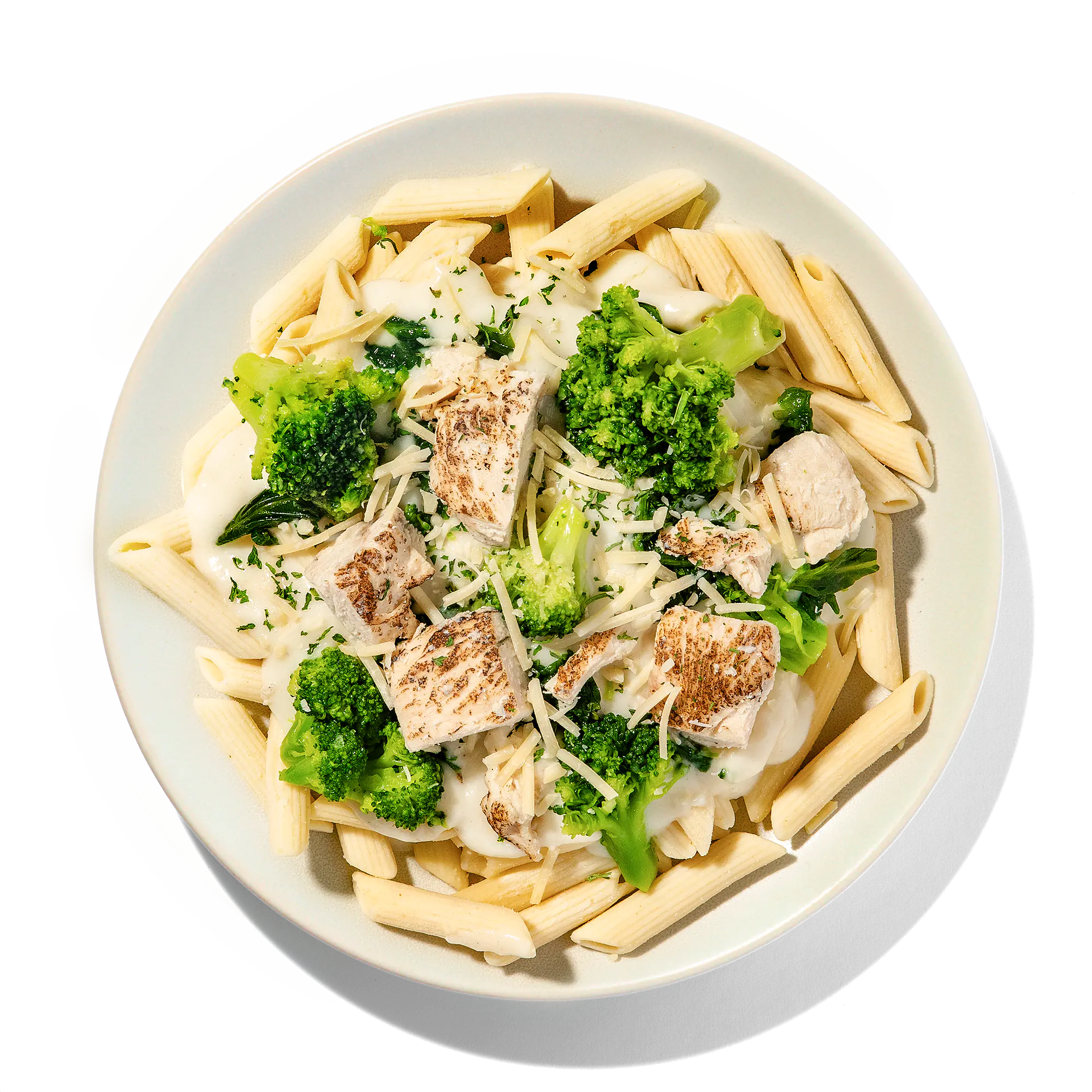 Cooked Enriched Penne Pasta (Water, Durum Wheat Semolina, Niacin, Iron [ferrous Sulfate], Thiamine Mononitrate, Riboflavin, Folic Acid), Alfredo Sauce (Water, Whole Milk, Heavy Cream, Parmesan And Granular Cheese [pasteurized Milk, Cheese Cultures, Salt, Enzymes], Olive Oil, Food Starch - Modified, Salt, Garlic, Sodium Caseinate, Spices, Citric Acid, Lactic Acid), Diced Chicken Breast Meat With Rib Meat (Skinless Boneless Chicken Breast Meat With Rib Meat, Water, Potato Starch, Vinegar, Sea Salt), Spinach, Broccoli, Shredded Parmesan Cheese (Pasteurized Milk, Cheese Cultures, Salt, Enzymes), Dried Parsley.