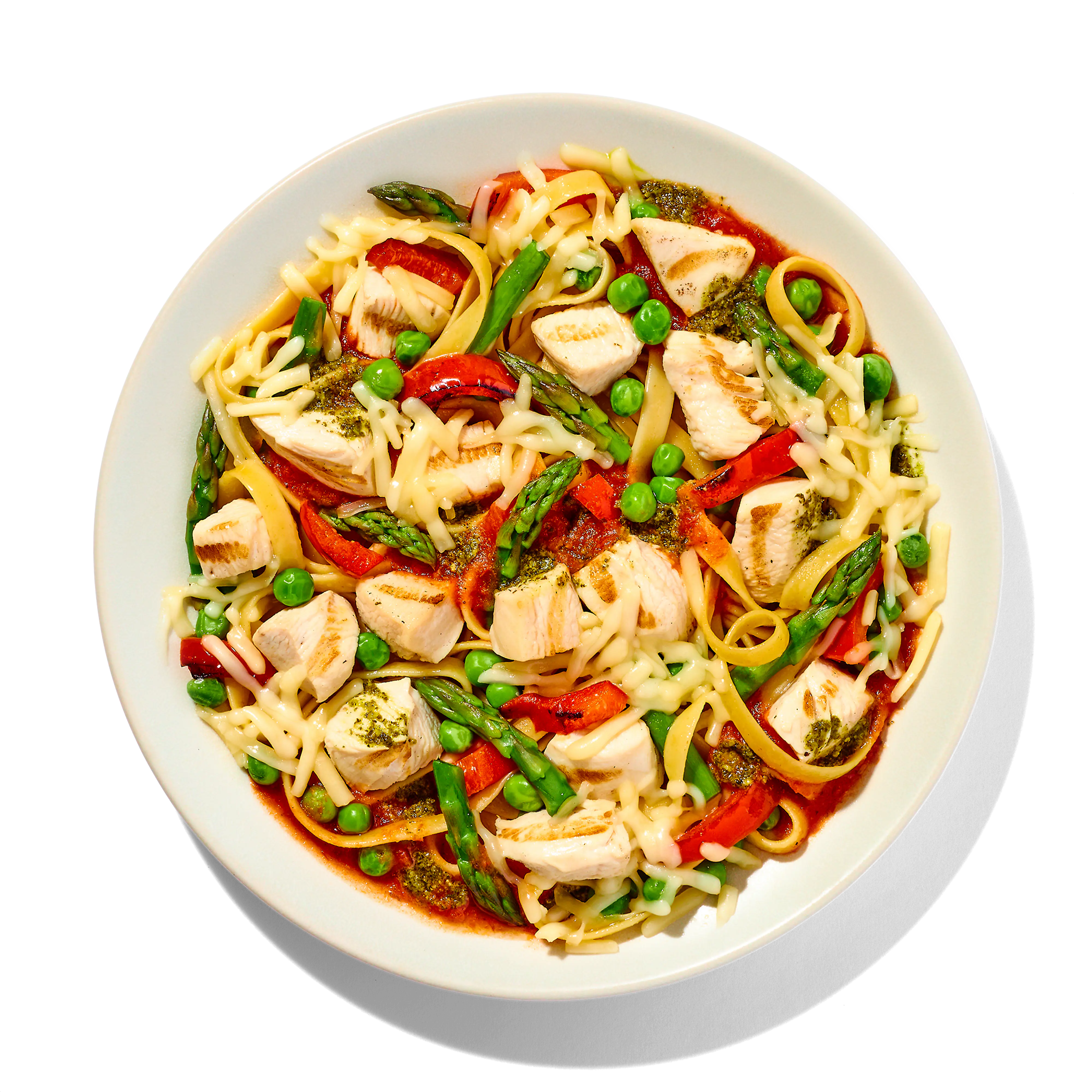 Cooked Enriched Fettuccine Pasta (Water, Semolina [Wheat], Durum Flour, Niacin, Iron [Ferrous Sulfate], Thiamine Mononitrate, Riboflavin, Folic Acid), Diced Chicken Breast Meat With Rib Meat (Skinless Boneless Chicken Breast Meat With Rib Meat, Water, Potato Starch, Vinegar, Sea Salt), Green Peas, Basil Pesto With Lemon (Basil, Avocado Oil, Water, Parmesan Cheese [Pasteurized Part-skim Cows’ Milk, Cheese Cultures, Salt, Enzymes], Garlic, Lemon Juice, Salt, Onion Powder), Marinara Sauce (Water, Diced Tomatoes [Tomatoes, Tomato Juice, Citric Acid, Calcium Chloride], Tomato Paste, Onions, Sugar, Contains 2% Or Less Of: Spice Blend [Salt, Onion Powder, Garlic Powder, Spices, Sugar, Dehydrated Parsley], Garlic, Corn Starch, Extra Virgin Olive Oil, Spice, Citric Acid, Salt), Asparagus, Italian-style Shredded Cheese Blend (Mozzarella, Parmesan, Asiago, Montamore, And Fontina Cheeses [Pasteurized Milk, Cheese Cultures, Salt, Enzymes], Powdered Cellulose [To Prevent Caking]), Roasted Red Peppers.