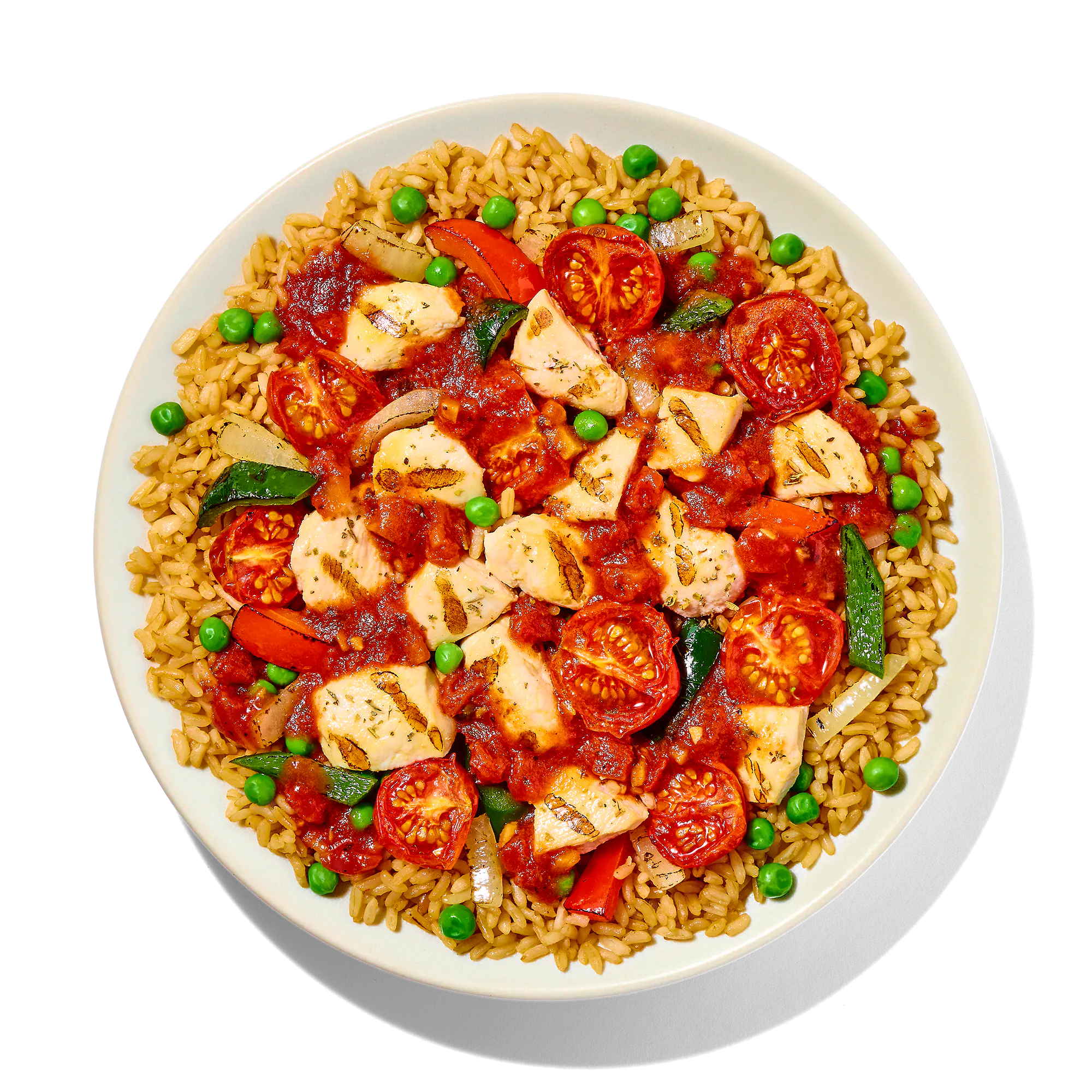 COOKED BROWN RICE (WATER, BROWN RICE), PUTTANESCA SAUCE (DICED TOMATOES IN JUICE [TOMATOES, TOMATO JUICE, CITRIC ACID, CALCIUM CHLORIDE], WATER, TOMATO PASTE, CHICKEN BASE [CHICKEN STOCK, SALT, NATURAL FLAVOR, CHICKEN FAT], ONION, GARLIC, EXTRA VIRGIN OLIVE OIL, OLIVES [OLIVES, WATER, SALT], ANCHOVY PASTE [ANCHOVY, SALT, OLIVE OIL, ACETIC ACID], CAPERS [CAPERS, WATER, SALT, DISTILLED VINEGAR], DEHYDRATED GARLIC, CORN STARCH, BASIL, OREGANO, SALT, RED CHILI PEPPER), DICED CHICKEN BREAST MEAT WITH RIB MEAT (SKINLESS BONELESS CHICKEN BREAST MEAT WITH RIB MEAT, WATER, POTATO STARCH, VINEGAR, SEA SALT), ONION AND PEPPER BLEND (ONIONS, RED BELL PEPPERS, POBLANO PEPPERS), ROASTED TOMATOES, GREEN PEAS, SALTED BUTTER (CREAM, SALT), SEASONING BLEND (ROSEMARY, OREGANO, BASIL, MARJORAM, THYME).