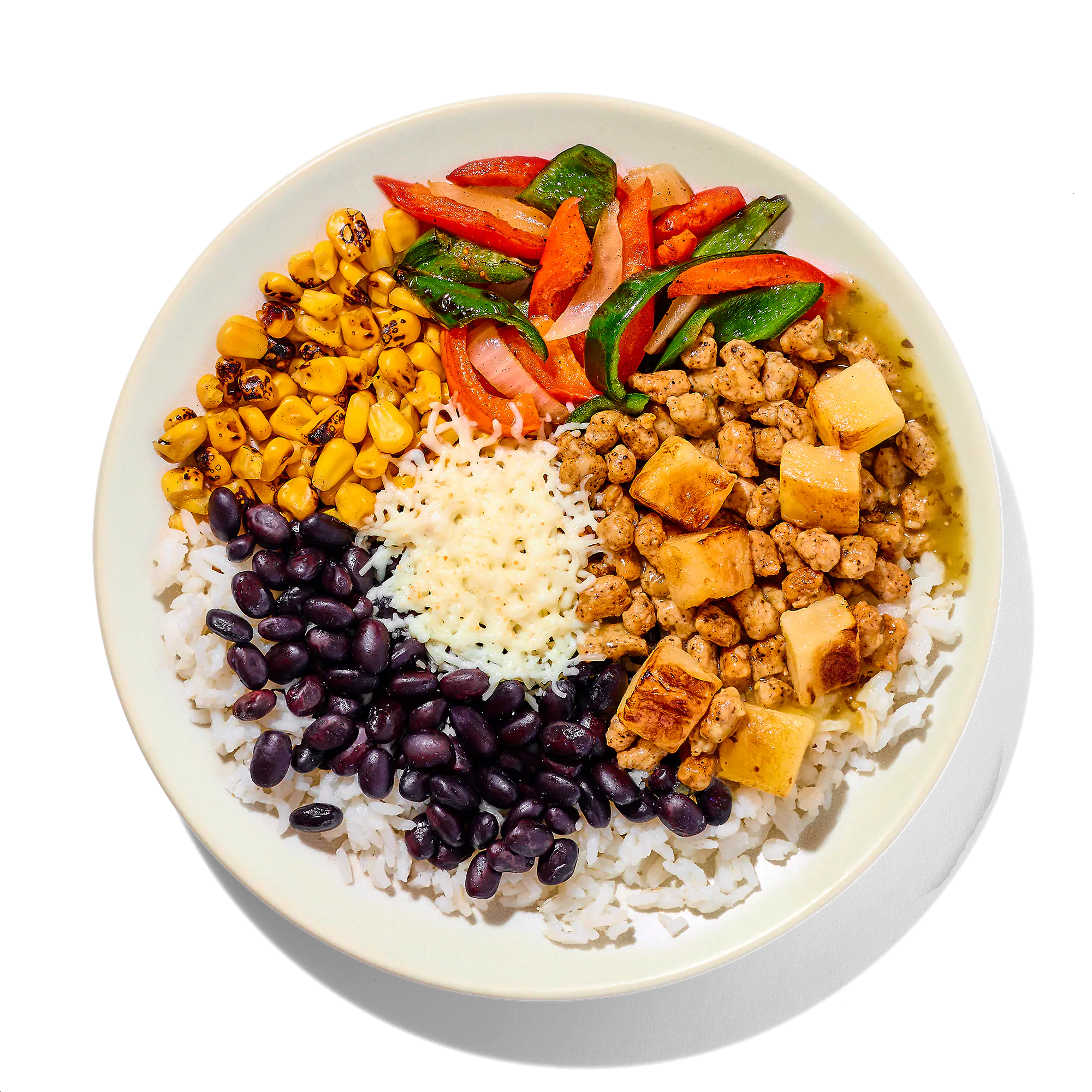 COOKED BLACK BEANS (BLACK BEANS, WATER), FULLY COOKED CHICKEN BREAKFAST SAUSAGE CRUMBLES (CHICKEN BREAST WITH RIB MEAT, SALT, SPICES, SUGAR, NATURAL FLAVOR, DEHYDRATED GARLIC), COOKED LONG GRAIN WHITE RICE (WATER, WHITE RICE), ONION AND PEPPER BLEND (ONIONS, RED BELL PEPPERS, POBLANO PEPPERS), TOMATILLO SAUCE (GROUND TOMATILLO [GREEN TOMATILLOS, SALT, CITRIC ACID], WATER, JALAPENO PEPPER, MODIFIED FOOD STARCH, CILANTRO, GREEN ONION, CHICKEN BASE [CHICKEN MEAT INCLUDING NATURAL CHICKEN JUICES, SEA SALT, CHICKEN FAT, VEGETABLE EXTRACT {POTATO, CARROT, ONION}, YEAST EXTRACT, NATURAL FLAVORS, TURMERIC], SALT, DEHYDRATED GARLIC, DEHYDRATED ONION, SPICES), SHREDDED MONTEREY JACK CHEESE (MONTERY JACK CHEESE [PASTEURIZED MILK, CHEESE CULTURES, SALT, ENZYMES], POWDERED CELLULOSE [TO PREVENT CAKING]), GOLD POTATOES, FIRE GRILLED YELLOW CORN.