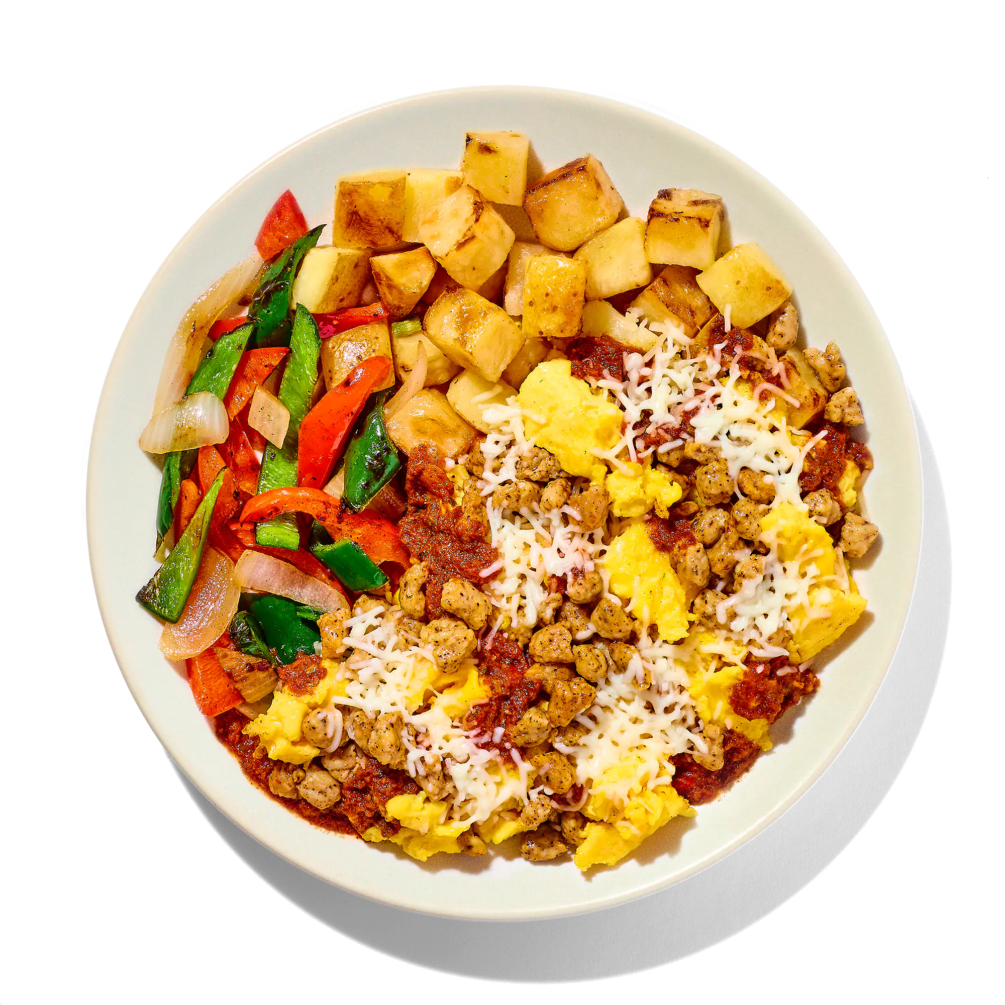 GOLD POTATOES, SCRAMBLED EGG WHITES (EGG WHITES, WHOLE MILK, CORN STARCH, SEA SALT, ANNATTO COLOR, WHITE PEPPER), ONION AND PEPPER BLEND (ONIONS, RED BELL PEPPERS, POBLANO PEPPERS), SCRAMBLED EGGS (WHOLE EGGS, WHOLE MILK, CORN STARCH, SEA SALT, GROUND WHITE PEPPER), FULLY COOKED CHICKEN BREAKFAST SAUSAGE CRUMBLES (CHICKEN BREAST WITH RIB MEAT, SALT, SPICES, SUGAR, NATURAL FLAVOR, DEHYDRATED GARLIC), ROJO SAUCE (WATER, CRUSHED TOMATOES IN PUREE [TOMATOES, TOMATO PUREE, CALCIUM CHLORIDE, CITRIC ACID], OLIVE OIL, TOMATO PASTE, FLOUR BLEND [RICE FLOUR, WHOLE GRAIN BROWN RICE FLOUR, WHOLE SORGHUM FLOUR, TAPIOCA STARCH, POTATO STARCH, CELLULOSE, XANTHAN GUM, VITAMIN AND MINERAL BLEND {CALCIUM CARBONATE, NIACINAMIDE (VITAMIN B3), REDUCED IRON, THIAMIN HYDROCHLORIDE (VITAMIN B1), RIBOFLAVIN (VITAMIN B2)}], SPICES, APPLE CIDER VINEGAR, MAPLE SYRUP, CHILI POWDER [SPICES, SALT, DEHYDRATED GARLIC, AND SILICON DIOXIDE ADDED TO PREVENT CAKING], SMOKED PAPRIKA, SEA SALT, DEHYDRATED GARLIC), SHREDDED MONTEREY JACK CHEESE (MONTERY JACK CHEESE [PASTEURIZED MILK, CHEESE CULTURES, SALT, ENZYMES], POWDERED CELLULOSE [TO PREVENT CAKING]), AROMATICS (ONIONS, GARLIC, RED BELL PEPPERS, OLIVE OIL, CILANTRO, SPICE, WATER, TOMATO PASTE, PAPRIKA [COLOR], CONTAINS 2% OR LESS OF BUTTER [SWEET CREAM, LACTIC ACID], SALT, CITRIC ACID, GUAR GUM, XANTHAN GUM).