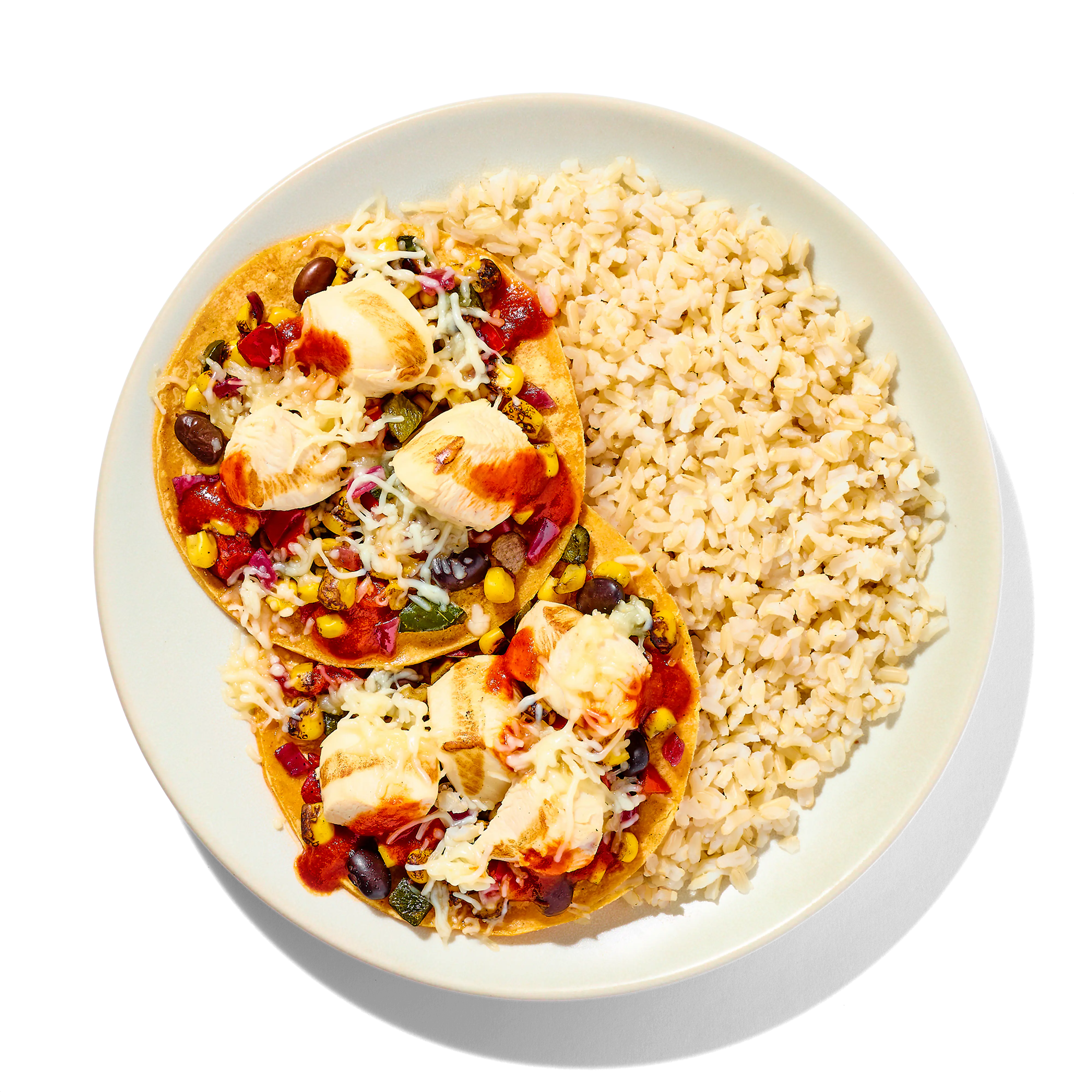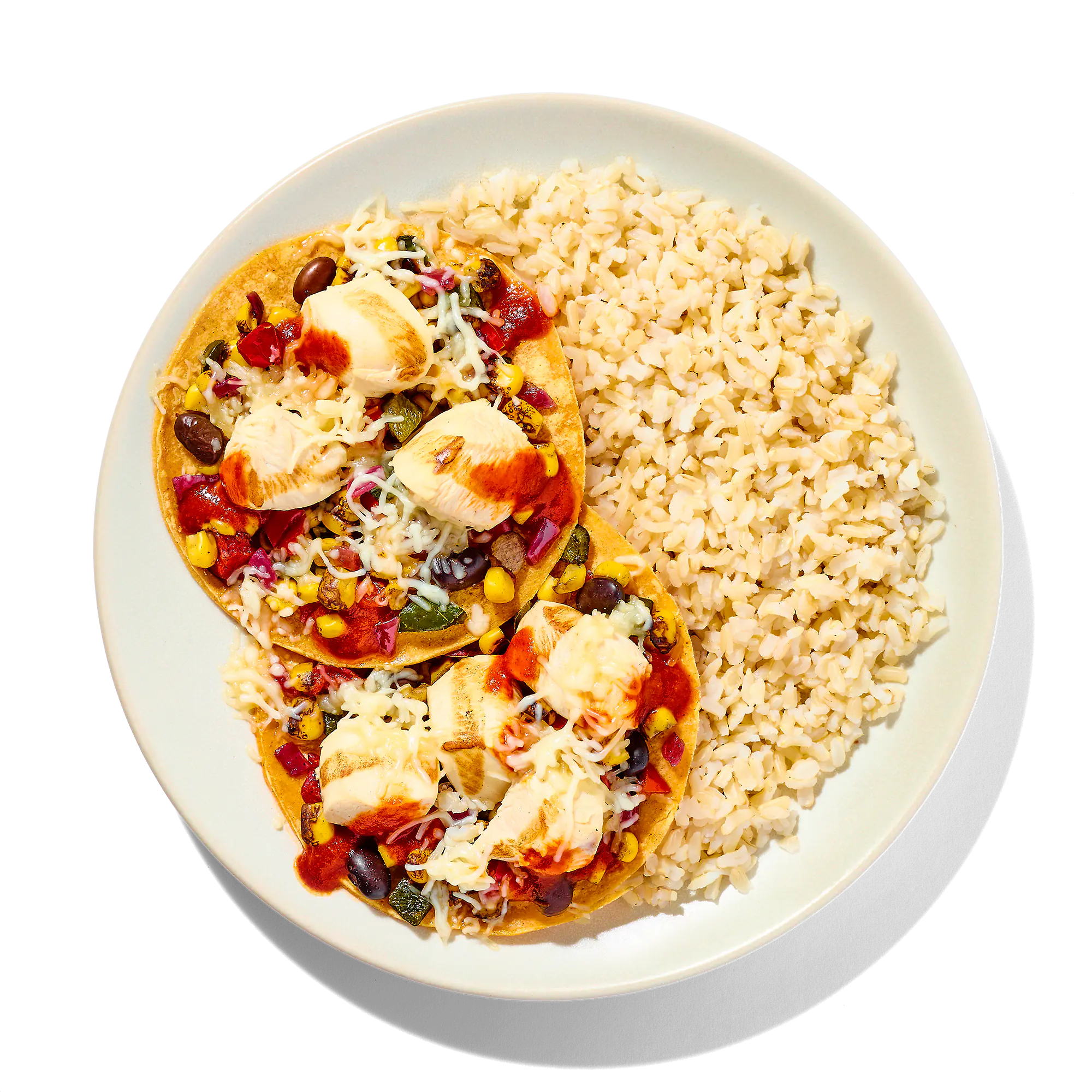 Cooked Brown Rice (Water, Brown Rice), Fire Roasted Southwest Style Corn Blend (Corn, Red Bell Peppers, Poblano Peppers, Red Onions, Black Beans), Diced Chicken Breast Meat With Rib Meat (Skinless Boneless Chicken Breast Meat With Rib Meat, Water, Potato Starch, Vinegar, Sea Salt), Guajillo Chile Pepper Sauce (Water, Tomato Paste, Chili Pepper, Olive Oil, Guajillo Chile Powder, Salt, Sugar, Food Starch - Modified, Spice, Onion Powder, Onion Juice Concentrate, Garlic Powder, Guar Gum), Shredded Monterey Jack Cheese (Pasteurized Milk, Cheese Culture, Salt, Microbial Enzymes, Potato Starch, Corn Starch, Powdered Cellulose), Corn Tortilla (Water, Whole White Corn, Yellow Corn Masa Flour, Contains 2% Or Less Of Guar Gum, Trace Of Lime).
