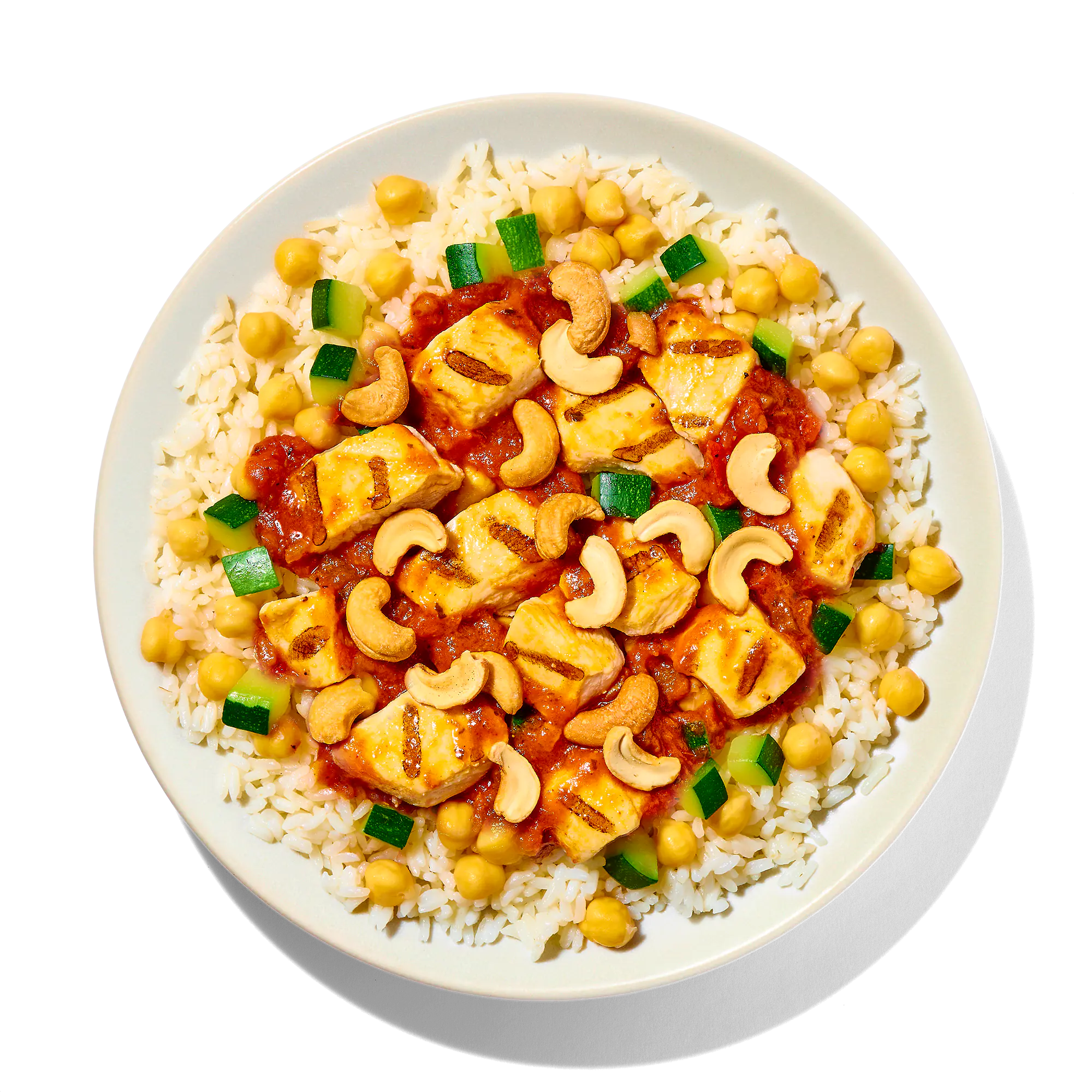 COOKED LONG GRAIN WHITE RICE (WATER, WHITE RICE), DICED CHICKEN BREAST MEAT WITH RIB MEAT (SKINLESS BONELESS CHICKEN BREAST MEAT WITH RIB MEAT, WATER, POTATO STARCH, VINEGAR, SEA SALT), PAELLA SAUCE (RED AND GREEN BELL PEPPERS, DICED TOMATOES [PACKED IN TOMATO JUICE, SALT, CITRIC ACID AND CALCIUM CHLORIDE], ONIONS, TOMATO PASTE, CELERY, WHITE WINE [CONTAINS SULFITES], OLIVE OIL, GARLIC, WATER, SALT, YEAST EXTRACT, ONION POWDER, SUGAR, FOOD STARCH - MODIFIED, SPICE, PAPRIKA [COLOR], NATURAL FLAVOR, CITRIC ACID, EXTRACTIVES OF ANNATTO AND TURMERIC [COLOR]), ZUCCHINI, TIKKA MASALA SAUCE (CRUSHED TOMATOES [TOMATOES, SALT], ONIONS, COCONUT MILK [COCONUT, WATER], WATER, SPINACH, GINGER, EXTRA VIRGIN OLIVE OIL, GARLIC, CORIANDER, TURMERIC, CHILI POWDER, BASMATI RICE, CUMIN, FENNEL SEED, CINNAMON, CARDAMOM, BLACK PEPPER, CLOVE, STAR ANISE, CHILI FLAKES, BAY LEAF), COOKED CHICKPEAS (CHICKPEAS, WATER), SALTED CASHEWS (CASHEWS, SALT).