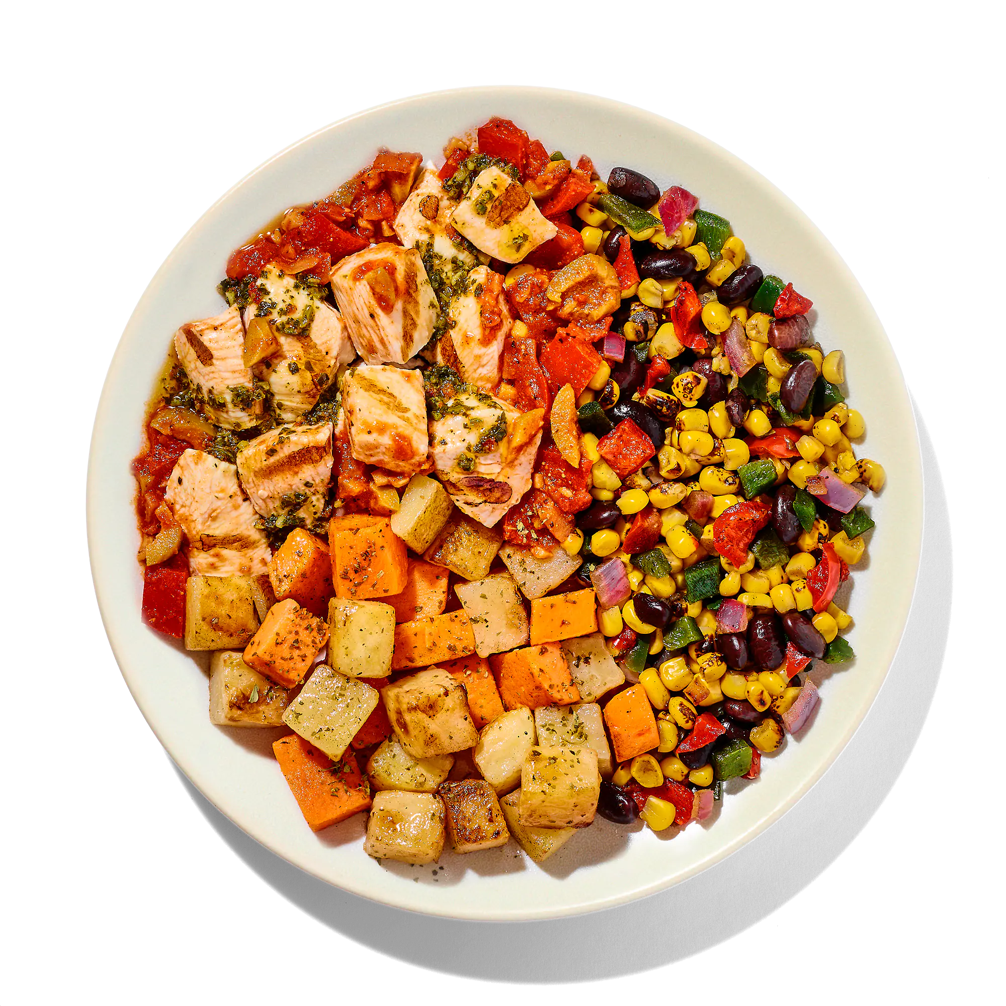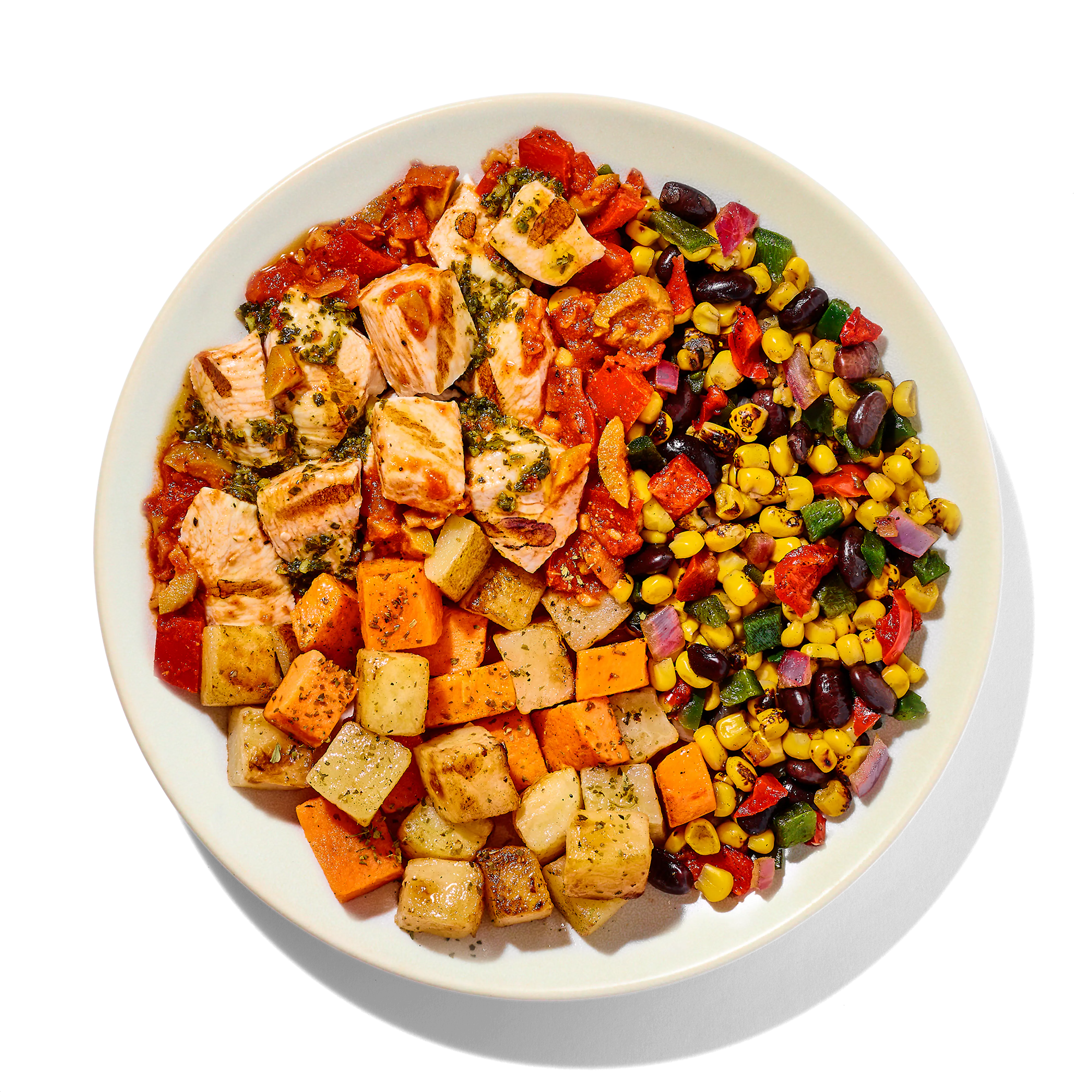 Fire Roasted Southwest Style Corn Blend (Corn, Red Bell Peppers, Poblano Peppers, Red Onions, Black Beans), Diced Chicken Breast Meat With Rib Meat (Skinless Boneless Chicken Breast Meat With Rib Meat, Water, Potato Starch, Vinegar, Sea Salt), Seasoned Tomato Sauce (Crushed Tomato In Puree [Tomatoes, Tomato Puree, Citric Acid, Calcium Chloride], Bell Pepper, Onion, Green Olives [Olives, Water, Salt, Lactic Acid], Garlic, Extra Virgin Olive Oil, Red Wine Vinegar, Smoked Paprika, Spices, Salt), Gold Potatoes, Roasted Sweet Potato, Chimichurri Sauce (Avocado Oil, Parsley, Lime Juice, Garlic, Jalapeño Peppers, Cilantro, Salt, Spices, Xanthan Gum), Dried Cilantro.