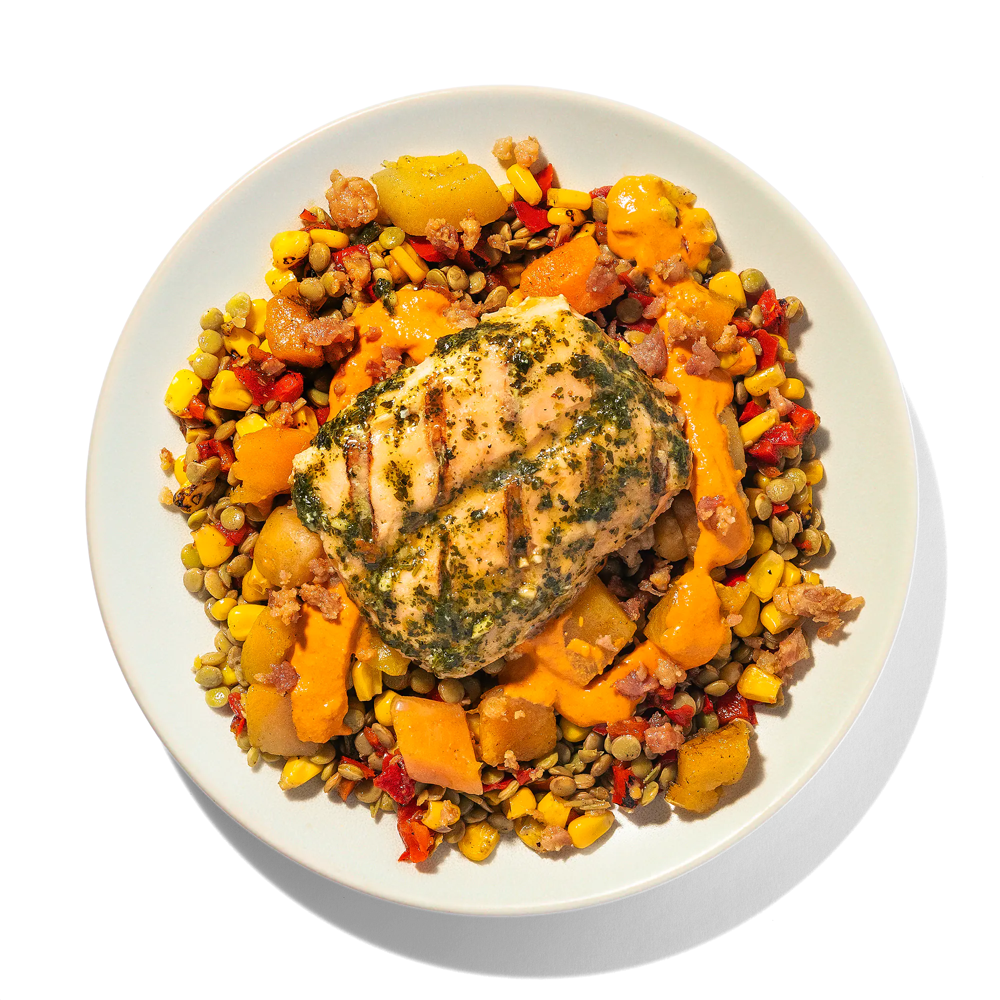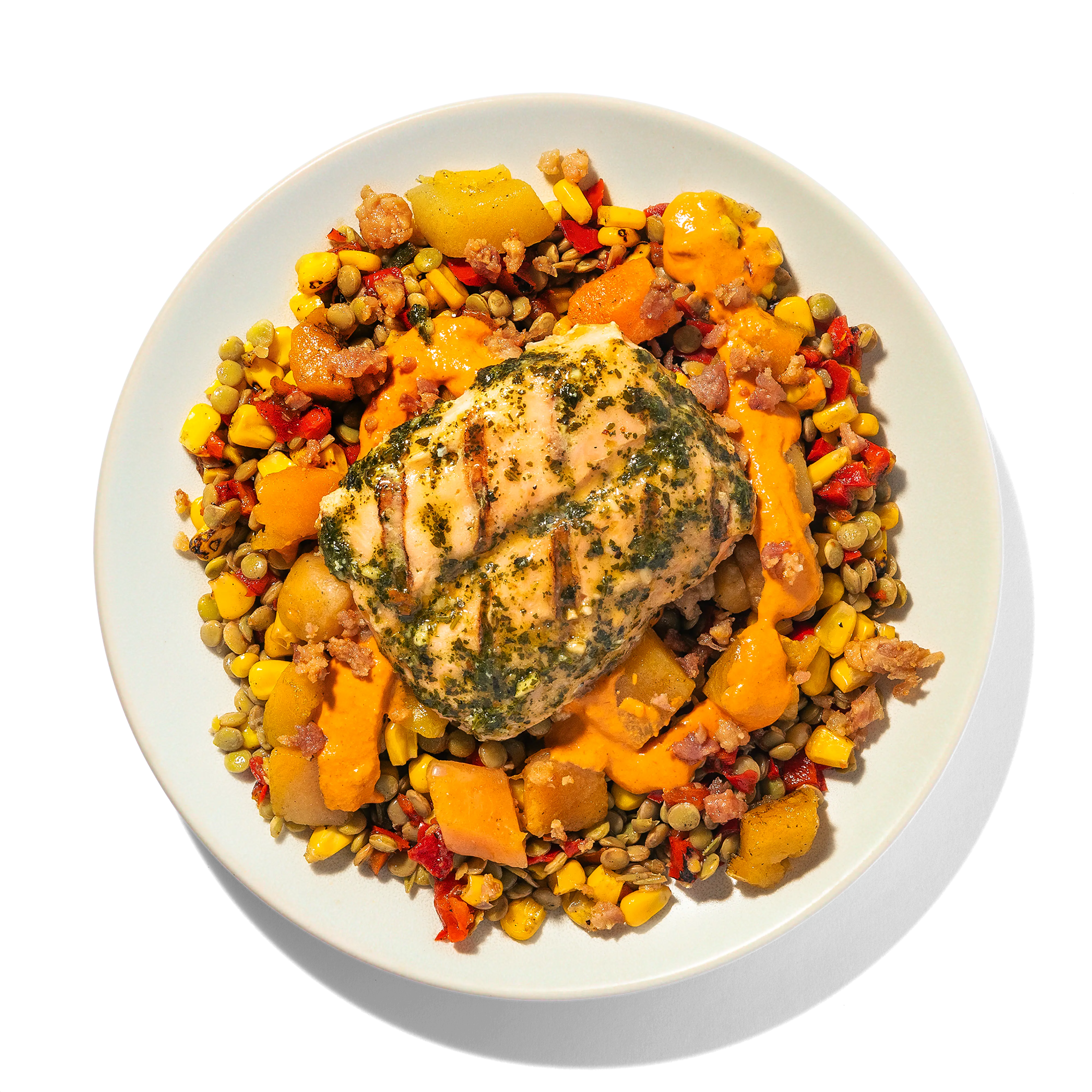 Cooked Green Lentils (Water, Green Lentils), Grilled Fully Cooked Salmon (Pink And/or Keta Salmon, Water, Contains 2% Or Less Of: Sea Salt, Sugar, Sodium Phosphates, Dehydrated Garlic And Onion, Spices, Paprika, Xanthan Gum, Natural Flavors, Spice Extractives), Butternut Squash, Roasted Red Bell Peppers, Fire Grilled Yellow Corn, Butter Sauce (Heavy Cream, Tomato Puree, Tomato Paste, Butter [Sweet Cream, Lactic Acid], Salt, Spices, Garlic, Ginger, Food Starch-modified, Paprika [Color]), Uncured Bacon, No Nitrites Or Nitrates Added Except For Those Naturally Occurring In Sea Salt And Cultured Celery Juice (Pork, Water, Sea Salt, Sugar, Natural Smoke Flavor, Cultured Celery Juice), Chimichurri Sauce (Avocado Oil, Parsley, Lime Juice, Garlic, Jalapeño Peppers, Cilantro, Salt, Spices, Xanthan Gum).