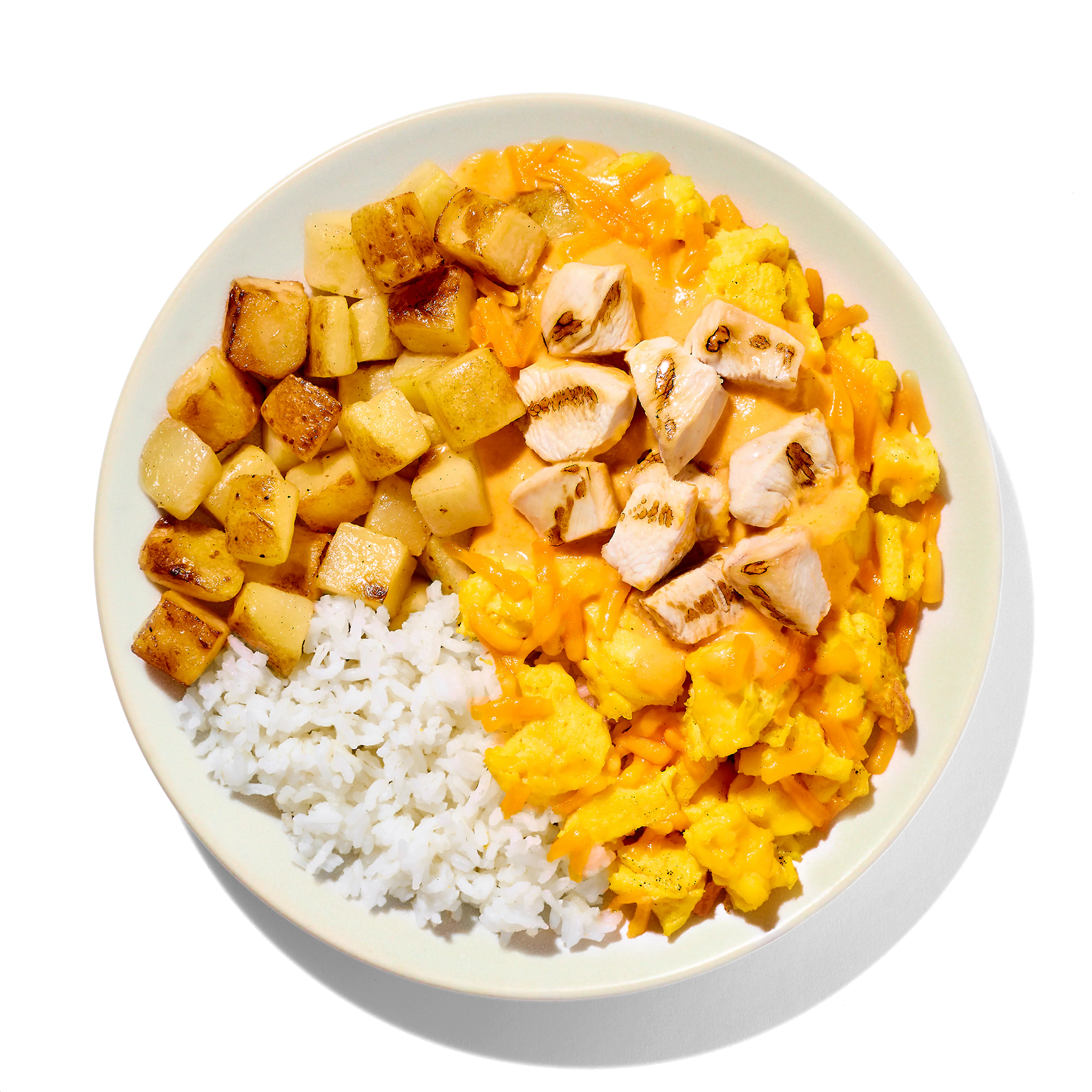 Gold Potatoes, Scrambled Eggs (Whole Eggs, Whole Milk, Corn Starch, Sea Salt, Ground White Pepper), Cooked Long Grain White Rice (Water, White Rice), Diced Chicken Breast Meat With Rib Meat (Skinless Boneless Chicken Breast Meat With Rib Meat, Water, Potato Starch, Vinegar, Sea Salt), Chipotle Cheddar Sauce (Water, Half And Half [milk, Cream], Cheddar Cheese [pasteurized Milk, Cheese Cultures, Salt, Annatto, Enzymes], Modified Food Starch, Sodium Citrate, Salt, Chipotle Chili Pepper, Annatto, Dehydrated Onion, Dehydrated Garlic, Lactic Acid), Shredded Sharp Cheddar Cheese (Cheddar Cheese [pasteurized Milk, Cheese Culture, Salt, Enzymes, Annatto {color}], Potato Starch And Powdered Cellulose [to Prevent Caking]).