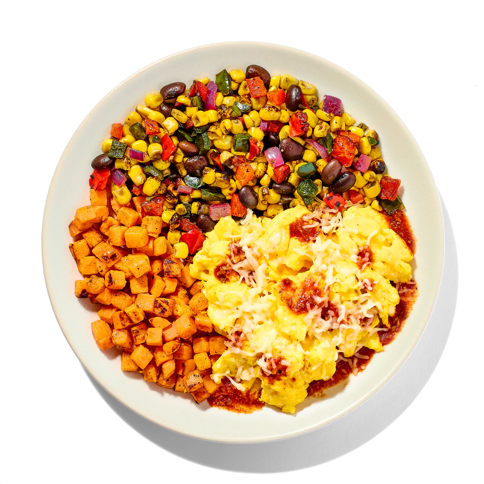 FIRE ROASTED SOUTHWEST STYLE CORN BLEND (CORN, RED BELL PEPPERS, POBLANO PEPPERS, RED ONIONS, BLACK BEANS), SCRAMBLED EGG WHITES (EGG WHITES, WHOLE MILK, CORN STARCH, SEA SALT, ANNATTO COLOR, WHITE PEPPER), SWEET POTATOES, SCRAMBLED EGGS (WHOLE EGGS, WHOLE MILK, CORN STARCH, SEA SALT, GROUND WHITE PEPPER), CHIPOTLE SALSA (TOMATOES, ONION, WATER, JALAPENO PEPPERS, CHIPOTLE SAUCE [WATER, VINEGAR, CHIPOTLE JALAPENO, TOMATO PASTE, SALT, DRIED RED CHILE, SPICES, ONION POWDER, GARLIC POWDER], GARLIC, CILANTRO, SALT, MODIFIED CORN STARCH, WHITE DISTILLED VINEGAR, LEMON JUICE CONCENTRATE, ANCHO CHILI PEPPER, CITRIC ACID, CHIPOTLE CHILI PEPPER, CUMIN), SHREDDED MONTEREY JACK CHEESE (MONTERY JACK CHEESE [PASTEURIZED MILK, CHEESE CULTURES, SALT, ENZYMES], POWDERED CELLULOSE [TO PREVENT CAKING]).