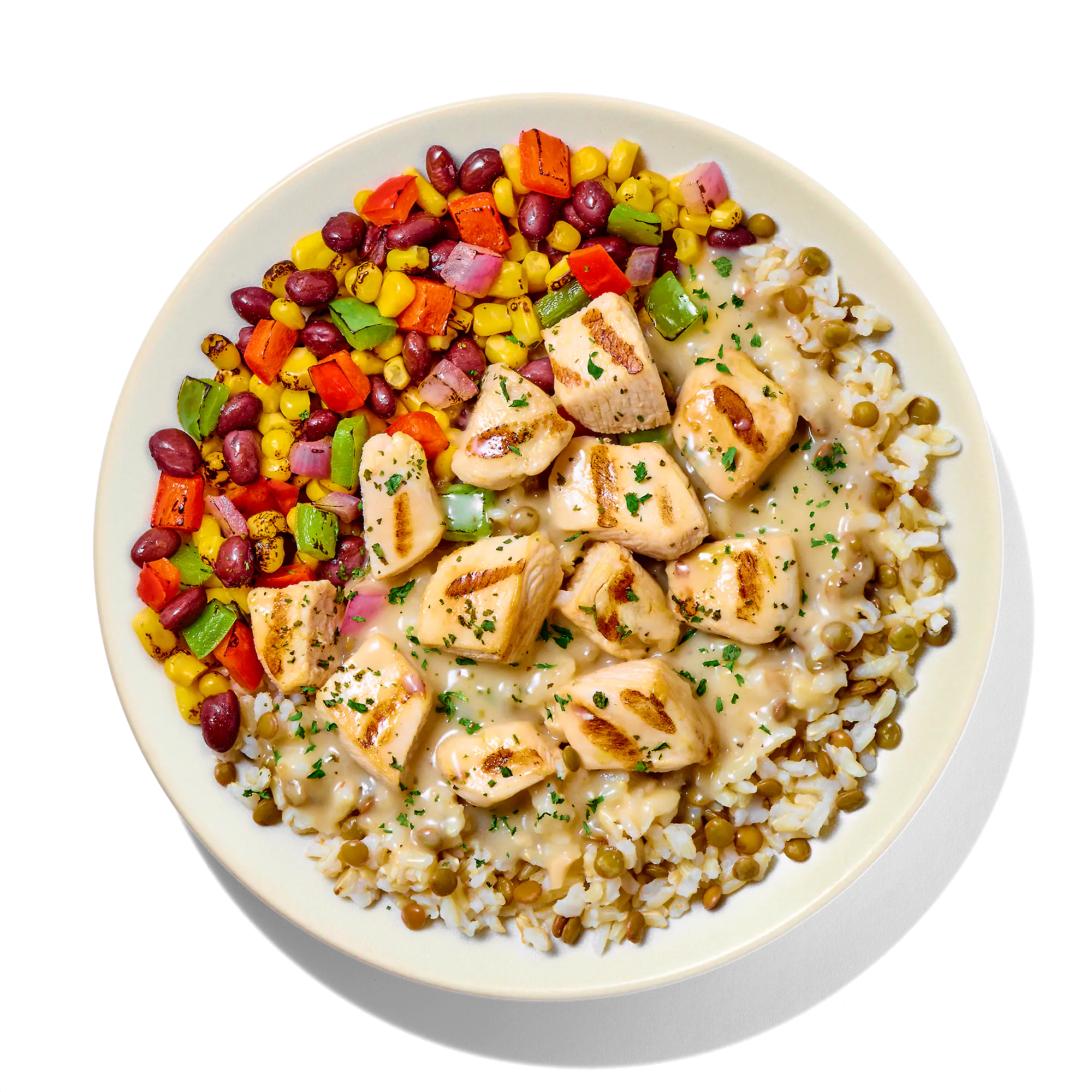COOKED GREEN LENTILS (WATER, GREEN LENTILS), FIRE ROASTED SOUTHWEST STYLE CORN BLEND (CORN, RED BELL PEPPERS, POBLANO PEPPERS, RED ONIONS, BLACK BEANS), COOKED BROWN RICE (WATER, BROWN RICE), DICED CHICKEN BREAST MEAT WITH RIB MEAT (SKINLESS BONELESS CHICKEN BREAST MEAT WITH RIB MEAT, WATER, POTATO STARCH, VINEGAR, SEA SALT), LEMON BUTTER SAUCE (WATER, BUTTER [CREAM], HEAVY CREAM, WHITE WINE {CONTAINS SULFITES}, OLIVE OIL, SHALLOT, LEMON JUICE, MODIFIED FOOD STARCH, GARLIC, SALT, CHICKEN BASE [CHICKEN STOCK, SALT, NATURAL FLAVOR, CHICKEN FAT], SUGAR, DEHYDRATED ONION, DEHYDRATED GARLIC, SPICES), LEMON VINAIGRETTE (WATER, AVOCADO OIL, WHITE WINE VINEGAR, SUGAR, OLIVE OIL, LEMON JUICE, SALT, CORN STARCH, SPICES, XANTHAN GUM, DEHYDRATED GARLIC, DEHYDRATED LEMON PEEL, DEHYDRATED ONION), DRIED CILANTRO.