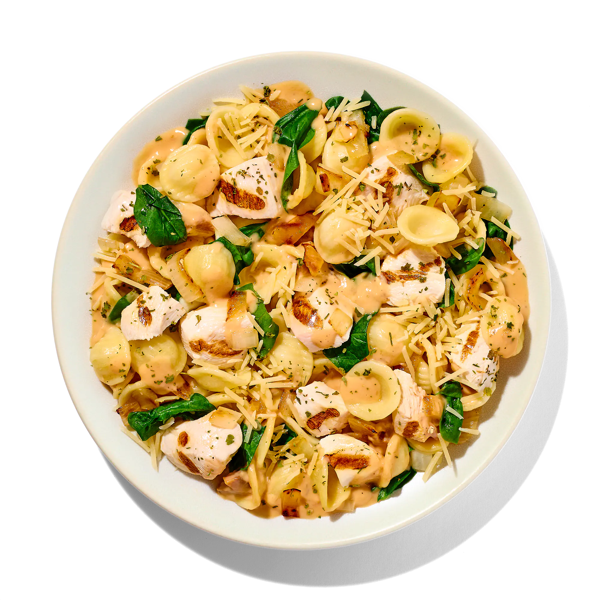 Cooked Enriched Orecchiette Pasta (Water, Semolina [Wheat], Niacin, Iron [Ferrous Sulfate], Thiamine Mononitrate, Riboflavin, Folic Acid), Diced Chicken Breast Meat With Rib Meat (Skinless Boneless Chicken Breast Meat With Rib Meat, Water, Potato Starch, Vinegar, Sea Salt), Creamy Mushroom Sauce (Water, Mushrooms, Heavy Cream, Onions, Food Starch - Modified, Gum Arabic, Olive Oil, Salt, Worcestershire Sauce Concentrate [Distilled Vinegar, Molasses, Corn Syrup, Water, Salt, Caramel Color, Garlic Powder, Sugar, Spices, Tamarind, Natural Flavor], Concentrated Beef Broth, Sodium Phosphate, Soy Lecithin, Yeast Extract, Tomato Paste, Garlic, Natural Beef Flavor, Sugar, Vinegar, Spices, Ground Mustard Seed, Natural Vegetarian Flavor [Water, Onion, Carrot, Celery], Natural Flavor, Caramel Color, Lactic Acid, Guar Gum, Onion Juice Concentrate, Calcium Lactate, Fruit Pectin, White Wine), Spinach, Yellow Onion, Shredded Parmesan Cheese (Pasteurized Milk, Cheese Cultures, Salt, Enzymes), Salted Butter (Cream, Salt), Dried Parsley.