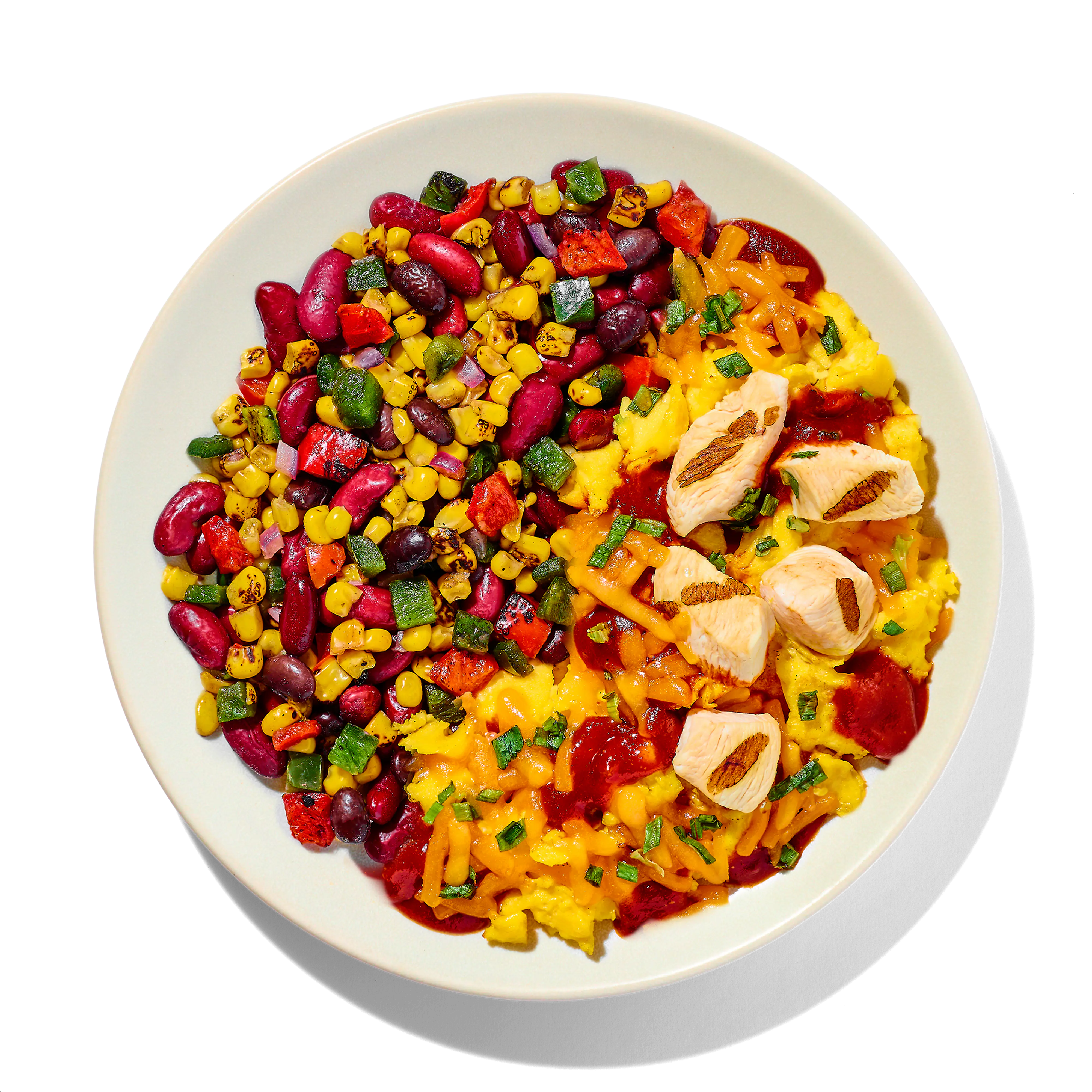 Cooked Red Kidney Beans (Red Kidney Beans, Water), Fire Roasted Southwest Style Corn Blend (Corn, Red Bell Peppers, Poblano Peppers, Red Onions, Black Beans), Scrambled Eggs (Whole Eggs, Whole Milk, Corn Starch, Sea Salt, Ground White Pepper), Guajillo Chile Pepper Sauce (Water, Tomato Paste, Chili Pepper, Olive Oil, Guajillo Chile Powder, Salt, Sugar, Food Starch - Modified, Spice, Onion Powder, Onion Juice Concentrate, Garlic Powder, Guar Gum), Scrambled Egg Whites (Egg Whites, Whole Milk, Corn Starch, Sea Salt, Annatto Color, White Pepper), Diced Chicken Breast Meat With Rib Meat (Skinless Boneless Chicken Breast Meat With Rib Meat, Water, Potato Starch, Vinegar, Sea Salt), Shredded Sharp Cheddar Cheese (Cheddar Cheese [Pasteurized Milk, Cheese Culture, Salt, Enzymes, Annatto {Color}], Potato Starch And Powdered Cellulose [To Prevent Caking]), Brown Sugar Bbq Sauce (Corn Syrup, Water, Tomato Paste, Brown Sugar, Distilled Vinegar, Modified Food Starch, Salt, Natural Smoke Flavor, Worcestershire Sauce [distilled Vinegar, Water, Molasses, Corn Syrup, Salt, Caramel Color, Dehydrated Garlic, Sugar, Tamarind, Natural Flavors {celery}], Pineapple Juice Concentrate, Citric Acid, Caramel Color, Spices, Dehydrated Garlic), Dried Green Onion.