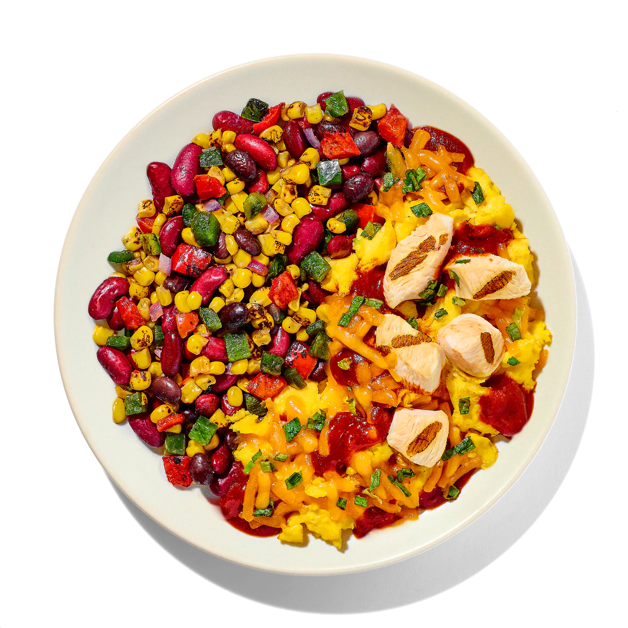 COOKED RED KIDNEY BEANS (RED KIDNEY BEANS, WATER), FIRE ROASTED SOUTHWEST STYLE CORN BLEND (CORN, RED BELL PEPPERS, POBLANO PEPPERS, RED ONIONS, BLACK BEANS), SCRAMBLED EGGS (WHOLE EGGS, WHOLE MILK, CORN STARCH, SEA SALT, GROUND WHITE PEPPER), GUAJILLO CHILE PEPPER SAUCE (WATER, TOMATO PASTE, CHILI PEPPER, OLIVE OIL, GUAJILLO CHILE POWDER, SALT, SUGAR, FOOD STARCH - MODIFIED, SPICE, ONION POWDER, ONION JUICE CONCENTRATE, GARLIC POWDER, GUAR GUM), SCRAMBLED EGG WHITES (EGG WHITES, WHOLE MILK, CORN STARCH, SEA SALT, ANNATTO COLOR, WHITE PEPPER), DICED CHICKEN BREAST MEAT WITH RIB MEAT (SKINLESS BONELESS CHICKEN BREAST MEAT WITH RIB MEAT, WATER, POTATO STARCH, VINEGAR, SEA SALT), SHREDDED SHARP CHEDDAR CHEESE (SHARP CHEDDAR CHEESE [PASTEURIZED MILK, CHEESE CULTURES, SALT, ENZYMES, ANNATTO {COLOR}], POWDERED CELLULOSE [TO PREVENT CAKING]), BROWN SUGAR BBQ SAUCE (CORN SYRUP, WATER, TOMATO PASTE, BROWN SUGAR, DISTILLED VINEGAR, MODIFIED FOOD STARCH, SALT, NATURAL SMOKE FLAVOR, WORCESTERSHIRE SAUCE [DISTILLED VINEGAR, WATER, MOLASSES, CORN SYRUP, SALT, CARAMEL COLOR, DEHYDRATED GARLIC, SUGAR, TAMARIND, NATURAL FLAVORS {CELERY}], PINEAPPLE JUICE CONCENTRATE, CITRIC ACID, CARAMEL COLOR, SPICES, DEHYDRATED GARLIC), DRIED GREEN ONION.