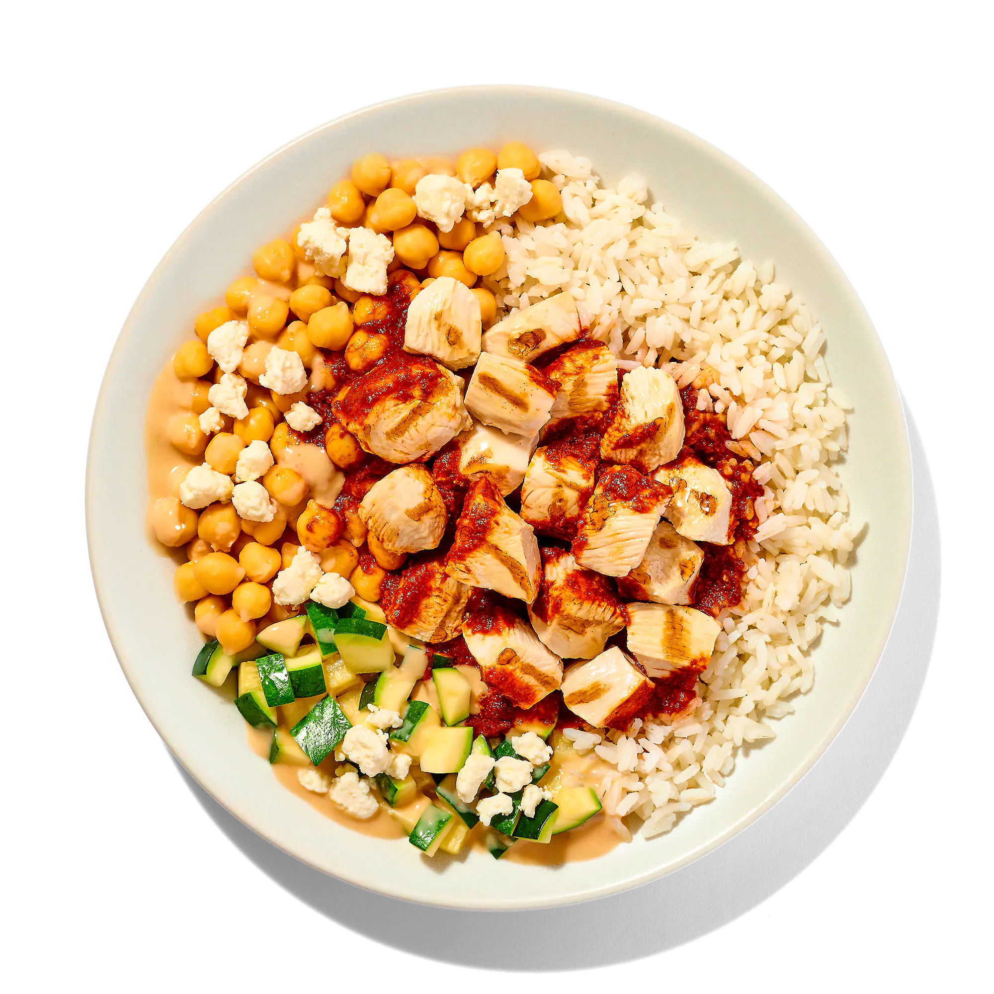 COOKED CHICKPEAS (CHICKPEAS, WATER), DICED CHICKEN BREAST MEAT WITH RIB MEAT (SKINLESS BONELESS CHICKEN BREAST MEAT WITH RIB MEAT, WATER, POTATO STARCH, VINEGAR, SEA SALT), COOKED LONG GRAIN WHITE RICE (WATER, WHITE RICE), GARLIC TAHINI SAUCE (WATER, GROUND SESAME SEEDS, OLIVE OIL, GUM ARABIC, FOOD STARCH - MODIFIED, GARLIC, SUGAR, SALT, LEMON JUICE CONCENTRATE, SMOKED PAPRIKA), ZUCCHINI, FETA CHEESE (FETA CHEESE [PASTEURIZED MILK, SALT, CHEESE CULTURES, ENZYMES], POTATO STARCH [TO PREVENT CAKING]), HARISSA (DRIED CHILI PEPPERS, LEMON JUICE, GARLIC, OLIVE OIL, CORIANDER SEEDS, CUMIN, SALT).