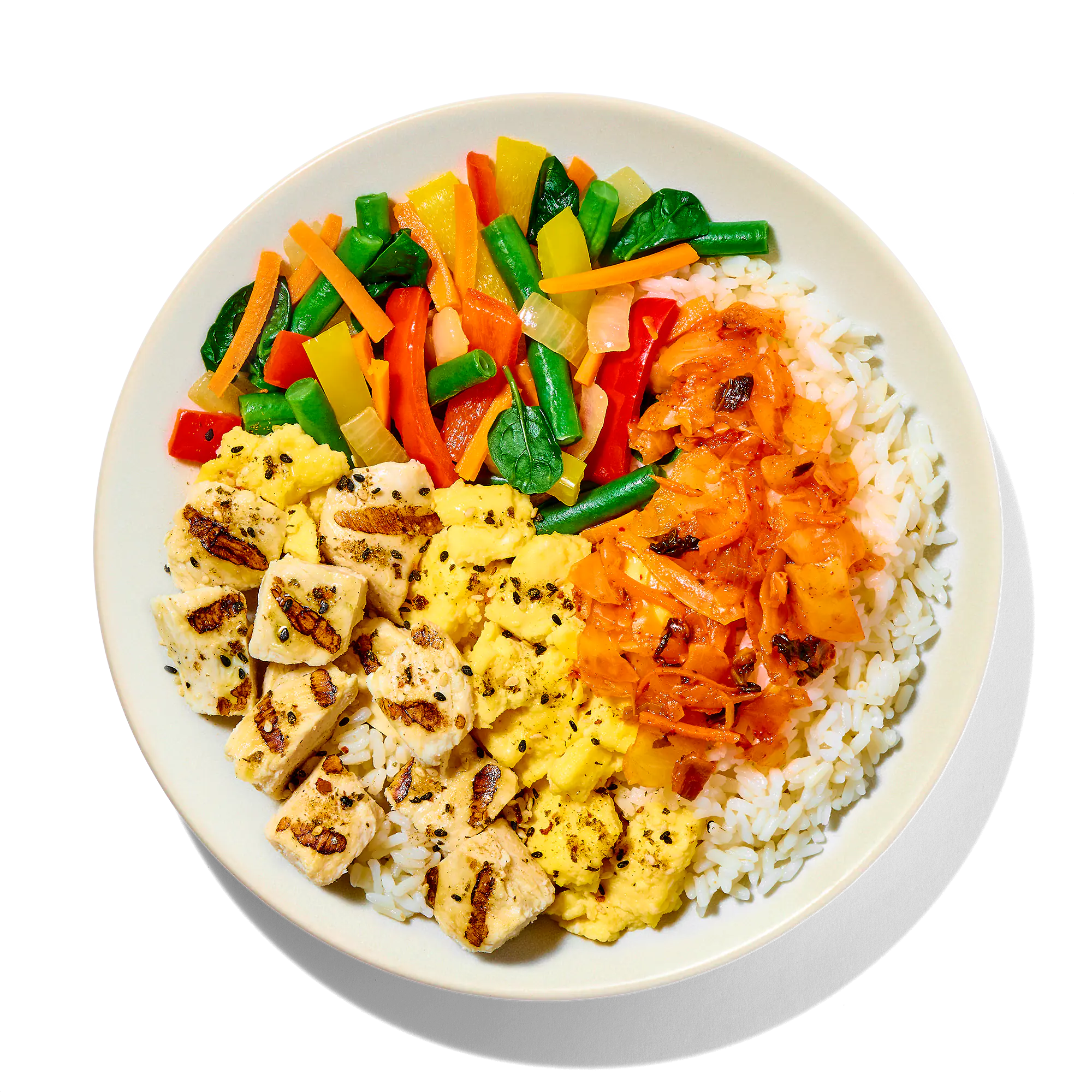 COOKED LONG GRAIN WHITE RICE (WATER, WHITE RICE), DICED CHICKEN BREAST MEAT WITH RIB MEAT (SKINLESS BONELESS CHICKEN BREAST MEAT WITH RIB MEAT, WATER, POTATO STARCH, VINEGAR, SEA SALT), SCRAMBLED EGGS (WHOLE EGGS, WHOLE MILK, CORN STARCH, SEA SALT, GROUND WHITE PEPPER), SPINACH, AROMATICS (OLIVE OIL, GARLIC, GREEN ONIONS, GINGER, YELLOW ONIONS, WATER, SALT, GUAR GUM, XANTHAN GUM), KIMCHI (GREEN CABBAGE, GARLIC, APPLE, MUSTARD GREENS, SALT, CARROT, SUGAR, GREEN ONION, GOCHUGARU RED PEPPER, GINGER), VEGETABLE BLEND (BELL PEPPER, GREEN BEANS, YELLOW ONION, CARROTS), FURIKAKE SEASONING BLEND (SESAME SEEDS, SALT, SPICES, SEAWEED FLAKES, SHITAKE MUSHROOM POWDER, WHITE MISO POWDER [SOYBEAN, RICE, SALT], TOASTED SESAME OIL).