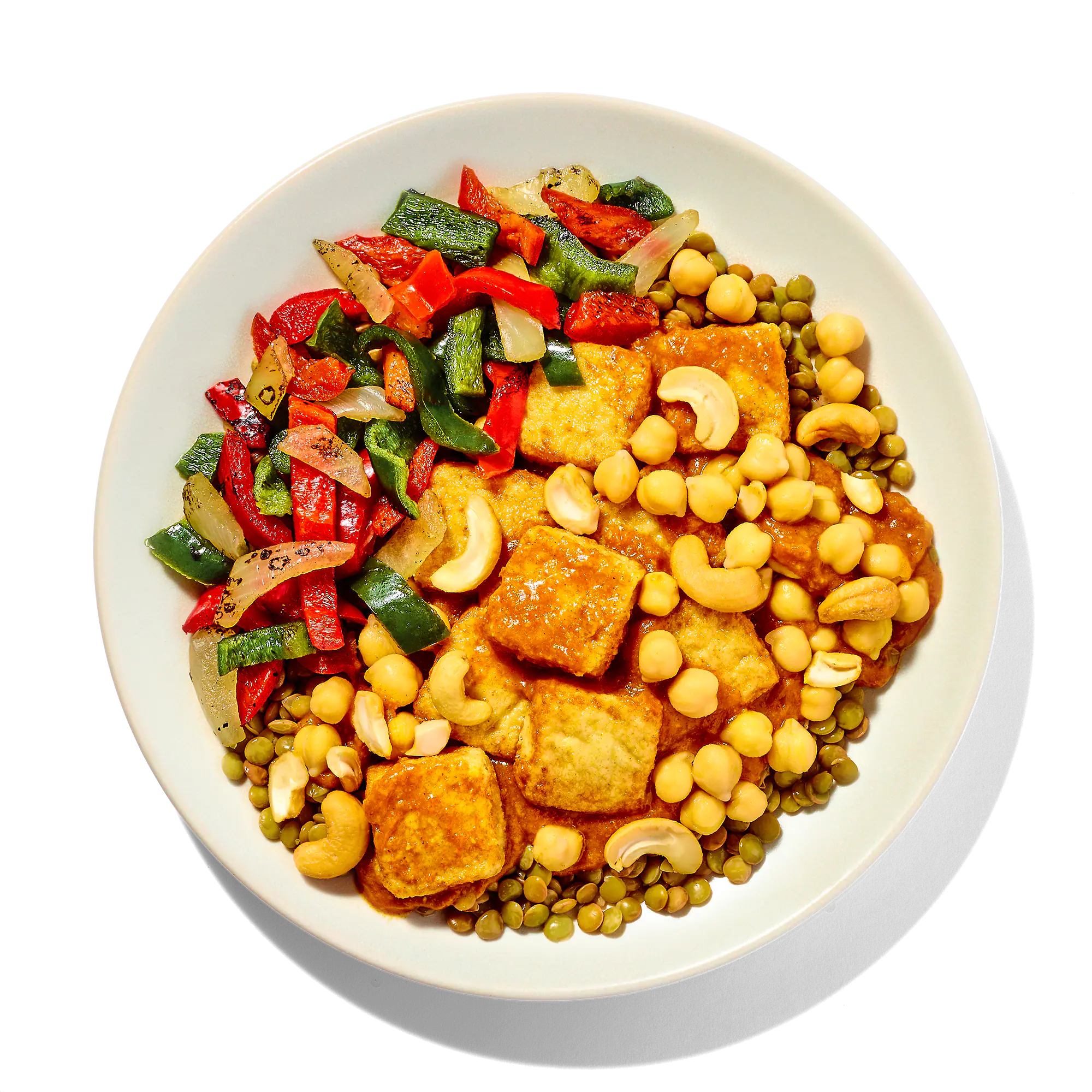 COOKED GREEN LENTILS (WATER, GREEN LENTILS), FRIED TOFU PIECES (SOYMILK [WATER, SOYBEANS], WATER, DEXTRIN, MODIFIED CORN STARCH, DEXTROSE, RAPESEED OIL, MAGNESIUM CHLORIDE, CALCIUM SULFATE), ONION AND PEPPER BLEND (ONIONS, RED BELL PEPPERS, POBLANO PEPPERS), BUTTER SAUCE (HEAVY CREAM, TOMATO PUREE, TOMATO PASTE, BUTTER [SWEET CREAM, LACTIC ACID], SALT, SPICES, GARLIC, GINGER, FOOD STARCH-MODIFIED, PAPRIKA [COLOR]), COOKED CHICKPEAS (CHICKPEAS, WATER), SALTED CASHEWS (CASHEWS, SALT).