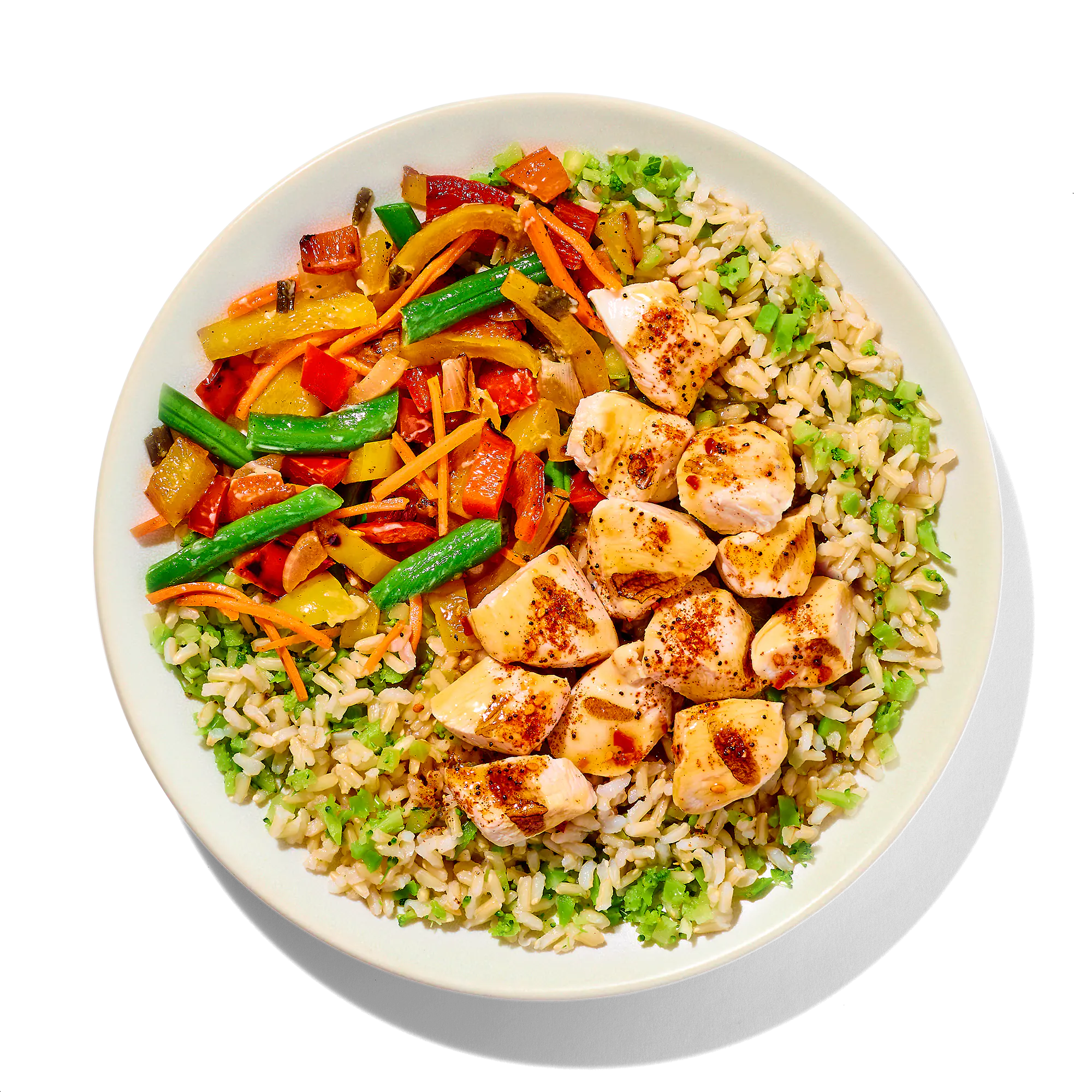 COOKED BROWN RICE (WATER, BROWN RICE), DICED CHICKEN BREAST MEAT WITH RIB MEAT (SKINLESS BONELESS CHICKEN BREAST MEAT WITH RIB MEAT, WATER, POTATO STARCH, VINEGAR, SEA SALT), VEGETABLE BLEND (BELL PEPPER, GREEN BEANS, YELLOW ONION, CARROTS), ORANGE SAUCE (WATER, SUGAR, ORANGE JUICE CONCENTRATE, SOY SAUCE [WATER, WHEAT, SOYBEANS, SALT], SEASONED RICE VINEGAR [RICE VINEGAR, WATER, SUGAR, SALT], CORN STARCH, GARLIC, CHICKEN BASE [CHICKEN STOCK, SALT, NATURAL FLAVOR, CHICKEN FAT], SAUCIER [MODIFIED GUM ACACIA, MODIFIED TAPIOCA STARCH, XANTHAN GUM], SALT, RED CHILI PEPPER, GINGER), RICED BROCCOLI (BROCCOLI), AROMATICS (OLIVE OIL, GARLIC, GREEN ONIONS, GINGER, YELLOW ONIONS, WATER, SALT, GUAR GUM, XANTHAN GUM), SEASONING BLEND (SWEET & HOT PAPRIKA, DRIED ORANGE PEELS, POPPY SEEDS, TOASTED SESAME SEEDS, ROASTED BLACK SESAME SEEDS).