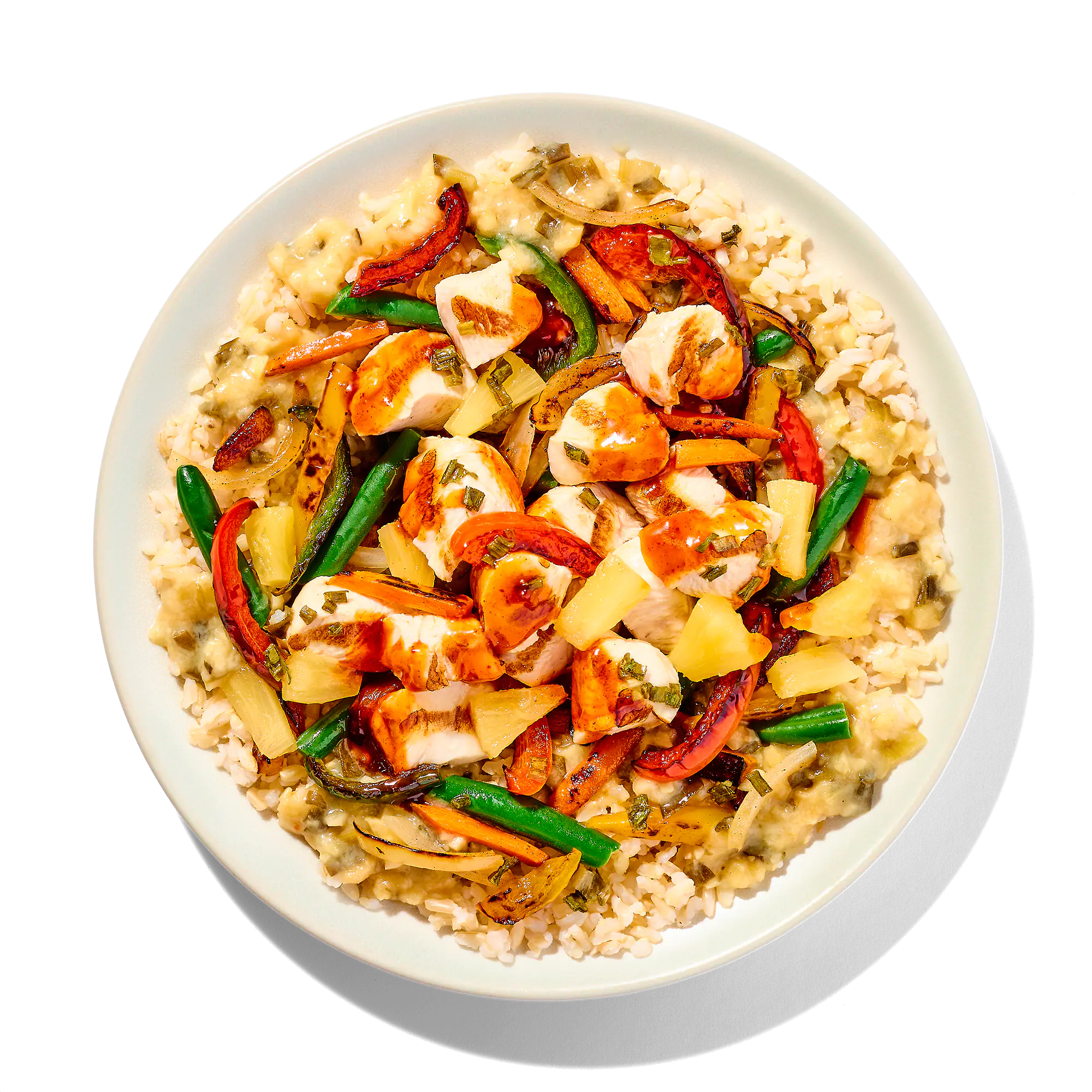 COOKED BROWN RICE (WATER, BROWN RICE), DICED CHICKEN BREAST MEAT WITH RIB MEAT (SKINLESS BONELESS CHICKEN BREAST MEAT WITH RIB MEAT, WATER, POTATO STARCH, VINEGAR, SEA SALT), AROMATICS (OLIVE OIL, GARLIC, GREEN ONIONS, GINGER, YELLOW ONIONS, WATER, SALT, GUAR GUM, XANTHAN GUM), VEGETABLE BLEND (BELL PEPPER, GREEN BEANS, YELLOW ONION, CARROTS), ONION AND PEPPER BLEND (ONIONS, RED BELL PEPPERS, POBLANO PEPPERS), SWEET HEAT SAUCE (SUGAR, BROWN RICE SYRUP, KETCHUP [TOMATO CONCENTRATE, SUGAR, DISTILLED VINEGAR, SALT, LESS THAN 2% OF ONION POWDER, SPICES, NATURAL FLAVORS], SOY SAUCE [WATER, SOYBEANS, SALT, SUGAR], ONIONS, SOYBEAN PASTE [WATER, SOYBEANS, RICE, SALT], UNSULFURED MOLASSES, OLIVE OIL, GARLIC, TOASTED SESAME OIL, CHILI PEPPER, SALT, WATER, GARLIC POWDER, EXTRACTIVE OF PAPRIKA [COLOR], NATURAL FLAVOR), PINEAPPLE, DRIED GREEN ONION.