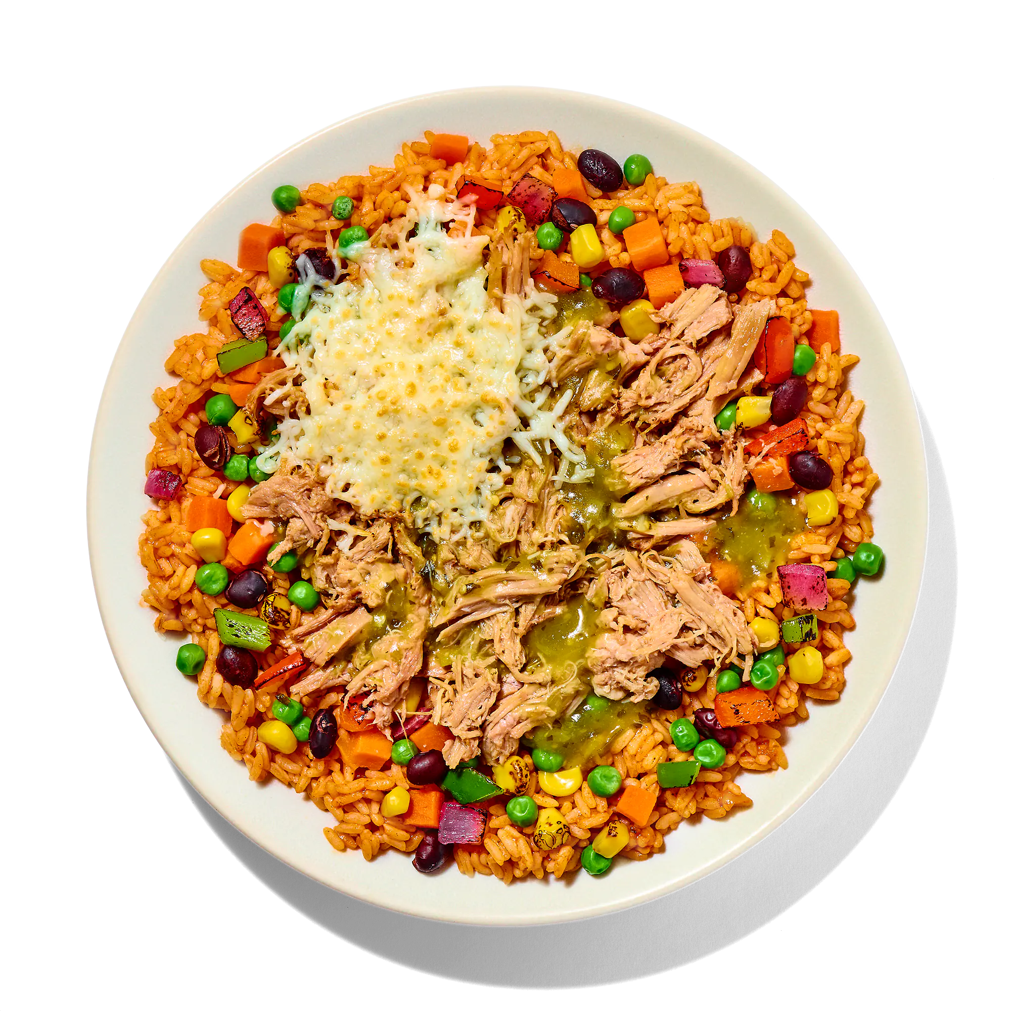 SEASONED RICE (COOKED WHITE RICE [WATER, WHITE RICE], SEASONING [WATER, DEHYDRATED ONION, SALT, TOMATO POWDER, PAPRIKA, DEHYDRATED GREEN AND RED BELL PEPPER, DEHYDRATED TOMATO, YEAST EXTRACT, SPICES, DEHYDRATED GARLIC]), FIRE ROASTED SOUTHWEST STYLE CORN BLEND (CORN, RED BELL PEPPERS, POBLANO PEPPERS, RED ONIONS, BLACK BEANS), FULLY COOKED PULLED PORK CONTAINS UP TO 5% SOLUTION (WATER, SALT), CARROTS, TOMATILLO SAUCE (GROUND TOMATILLO [GREEN TOMATILLOS, SALT, CITRIC ACID], WATER, JALAPENO PEPPER, MODIFIED FOOD STARCH, CILANTRO, GREEN ONION, CHICKEN BASE [CHICKEN MEAT INCLUDING NATURAL CHICKEN JUICES, SEA SALT, CHICKEN FAT, VEGETABLE EXTRACT {POTATO, CARROT, ONION}, YEAST EXTRACT, NATURAL FLAVORS, TURMERIC], SALT, DEHYDRATED GARLIC, DEHYDRATED ONION, SPICES), SHREDDED MONTEREY JACK CHEESE (MONTERY JACK CHEESE [PASTEURIZED MILK, CHEESE CULTURES, SALT, ENZYMES], POWDERED CELLULOSE [TO PREVENT CAKING]), GREEN PEAS.