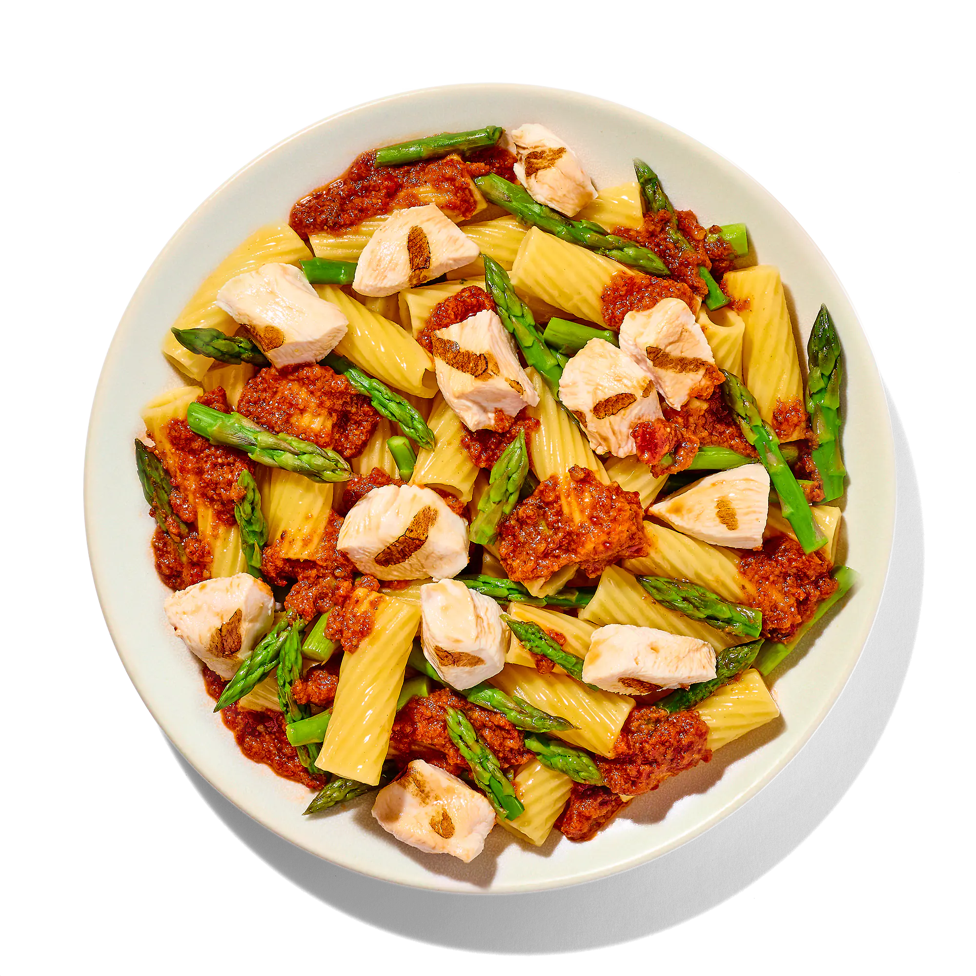 Cooked Enriched Rigatoni Pasta (Water, Durum Wheat Semolina, Niacin, Iron [ferrous Sulfate], Thiamine Mononitrate, Riboflavin, Folic Acid), Diced Chicken Breast Meat With Rib Meat (Skinless Boneless Chicken Breast Meat With Rib Meat, Water, Potato Starch, Vinegar, Sea Salt), Asparagus, Tomato Pesto (Water, Pomace Olive Oil, Dried Tomatoes, Parmesan Cheese [pasteurized Part-skim Cows’ Milk, Cheese Cultures, Salt, Enzymes], Onions, Basil, Dehydrated Garlic, Salt, Spices, Xanthan Gum), Red Pepper Sauce (Water, Heavy Cream, Tomato Paste, Red Bell Peppers, Butter [sweet Cream, Lactic Acid], Garlic, Capers [capers, Water, Salt, Vinegar], Gum Arabic, Salt, Food Starch - Modified, Calabrian Chiles [dried Chiles, Salt], Vinegar), Lemon Caper Butter (Butter [cream, Salt], Capers, Lemon Juice, Sugar, Garlic, Onion Powder, Salt, Black Pepper, Lemon Powder, Corn Starch).