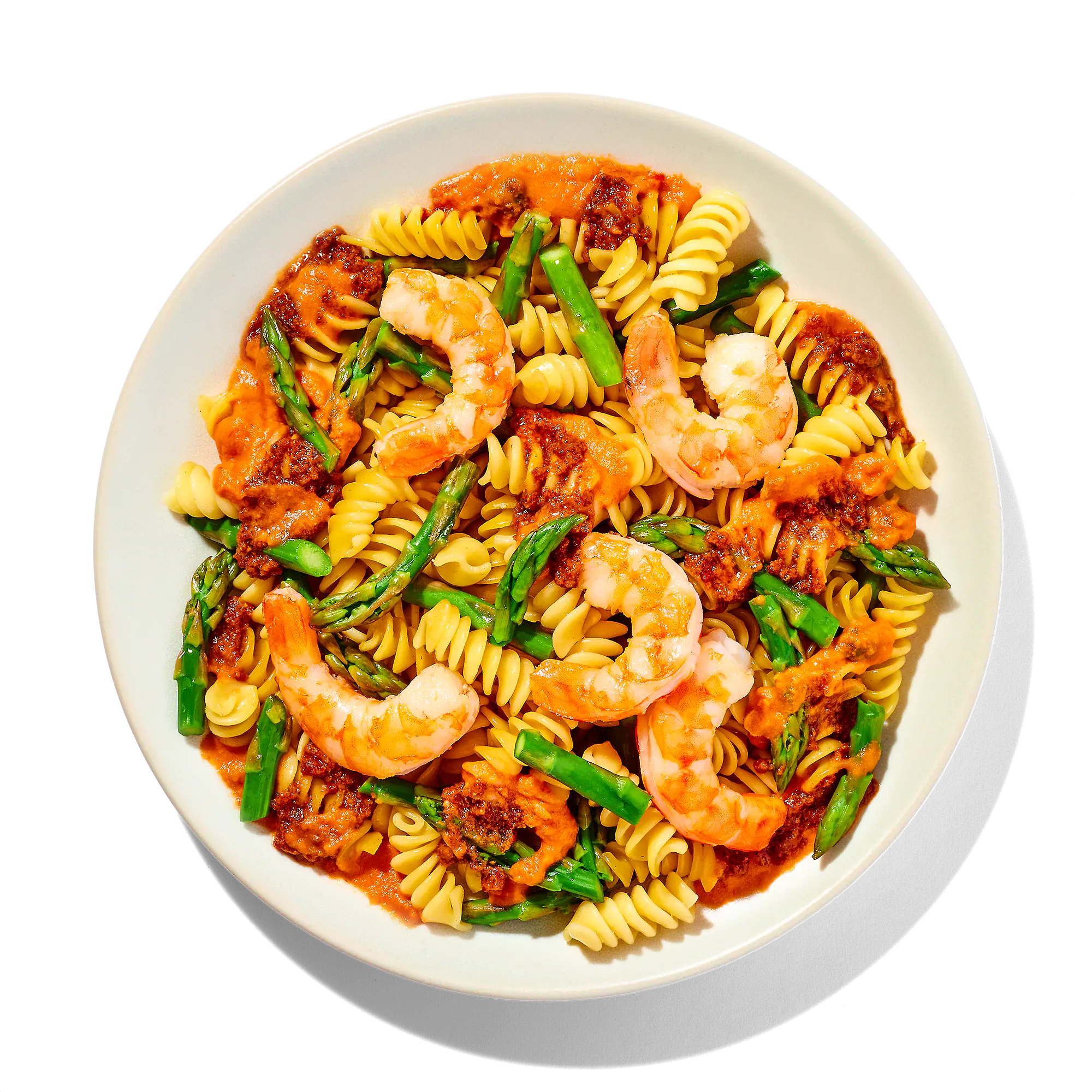 Cooked Enriched Rotini Pasta (Water, Durum Wheat Semolina, Niacin, Iron [Ferrous Sulfate], Thiamin Mononitrate, Riboflavin, Folic Acid), Cooked Shrimp (Shrimp, Salt, Sodium Tripolyphosphate), Asparagus, Red Pepper Sauce (Water, Heavy Cream, Tomato Paste, Red Bell Peppers, Butter [Sweet Cream, Lactic Acid], Garlic, Capers [Capers, Water, Salt, Vinegar], Gum Arabic, Salt, Food Starch - Modified, Calabrian Chiles [Dried Chiles, Salt], Vinegar), Tomato Pesto (Water, Pomace Olive Oil, Dried Tomatoes, Parmesan Cheese [pasteurized Part-skim Cows’ Milk, Cheese Cultures, Salt, Enzymes], Onions, Basil, Dehydrated Garlic, Salt, Spices, Xanthan Gum), Lemon Caper Butter (Butter [Cream, Salt], Capers, Lemon Juice, Sugar, Garlic, Onion Powder, Salt, Black Pepper, Lemon Powder, Corn Starch).