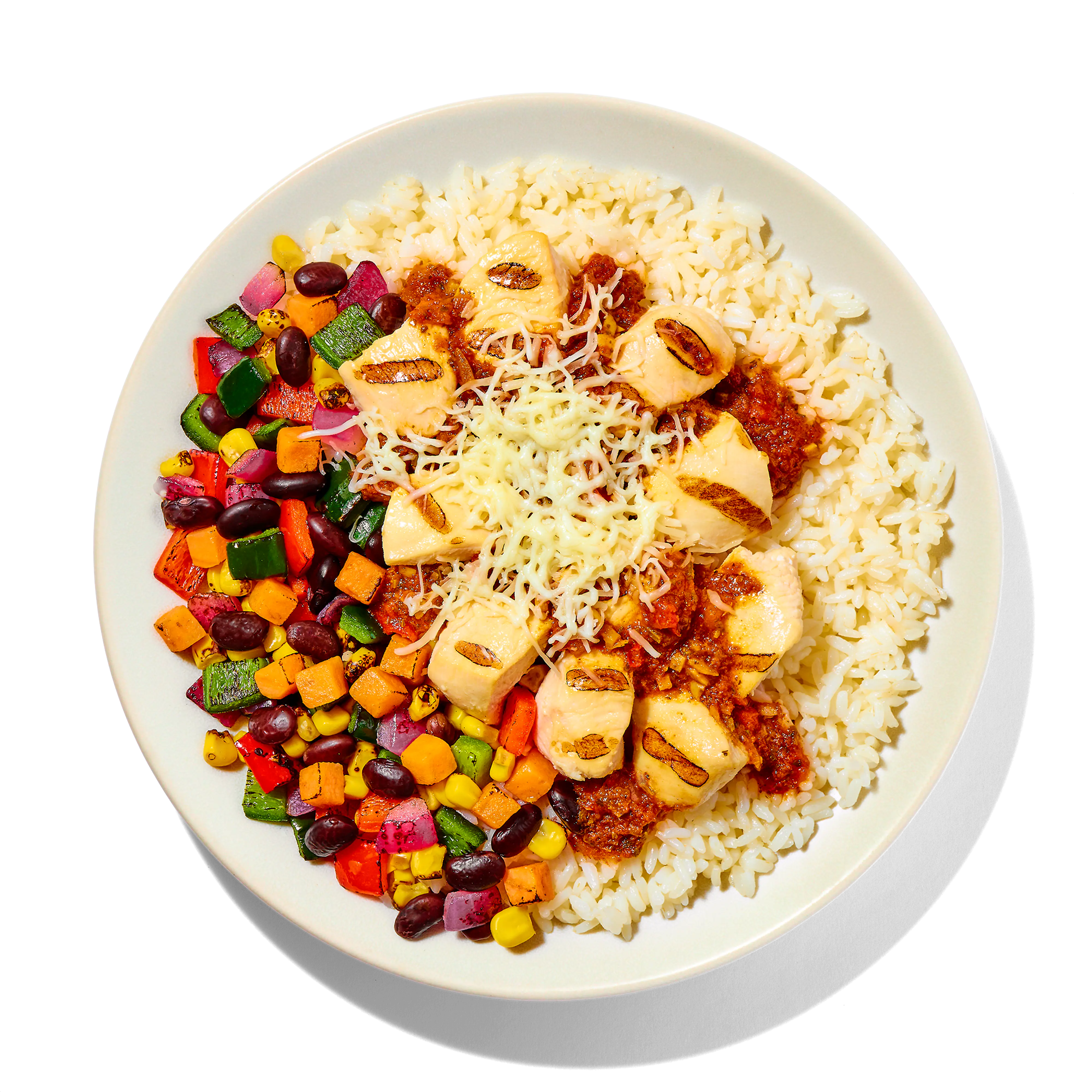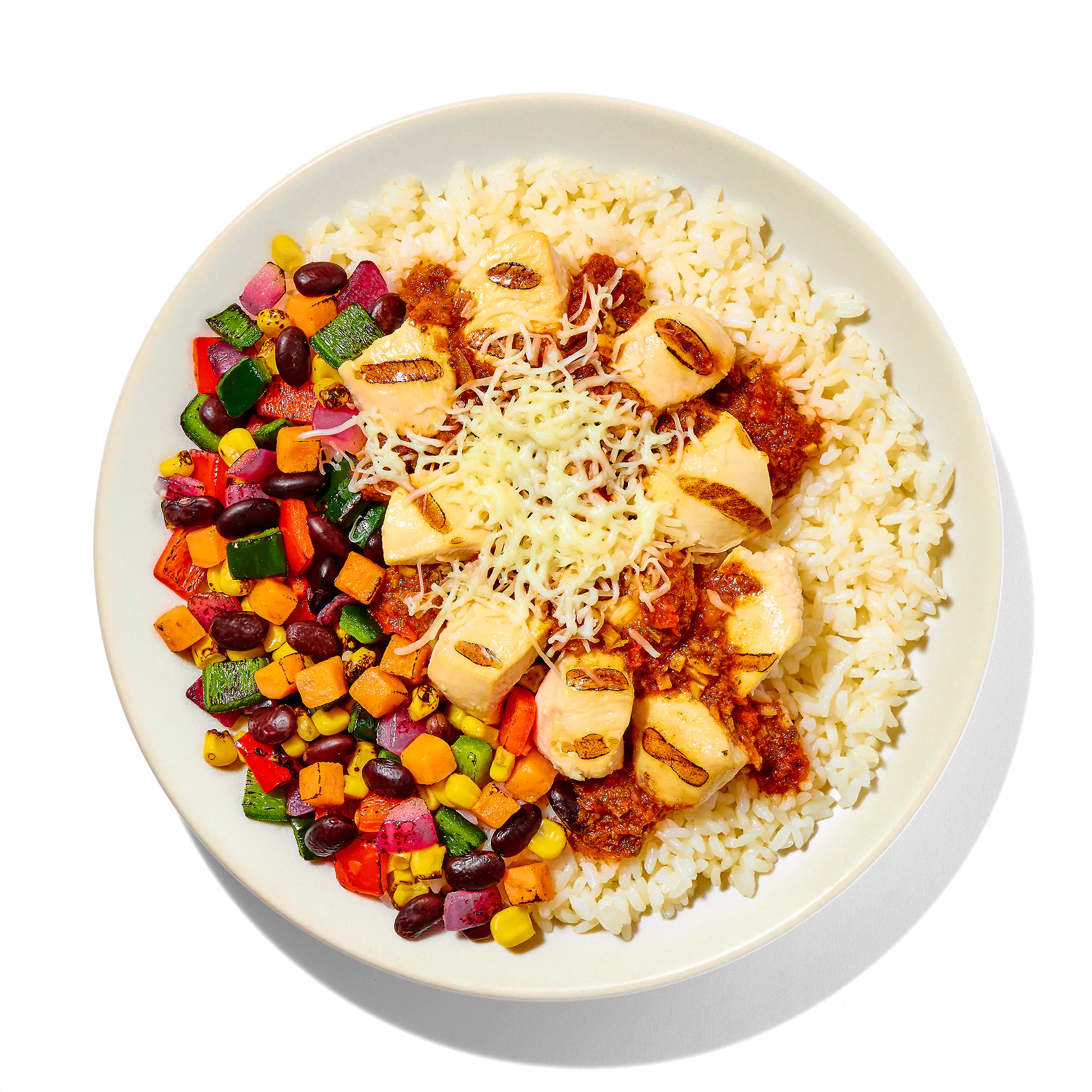 COOKED LONG GRAIN WHITE RICE (WATER, WHITE RICE), FIRE ROASTED SOUTHWEST STYLE CORN BLEND (CORN, RED BELL PEPPERS, POBLANO PEPPERS, RED ONIONS, BLACK BEANS), DICED CHICKEN BREAST MEAT WITH RIB MEAT (SKINLESS BONELESS CHICKEN BREAST MEAT WITH RIB MEAT, WATER, POTATO STARCH, VINEGAR, SEA SALT), SWEET POTATOES, SHREDDED MONTEREY JACK CHEESE (MONTERY JACK CHEESE [PASTEURIZED MILK, CHEESE CULTURES, SALT, ENZYMES], POWDERED CELLULOSE [TO PREVENT CAKING]), ROJO SAUCE (WATER, CRUSHED TOMATOES IN PUREE [TOMATOES, TOMATO PUREE, CALCIUM CHLORIDE, CITRIC ACID], OLIVE OIL, TOMATO PASTE, FLOUR BLEND [RICE FLOUR, WHOLE GRAIN BROWN RICE FLOUR, WHOLE SORGHUM FLOUR, TAPIOCA STARCH, POTATO STARCH, CELLULOSE, XANTHAN GUM, VITAMIN AND MINERAL BLEND {CALCIUM CARBONATE, NIACINAMIDE (VITAMIN B3), REDUCED IRON, THIAMIN HYDROCHLORIDE (VITAMIN B1), RIBOFLAVIN (VITAMIN B2)}], SPICES, APPLE CIDER VINEGAR, MAPLE SYRUP, CHILI POWDER [SPICES, SALT, DEHYDRATED GARLIC, AND SILICON DIOXIDE ADDED TO PREVENT CAKING], SMOKED PAPRIKA, SEA SALT, DEHYDRATED GARLIC), AROMATICS (ONIONS, GARLIC, RED BELL PEPPERS, OLIVE OIL, CILANTRO, SPICE, WATER, TOMATO PASTE, PAPRIKA [COLOR], CONTAINS 2% OR LESS OF BUTTER [SWEET CREAM, LACTIC ACID], SALT, CITRIC ACID, GUAR GUM, XANTHAN GUM), SALTED BUTTER (CREAM, SALT).