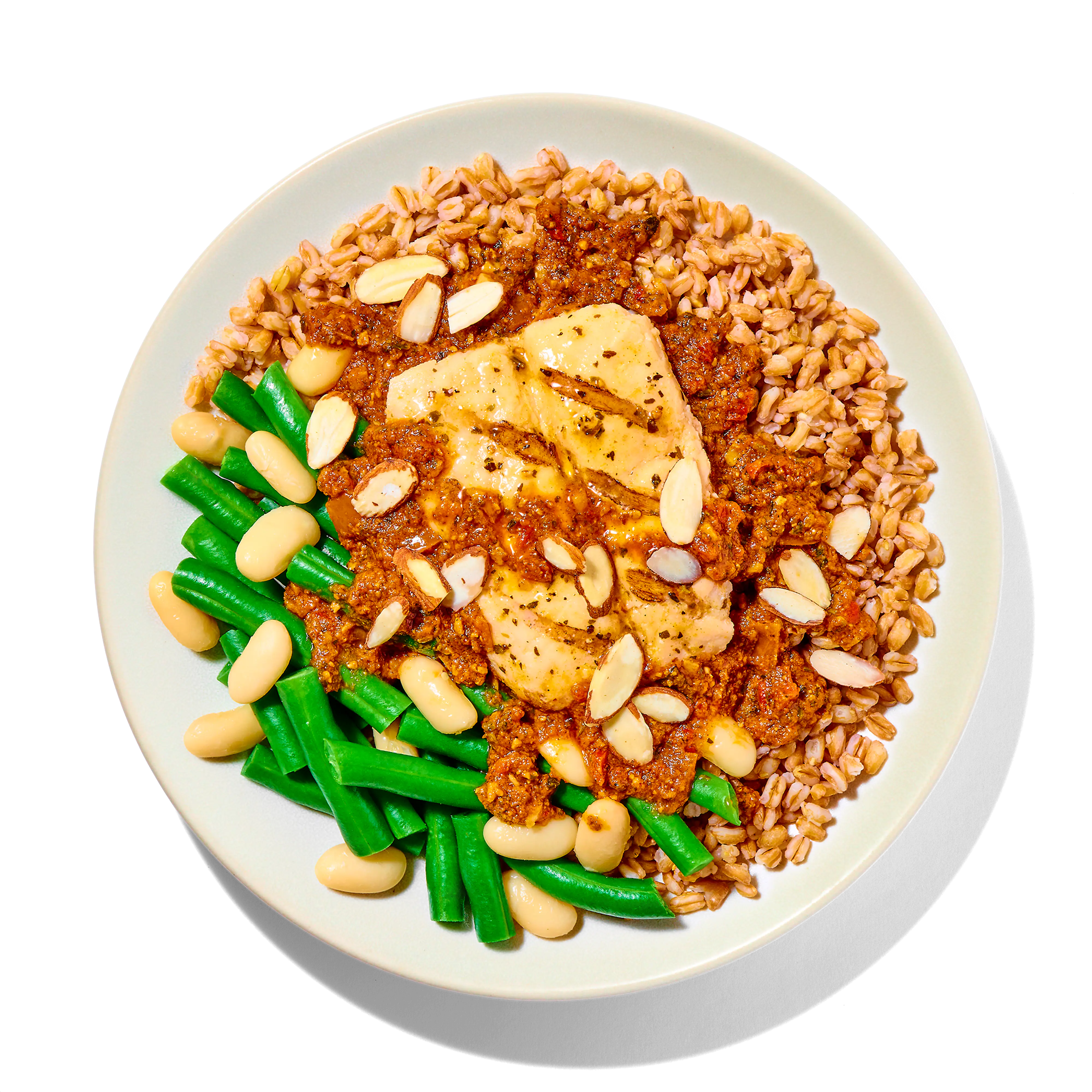 COOKED FARRO (FARRO, WATER), GRILLED FULLY COOKED SALMON (PINK AND/OR KETA SALMON, WATER, CONTAINS 2% OR LESS OF: SEA SALT, SUGAR, SODIUM PHOSPHATES, DEHYDRATED GARLIC AND ONION, SPICES, PAPRIKA, XANTHAN GUM, NATURAL FLAVORS, SPICE EXTRACTIVES), COOKED WHITE KIDNEY BEANS, GREEN BEANS, AROMATICS (ONIONS, GARLIC, RED BELL PEPPERS, OLIVE OIL, CILANTRO, SPICE, WATER, TOMATO PASTE, PAPRIKA [COLOR], CONTAINS 2% OR LESS OF BUTTER [SWEET CREAM, LACTIC ACID], SALT, CITRIC ACID, GUAR GUM, XANTHAN GUM), ROMESCO SAUCE (AVOCADO OIL, WATER, ROASTED RED BELL PEPPERS, TOMATOES, ALMONDS, RED WINE VINEGAR, DRIED TOMATOES, PARSLEY, SALT, DEHYDRATED GARLIC, SPICES, PAPRIKA), ALMONDS.