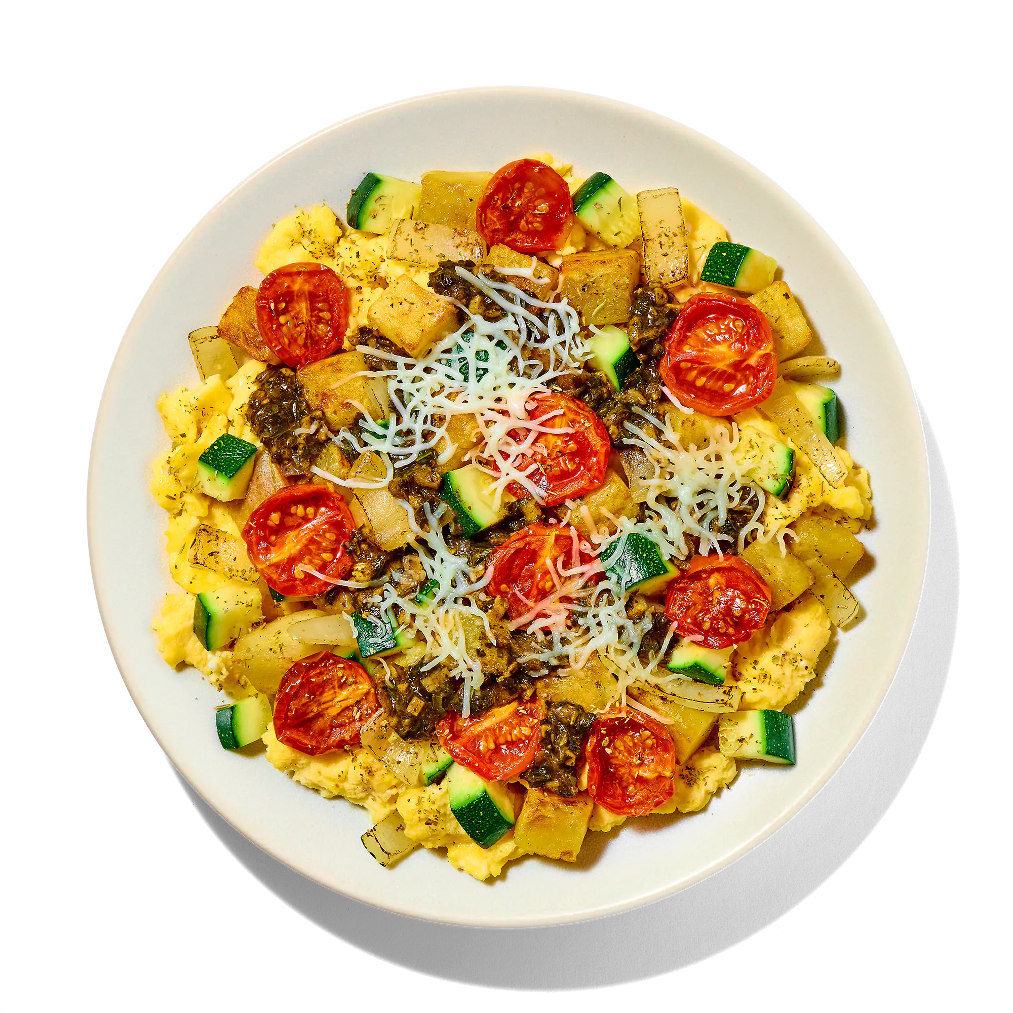 SCRAMBLED EGG WHITES (EGG WHITES, WHOLE MILK, CORN STARCH, SEA SALT, ANNATTO COLOR, WHITE PEPPER), GOLD POTATOES, SCRAMBLED EGGS (WHOLE EGGS, WHOLE MILK, CORN STARCH, SEA SALT, GROUND WHITE PEPPER), ROASTED TOMATOES, GREEN ZUCCHINI, AROMATICS (ONIONS, GARLIC, SPICES, OLIVE OIL, WATER, PARSLEY, CONTAINS 2% OR LESS OF BUTTER [SWEET CREAM, LACTIC ACID], SALT, GUAR GUM, XANTHAN GUM, SPICE EXTRACTIVE), SHREDDED MONTEREY JACK CHEESE (MONTERY JACK CHEESE [PASTEURIZED MILK, CHEESE CULTURES, SALT, ENZYMES], POWDERED CELLULOSE [TO PREVENT CAKING]), YELLOW ONION, SEASONING BLEND (ROSEMARY, OREGANO, BASIL, MARJORAM, THYME).