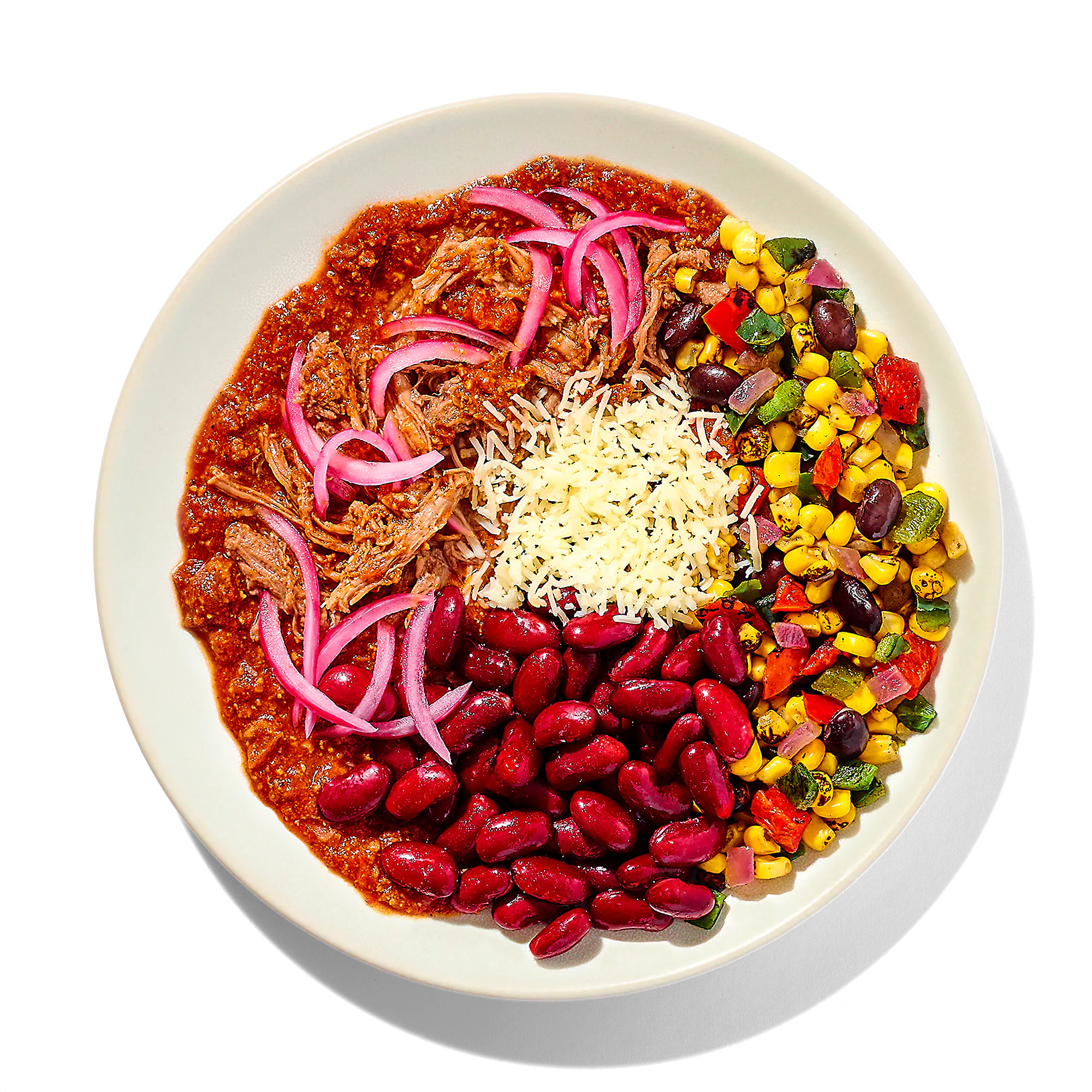 FIRE ROASTED SOUTHWEST STYLE CORN BLEND (CORN, RED BELL PEPPERS, POBLANO PEPPERS, RED ONIONS, BLACK BEANS), SLOPPY JOE TOMATO SAUCE WITH BEEF (CRUSHED TOMATO IN PUREE [TOMATOES, TOMATO PUREE, CITRIC ACID, CALCIUM CHLORIDE], GROUND BEEF, ONION, TAMARI SOY SAUCE [WATER, SOYBEANS, SALT, ALCOHOL], TOMATO PASTE, EXTRA VIRGIN OLIVE OIL, GARLIC, BALSAMIC VINEGAR [CONTAINS SULFITES], MAPLE SYRUP, SALT, SPICES, SMOKED PAPRIKA, DEHYDRATED GARLIC, CHILI POWDER [SPICES, SALT, DEHYDRATED GARLIC, AND SILICON DIOXIDE {TO PREVENT CAKING}], THYME, OREGANO, MARJORAM), COOKED RED KIDNEY BEANS (RED KIDNEY BEANS, WATER), COOKED PULLED BEEF (BEEF LIFTER MEAT), MEATLOAF GLAZE (KETCHUP [TOMATO CONCENTRATE, SUGAR, DISTILLED VINEGAR, SALT, LESS THAN 2% OF SPICES, ONION POWDER, NATURAL FLAVORS], BROWN SUGAR, WATER, TOMATO PASTE, FOOD STARCH - MODIFIED, GROUND MUSTARD SEED, WORCESTERSHIRE SAUCE CONCENTRATE [DISTILLED VINEGAR, MOLASSES, CORN SYRUP, WATER, SALT, CARAMEL COLOR, GARLIC POWDER, SUGAR, SPICES, TAMARIND, NATURAL FLAVOR], SALT), RED ENCHILADA SAUCE (WATER, TOMATO PASTE, SUGAR, CHILI PEPPER, SALT, OLIVE OIL, FOOD STARCH - MODIFIED, DISTILLED WHITE VINEGAR, ONION POWDER, GARLIC POWDER, SPICE), SHREDDED MONTEREY JACK CHEESE (MONTERY JACK CHEESE [PASTEURIZED MILK, CHEESE CULTURES, SALT, ENZYMES], POWDERED CELLULOSE [TO PREVENT CAKING]), PICKLED RED ONIONS (RED ONION, WATER, WHITE WINE VINEGAR, SUGAR, LIME JUICE, DISTILLED VINEGAR, SEA SALT, CITRIC ACID, CALCIUM CHLORIDE [TO PROMOTE CRISPNESS]).