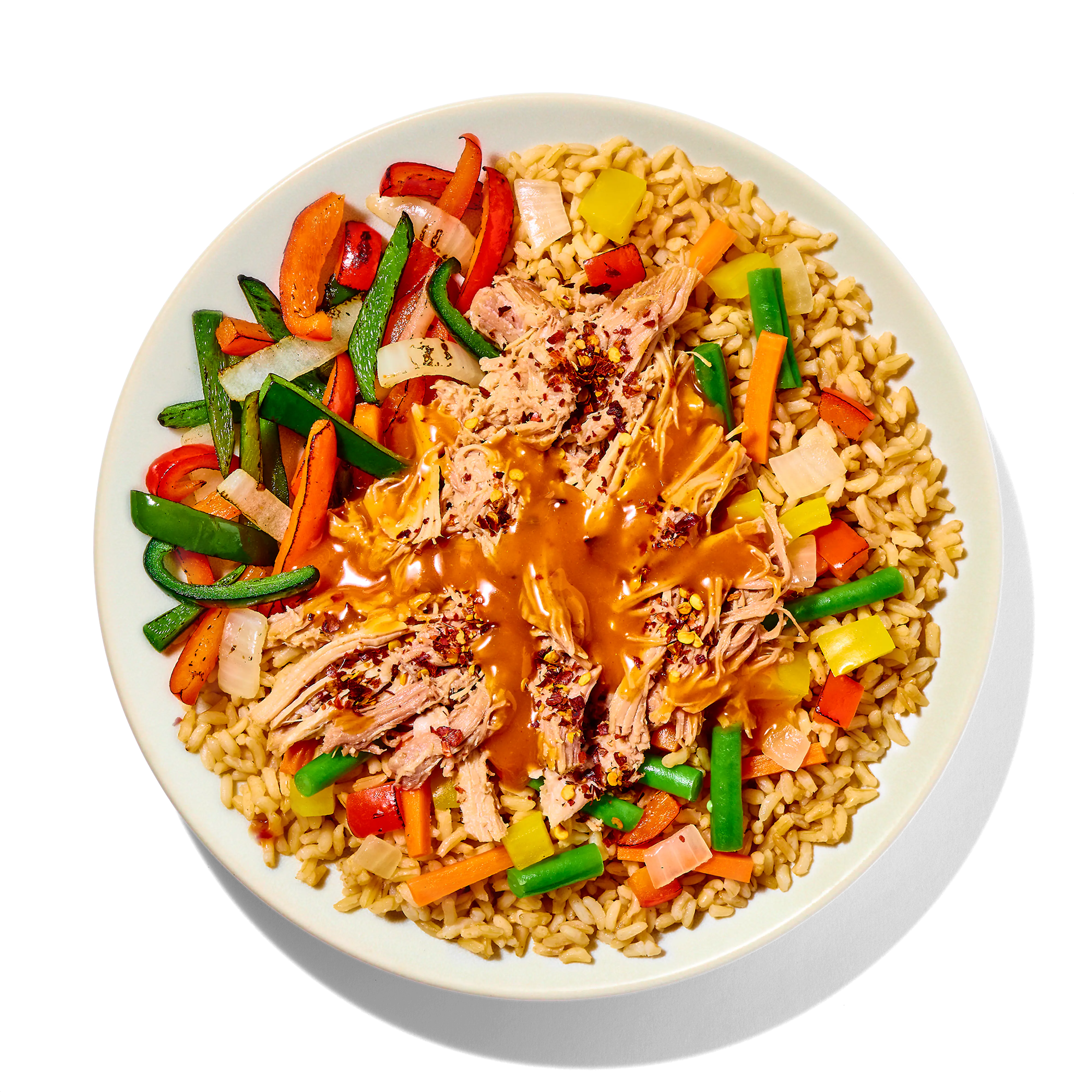 COOKED BROWN RICE (WATER, BROWN RICE), FULLY COOKED PULLED PORK CONTAINS UP TO 5% SOLUTION (WATER, SALT), VEGETABLE BLEND (BELL PEPPER, GREEN BEANS, YELLOW ONION, CARROTS), ONION AND PEPPER BLEND (ONIONS, RED BELL PEPPERS, POBLANO PEPPERS), ORANGE SAUCE (WATER, SUGAR, ORANGE JUICE CONCENTRATE, SOY SAUCE [WATER, WHEAT, SOYBEANS, SALT], SEASONED RICE VINEGAR [RICE VINEGAR, WATER, SUGAR, SALT], CORN STARCH, GARLIC, CHICKEN BASE [CHICKEN STOCK, SALT, NATURAL FLAVOR, CHICKEN FAT], SAUCIER [MODIFIED GUM ACACIA, MODIFIED TAPIOCA STARCH, XANTHAN GUM], SALT, RED CHILI PEPPER, GINGER), AROMATICS (OLIVE OIL, GARLIC, GREEN ONIONS, GINGER, YELLOW ONIONS, WATER, SALT, GUAR GUM, XANTHAN GUM), BUFFALO-STYLE SAUCE (CAYENNE PEPPER SAUCE [AGED RED CAYENNE PEPPERS, VINEGAR, SALT, NATURAL FLAVOR, GARLIC], VINEGAR, SALTED BUTTER [PASTEURIZED CREAM {MILK}, SALT], NATURAL FLAVOR [BUTTER], DEHYDRATED GARLIC, SUGAR, XANTHAN GUM, SPICES), CRUSHED RED PEPPERS.