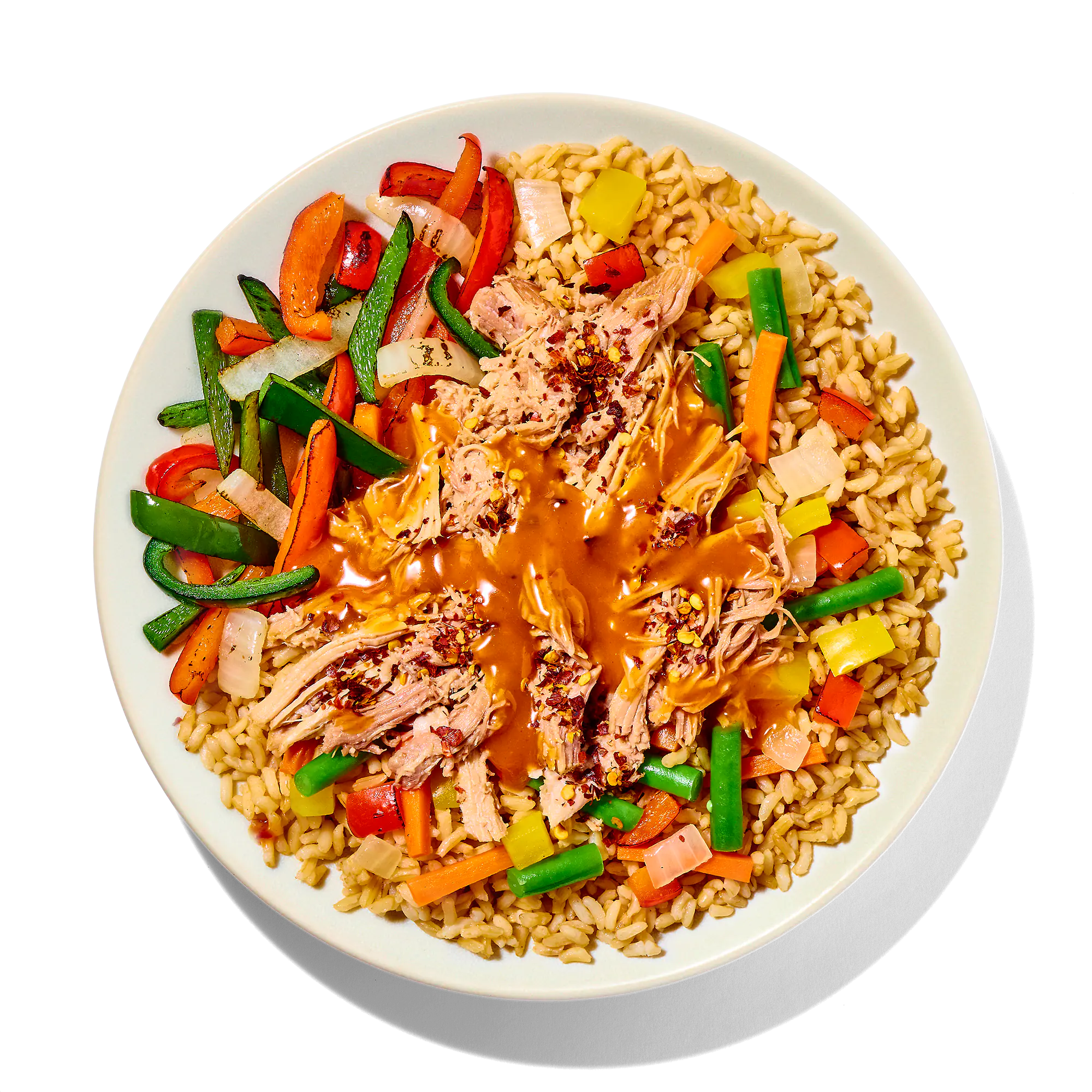 COOKED BROWN RICE (WATER, BROWN RICE), FULLY COOKED PULLED PORK CONTAINS UP TO 5% SOLUTION (WATER, SALT), VEGETABLE BLEND (BELL PEPPER, GREEN BEANS, YELLOW ONION, CARROTS), ONION AND PEPPER BLEND (ONIONS, RED BELL PEPPERS, POBLANO PEPPERS), ORANGE SAUCE (WATER, SUGAR, ORANGE JUICE CONCENTRATE, SOY SAUCE [WATER, WHEAT, SOYBEANS, SALT], SEASONED RICE VINEGAR [RICE VINEGAR, WATER, SUGAR, SALT], CORN STARCH, GARLIC, CHICKEN BASE [CHICKEN STOCK, SALT, NATURAL FLAVOR, CHICKEN FAT], SAUCIER [MODIFIED GUM ACACIA, MODIFIED TAPIOCA STARCH, XANTHAN GUM], SALT, RED CHILI PEPPER, GINGER), AROMATICS (OLIVE OIL, GARLIC, GREEN ONIONS, GINGER, YELLOW ONIONS, WATER, SALT, GUAR GUM, XANTHAN GUM), BUFFALO-STYLE SAUCE (CAYENNE PEPPER SAUCE [AGED RED CAYENNE PEPPERS, VINEGAR, SALT, NATURAL FLAVOR, GARLIC], VINEGAR, SALTED BUTTER [PASTEURIZED CREAM {MILK}, SALT], NATURAL FLAVOR [BUTTER], DEHYDRATED GARLIC, SUGAR, XANTHAN GUM, SPICES), CRUSHED RED PEPPERS.