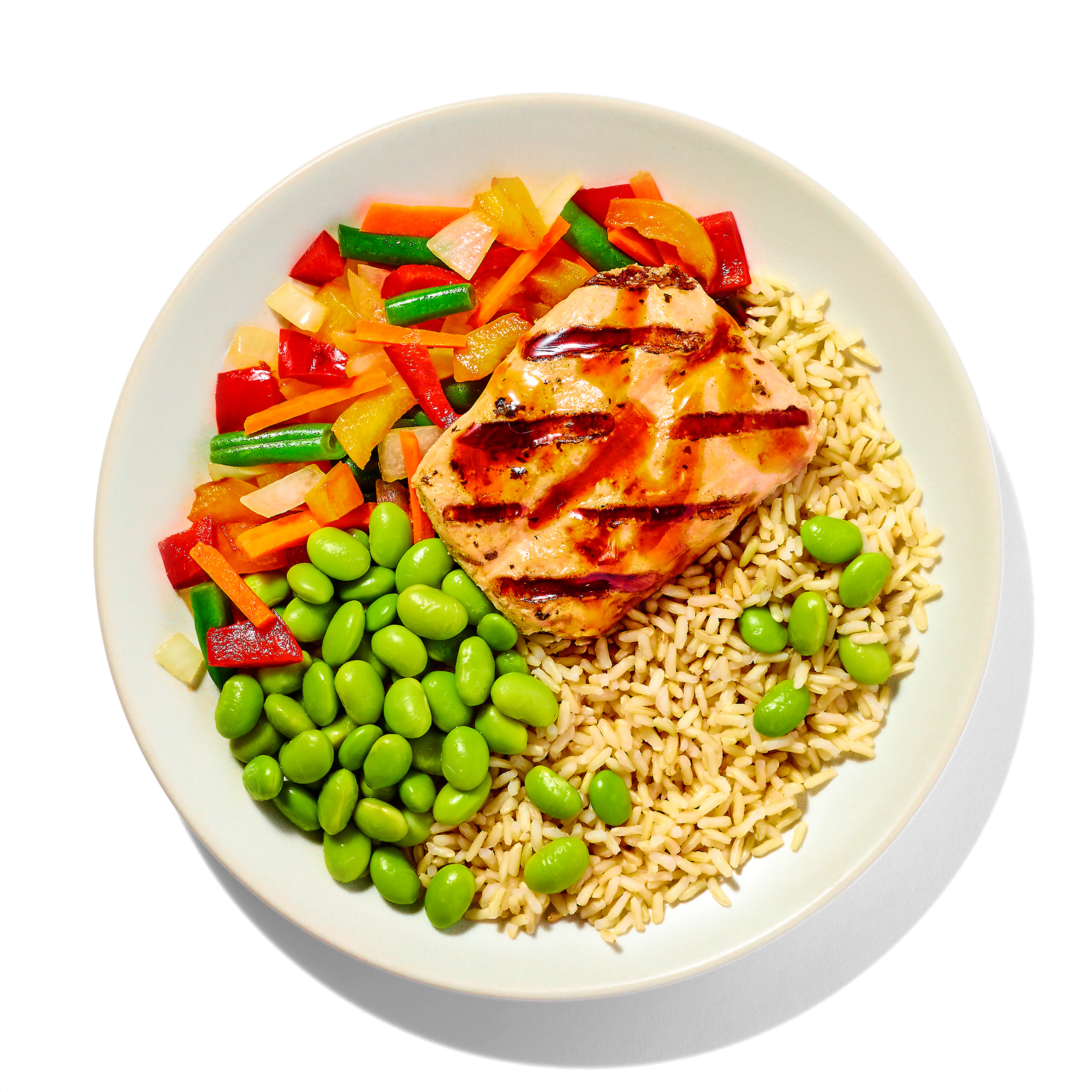 Cooked Brown Rice (Water, Brown Rice), Grilled Fully Cooked Salmon (Pink And/or Keta Salmon, Water, Contains 2% Or Less Of: Sea Salt, Sugar, Sodium Phosphates, Dehydrated Garlic And Onion, Spices, Paprika, Xanthan Gum, Natural Flavors, Spice Extractives), Edamame, Vegetable Blend (Bell Pepper, Green Beans, Yellow Onion, Carrots), Aromatics (Olive Oil, Garlic, Green Onions, Ginger, Yellow Onions, Water, Salt, Guar Gum, Xanthan Gum), Teriyaki Sauce (Sugar, Soy Sauce [Water, Wheat, Soybeans, Salt], Water, Modified Food Starch, Prune Concentrate Juice, Caramel Color, Salt, Yeast Extract).