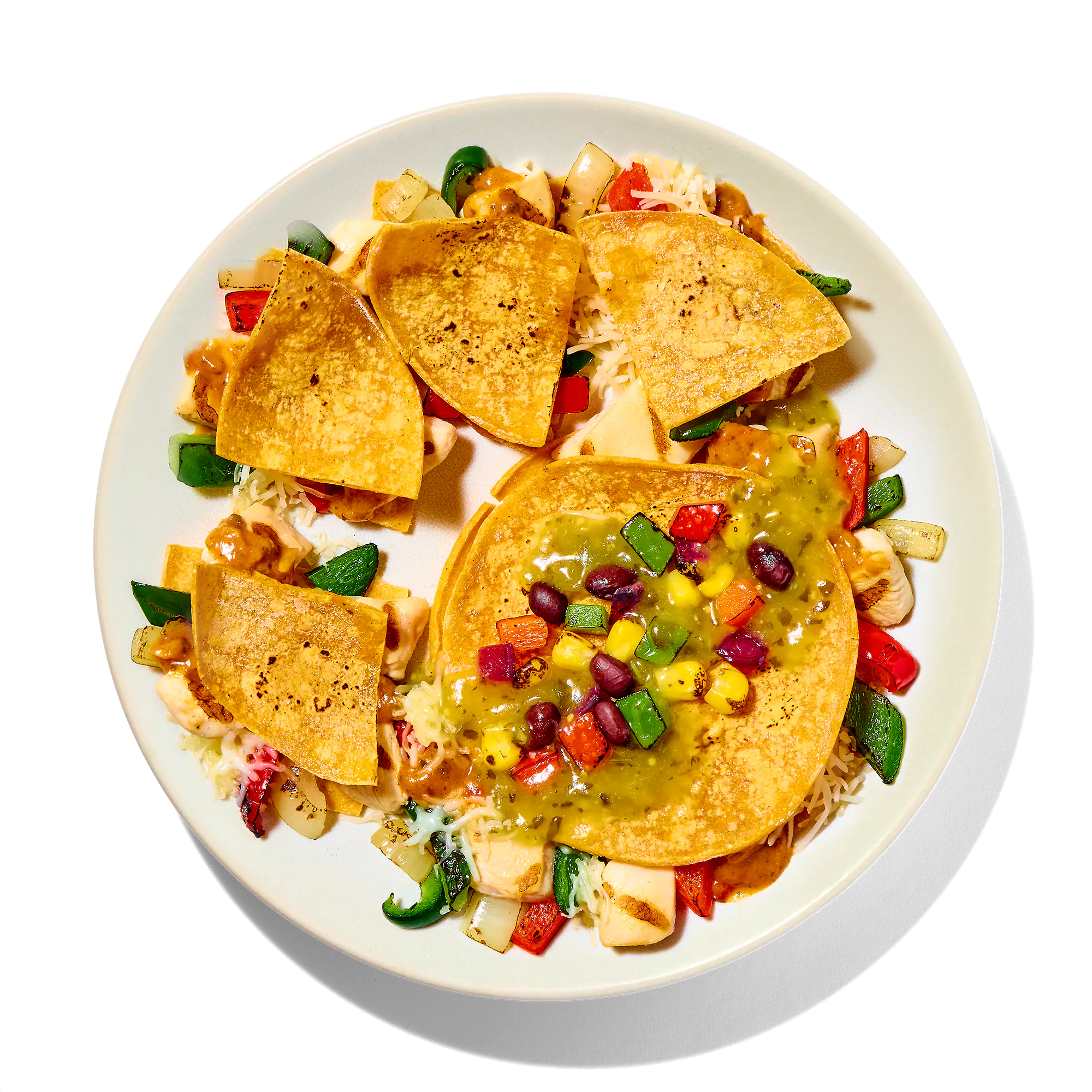 DICED CHICKEN BREAST MEAT WITH RIB MEAT (SKINLESS BONELESS CHICKEN BREAST MEAT WITH RIB MEAT, WATER, POTATO STARCH, VINEGAR, SEA SALT), ONION AND PEPPER BLEND (ONIONS, RED BELL PEPPERS, POBLANO PEPPERS), CORN TORTILLA (WATER, WHOLE WHITE CORN, YELLOW CORN MASA FLOUR, CONTAINS 2% OR LESS OF GUAR GUM, TRACE OF LIME), SHREDDED MONTEREY JACK CHEESE (MONTERY JACK CHEESE [PASTEURIZED MILK, CHEESE CULTURES, SALT, ENZYMES], POWDERED CELLULOSE [TO PREVENT CAKING]), TOMATILLO SAUCE (GROUND TOMATILLO [GREEN TOMATILLOS, SALT, CITRIC ACID], WATER, JALAPENO PEPPER, MODIFIED FOOD STARCH, CILANTRO, GREEN ONION, CHICKEN BASE [CHICKEN MEAT INCLUDING NATURAL CHICKEN JUICES, SEA SALT, CHICKEN FAT, VEGETABLE EXTRACT {POTATO, CARROT, ONION}, YEAST EXTRACT, NATURAL FLAVORS, TURMERIC], SALT, DEHYDRATED GARLIC, DEHYDRATED ONION, SPICES), FIRE ROASTED SOUTHWEST STYLE CORN BLEND (CORN, RED BELL PEPPERS, POBLANO PEPPERS, RED ONIONS, BLACK BEANS), CREAMY HATCH CHILE SAUCE (WATER, HEAVY CREAM, HATCH CHILES [HATCH CHILE PEPPERS, CITRIC ACID], MODIFIED FOOD STARCH, SALT, BUTTER, SODIUM CITRATE, SEASONINGS [WHEY, BUTTER OIL, CORN SYRUP SOLIDS, SALT, GUAR GUM, ANNATTO {FOR COLOR}, TURMERIC {FOR COLOR}], SUGAR, CILANTRO, DEHYDRATED GARLIC, DEHYDRATED ONION, CUMIN, SMOKED PAPRIKA), AROMATICS (ONIONS, GARLIC, RED BELL PEPPERS, OLIVE OIL, CILANTRO, SPICE, WATER, TOMATO PASTE, PAPRIKA [COLOR], CONTAINS 2% OR LESS OF BUTTER [SWEET CREAM, LACTIC ACID], SALT, CITRIC ACID, GUAR GUM, XANTHAN GUM).