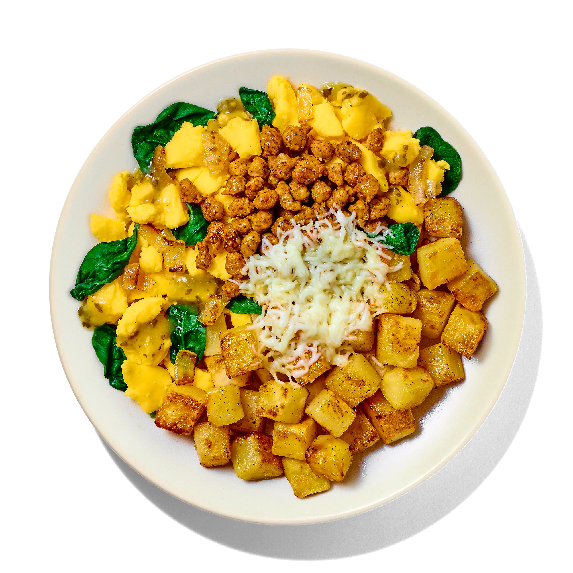 GOLD POTATOES, SCRAMBLED EGG WHITES (EGG WHITES, WHOLE MILK, CORN STARCH, SEA SALT, ANNATTO COLOR, WHITE PEPPER), FULLY COOKED CHICKEN BREAKFAST SAUSAGE CRUMBLES (CHICKEN BREAST WITH RIB MEAT, SALT, SPICES, SUGAR, NATURAL FLAVOR, DEHYDRATED GARLIC), SHREDDED MONTEREY JACK CHEESE (MONTERY JACK CHEESE [PASTEURIZED MILK, CHEESE CULTURES, SALT, ENZYMES], POWDERED CELLULOSE [TO PREVENT CAKING]), SPINACH, YELLOW ONION, TOMATILLO SAUCE (GROUND TOMATILLO [GREEN TOMATILLOS, SALT, CITRIC ACID], WATER, JALAPENO PEPPER, MODIFIED FOOD STARCH, CILANTRO, GREEN ONION, CHICKEN BASE [CHICKEN MEAT INCLUDING NATURAL CHICKEN JUICES, SEA SALT, CHICKEN FAT, VEGETABLE EXTRACT {POTATO, CARROT, ONION}, YEAST EXTRACT, NATURAL FLAVORS, TURMERIC], SALT, DEHYDRATED GARLIC, DEHYDRATED ONION, SPICES).