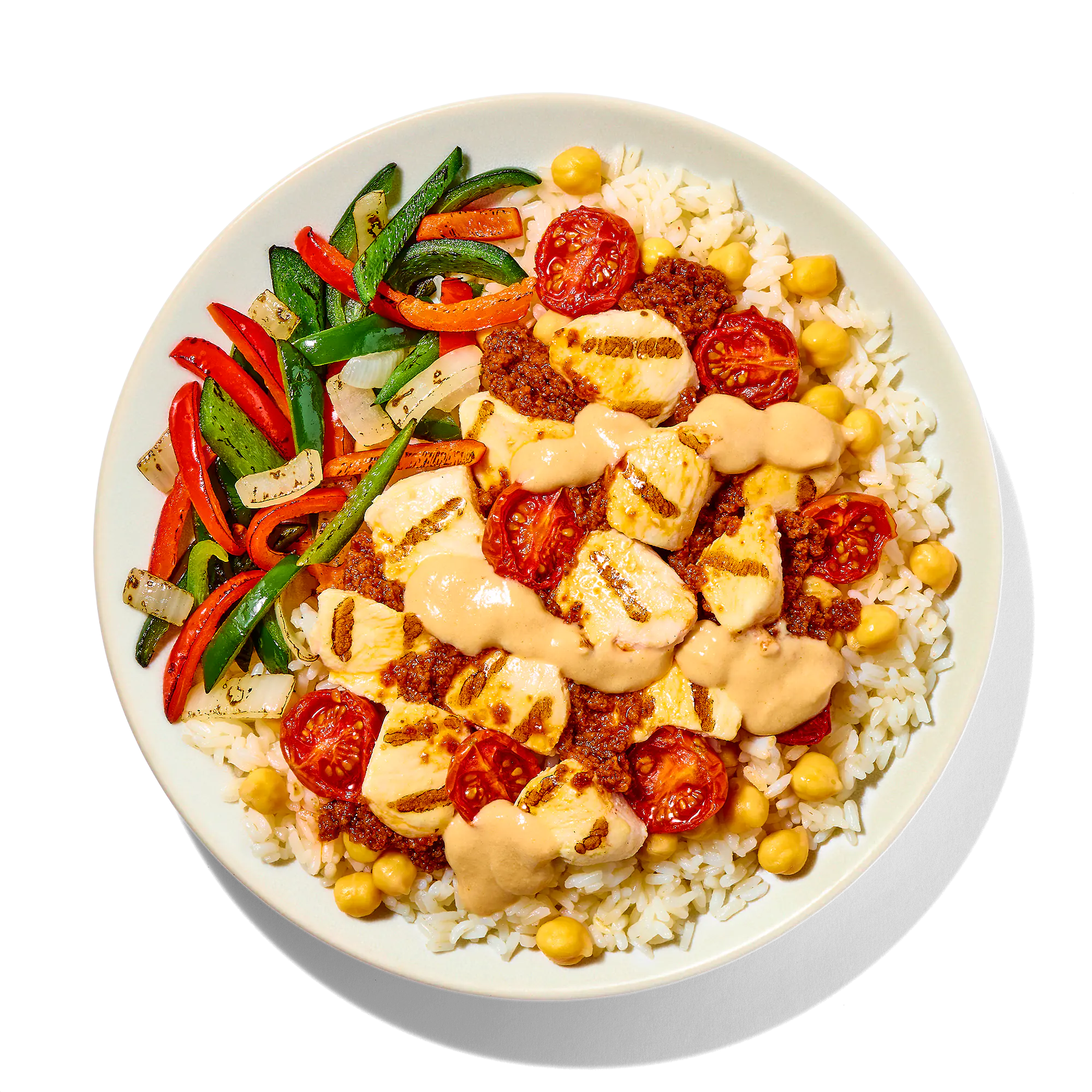DICED CHICKEN BREAST MEAT WITH RIB MEAT (SKINLESS BONELESS CHICKEN BREAST MEAT WITH RIB MEAT, WATER, POTATO STARCH, VINEGAR, SEA SALT), COOKED LONG GRAIN WHITE RICE (WATER, WHITE RICE), COOKED CHICKPEAS (CHICKPEAS, WATER), ONION AND PEPPER BLEND (ONIONS, RED BELL PEPPERS, POBLANO PEPPERS), TOMATO PESTO (WATER, POMACE OLIVE OIL, DRIED TOMATOES, PARMESAN CHEESE [PASTEURIZED PART-SKIM COWS’ MILK, CHEESE CULTURES, SALT, ENZYMES], ONIONS, BASIL, DEHYDRATED GARLIC, SALT, SPICES, XANTHAN GUM), GARLIC TAHINI SAUCE (WATER, GROUND SESAME SEEDS, OLIVE OIL, GUM ARABIC, FOOD STARCH - MODIFIED, GARLIC, SUGAR, SALT, LEMON JUICE CONCENTRATE, SMOKED PAPRIKA), ROASTED TOMATOES.